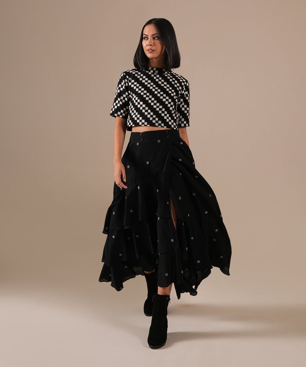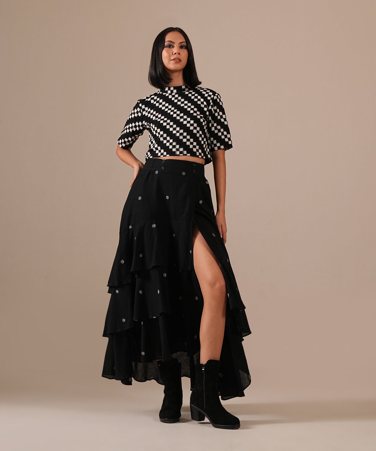 An exquisite amalgamation of handwoven Ikat blouse (stand collar, back zipper) and a layered Jamdani wrap skirt with a soft ruffled hem. A celebration of textile artistry that is striking yet timeless.