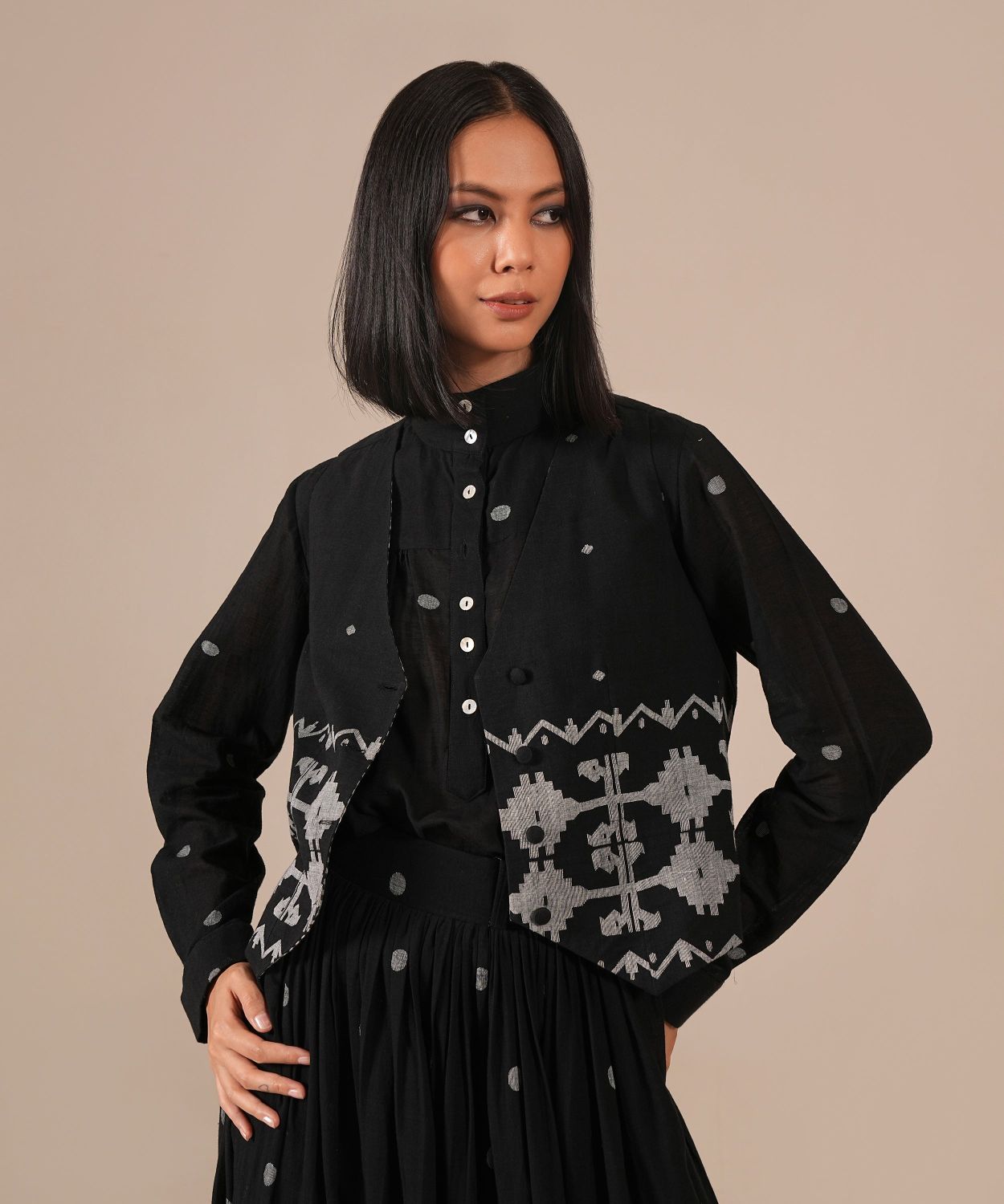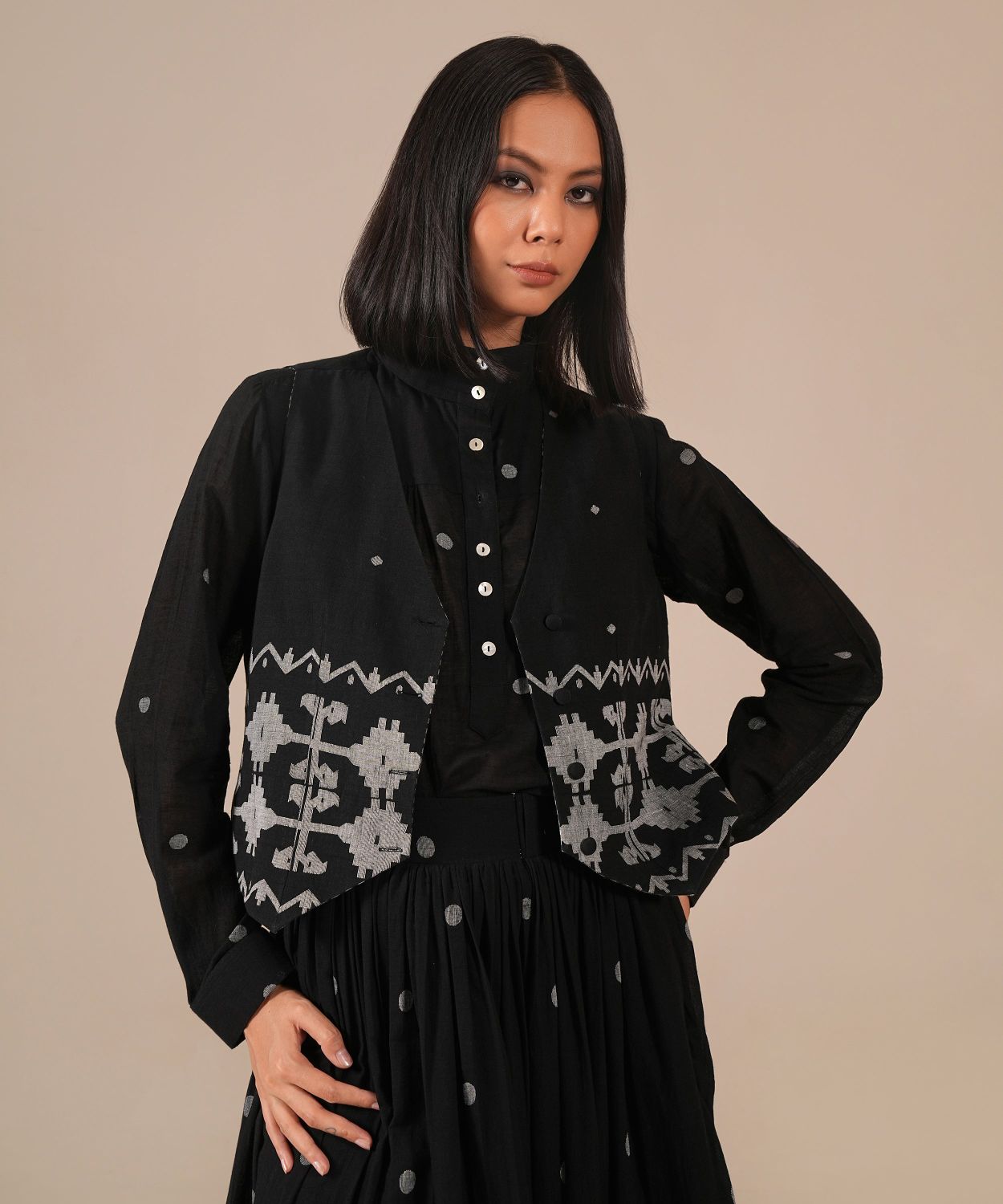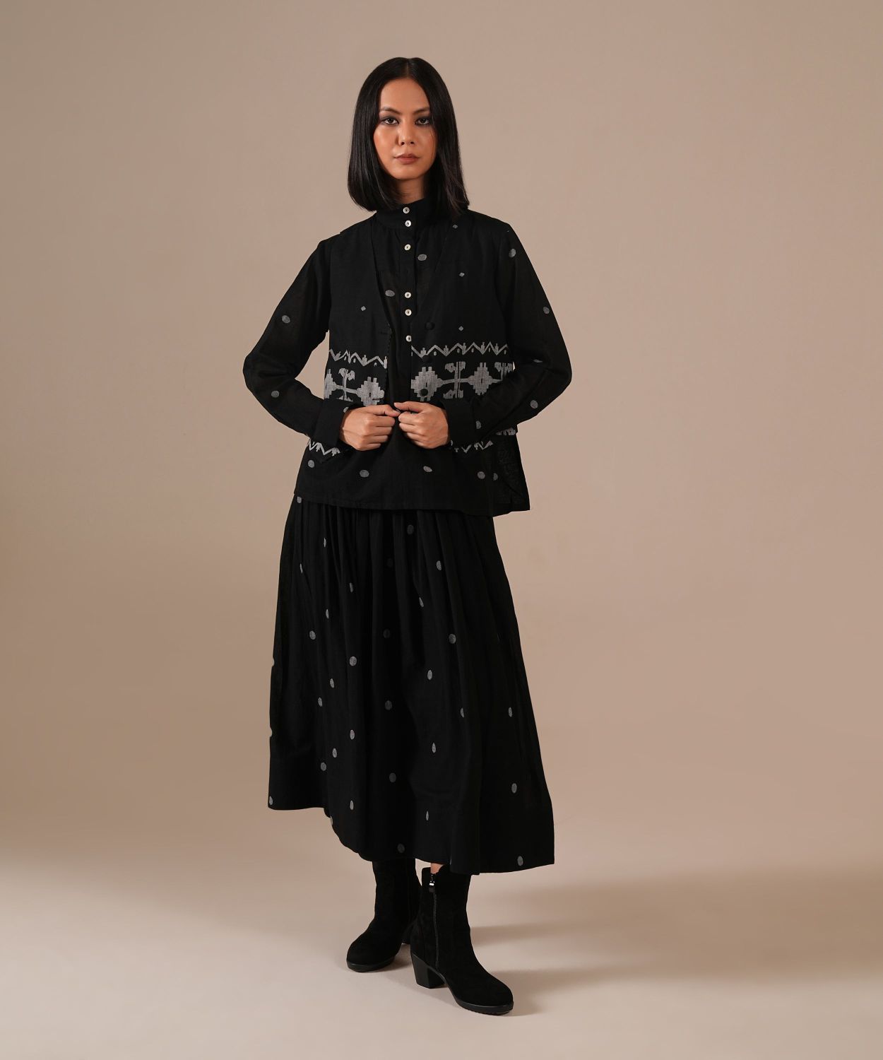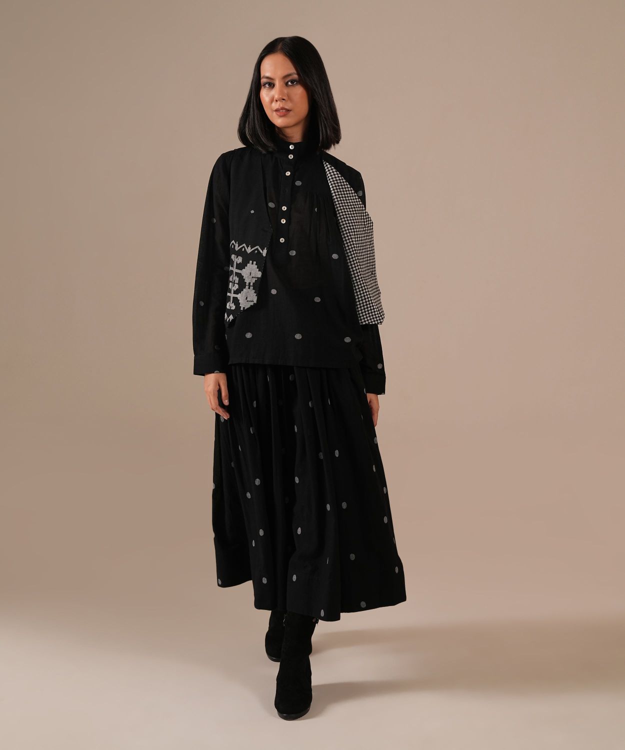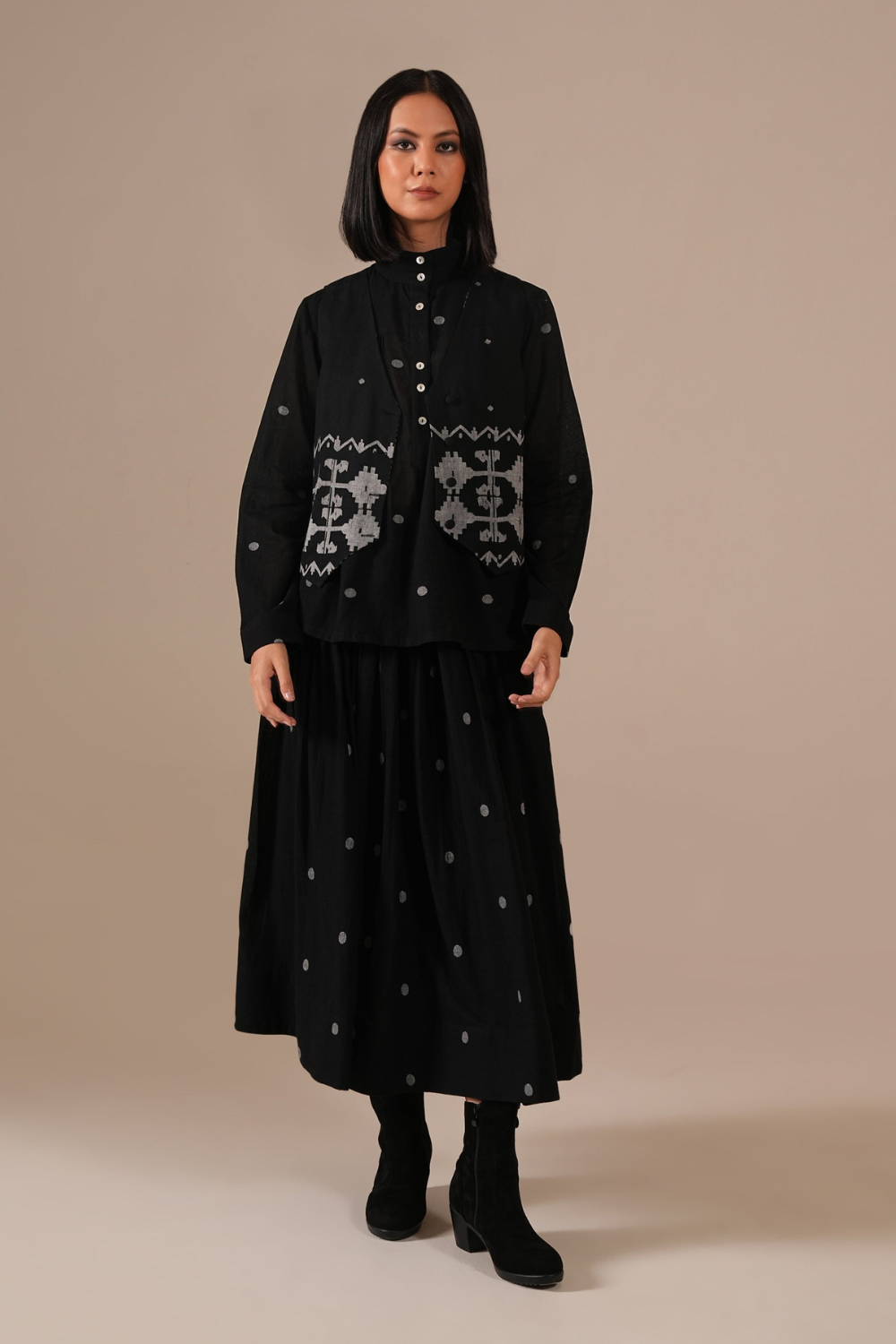 A handcrafted three-piece ensemble with a gathered skirt (side pockets), co-ord high-collared top and a waistcoat with contrast lining. Fully lined skirt and waistcoat for refined everyday elegance.