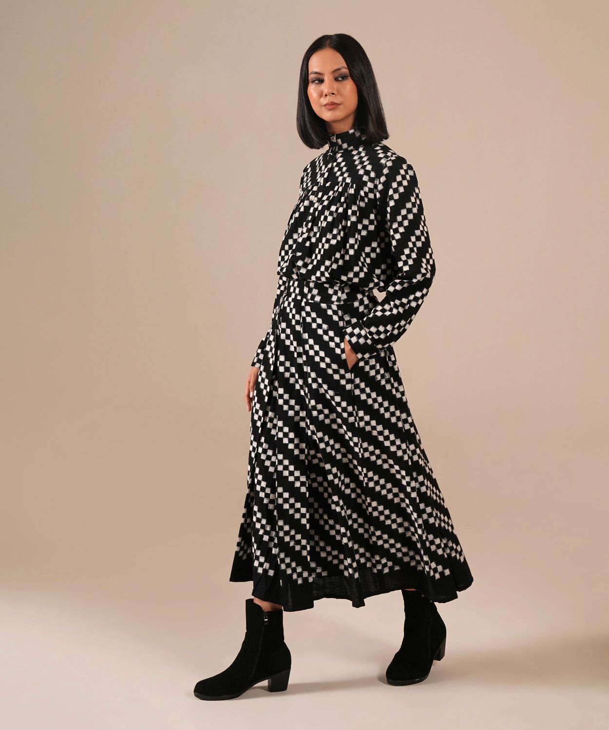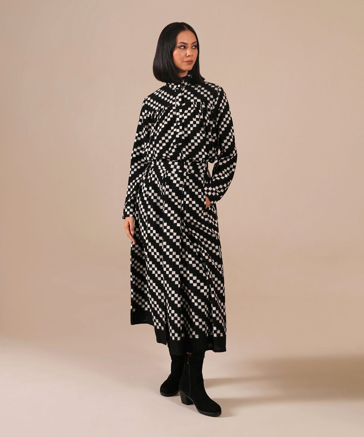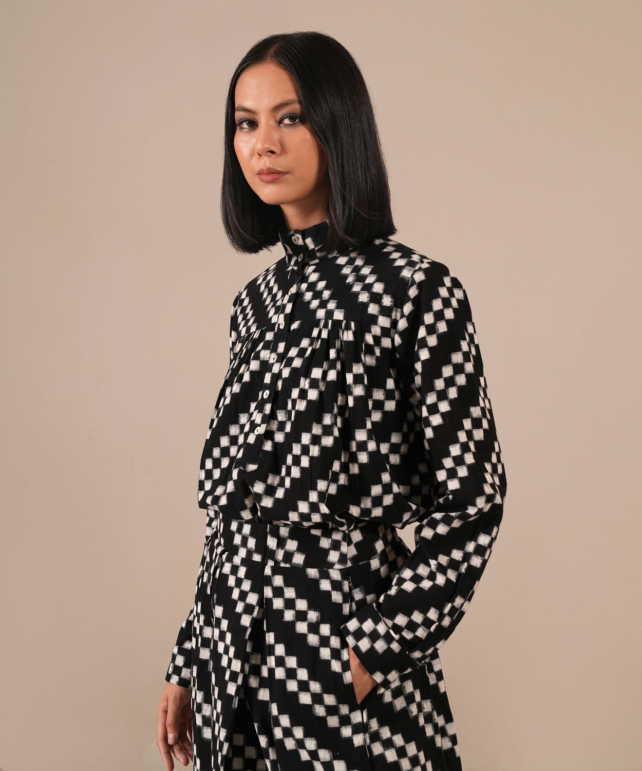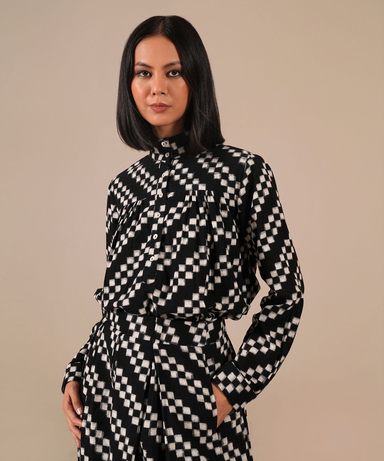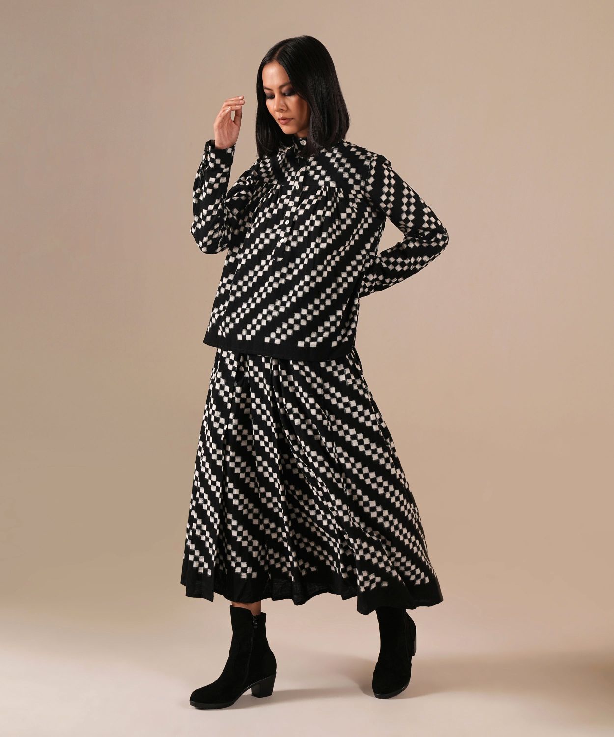A handcrafted Ikat ensemble featuring a gathered skirt with side pockets and a co-ord high-collared top. Fully lined skirt crafted by Indian artisans.