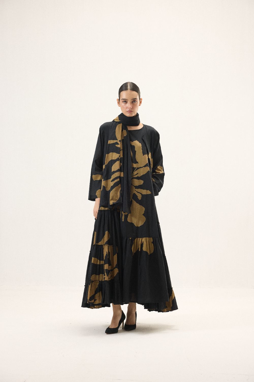 Crafted in soft cotton mul, this abaya set features bold abstract botanical motifs in earthy brown over black base across a flowy silhouette. Gathered panels at the bottom add gentle volume, while side pockets bring practical ease. Paired with a matching inner dress and scarf, it is an effortlessly graceful ensemble, quietly striking, comfortable, and timeless.