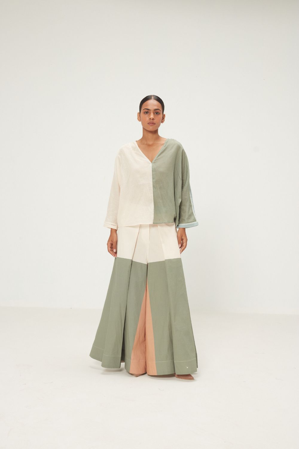 This co-ord set in color-block panels in soft earthy pastel tones, evoking an organic, earthy rhythm. Made in soft mul compose of a V-neck flowy top paired with a wide leg pants with box pleat in front and subtle pockets. Designed for days when comfort meets quiet elegance.