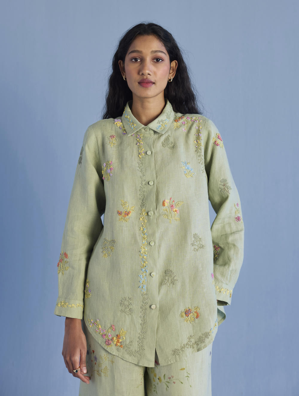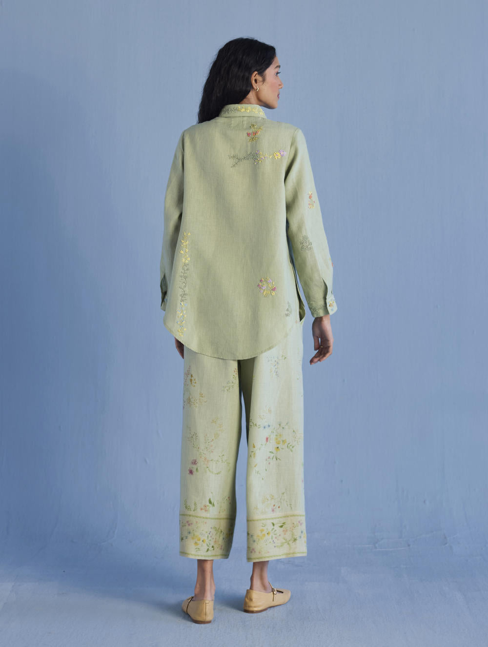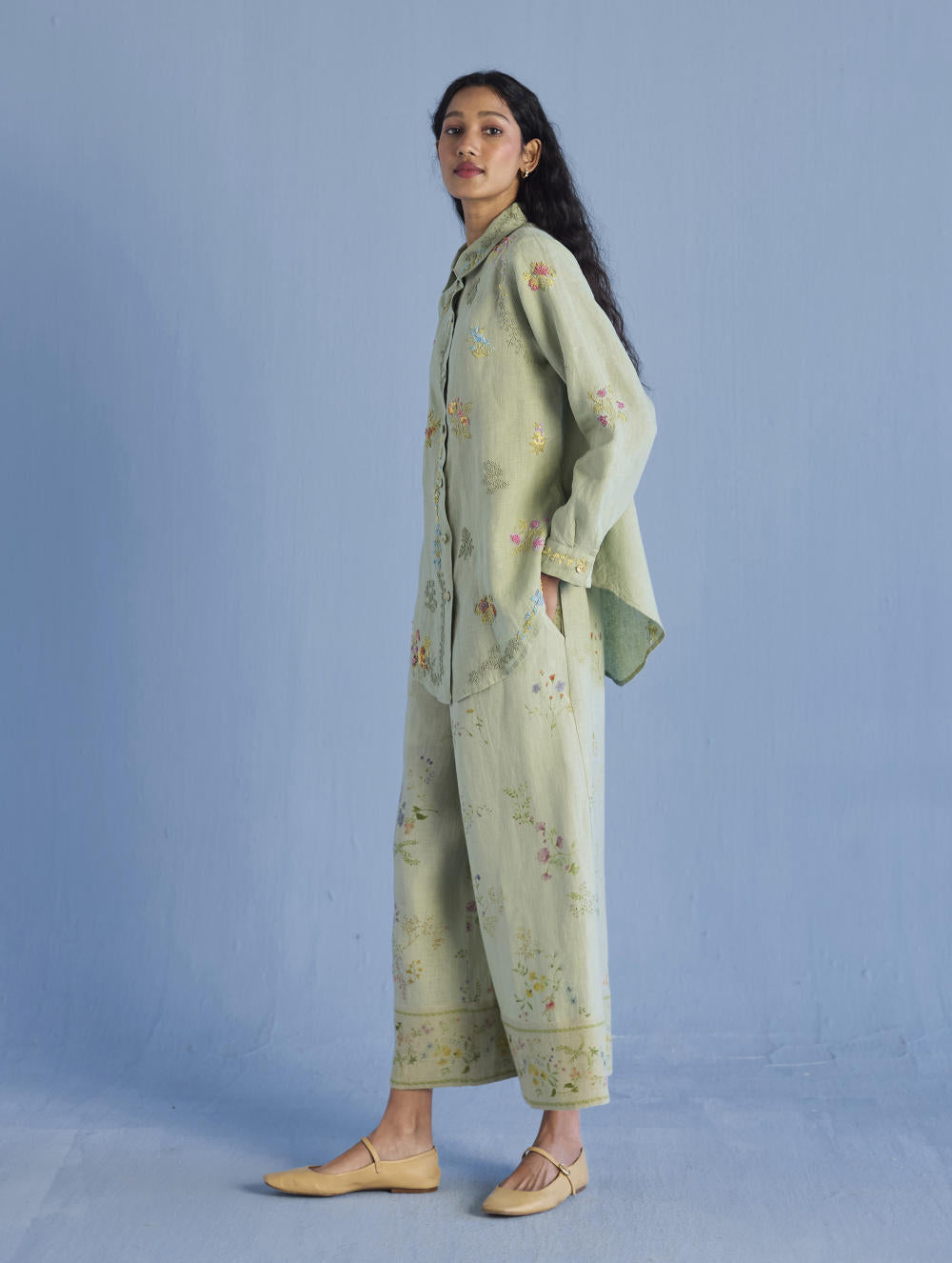 Top - Our favourite statement shirt crafted in our soft signature yarn-dyed linen is meticulously hand-embroidered with delicate, yet textural, floral motifs in mixed materials using multi-colour threads and beads. The shirt is finished with a long side slit detail and floral printed linen buttons.