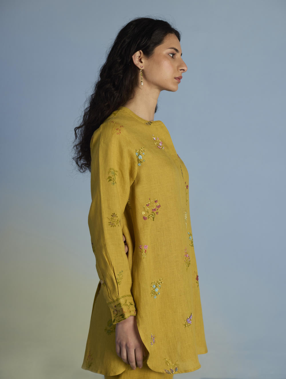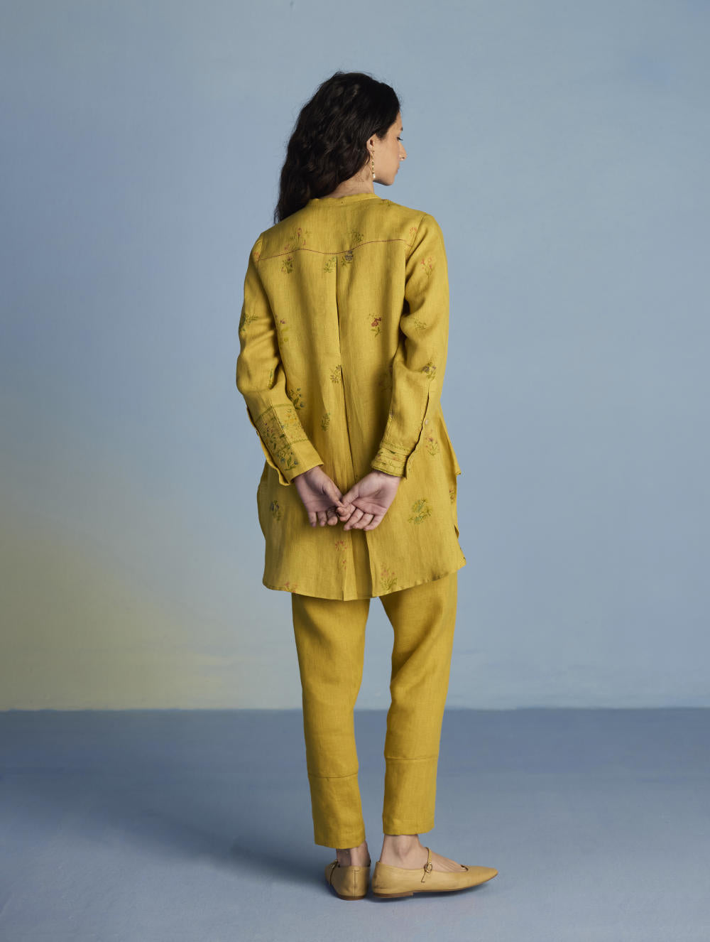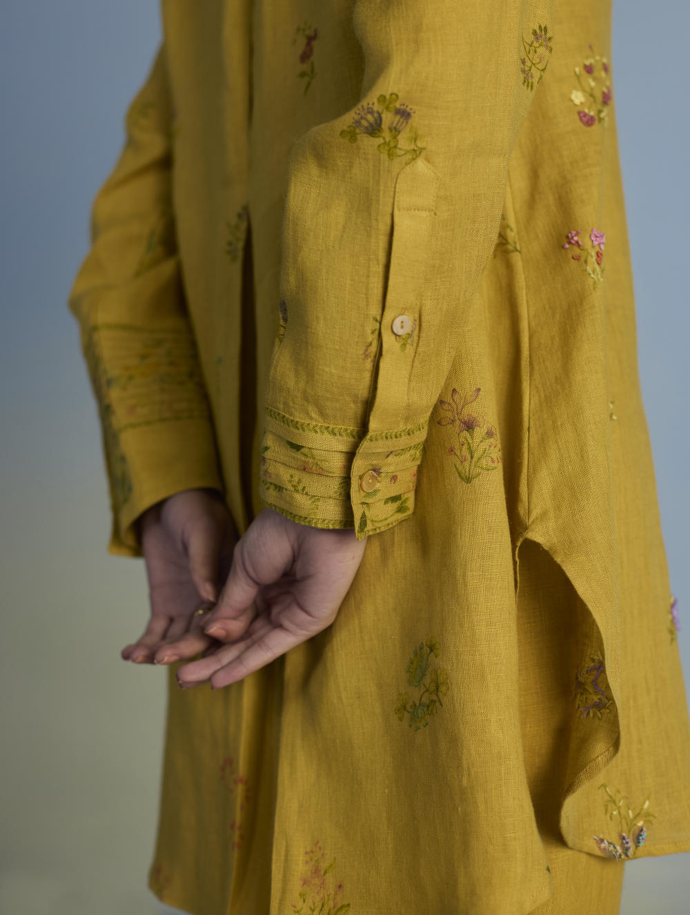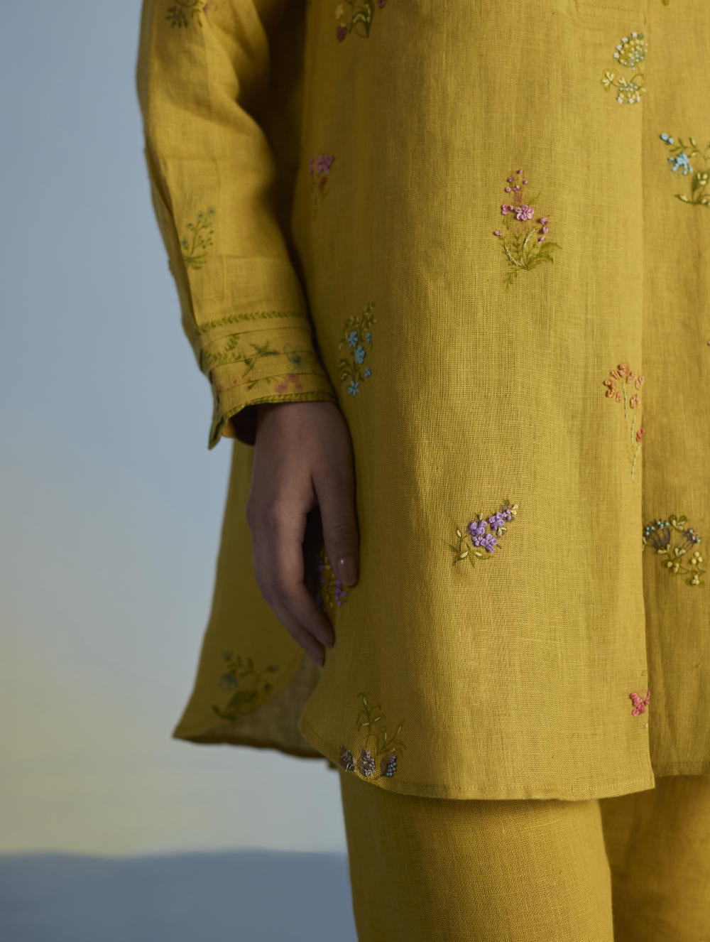 Kurta - A statement short kurta crafted from our signature soft yarn-dyed linen featuring a detailed hand-painted floral print intricately hand-embroidered with beads, zardozi thread work and french knots. The kurta has a concealed placket, a stylized pleat at the back and printed border with pintucks detailing on the sleeves.