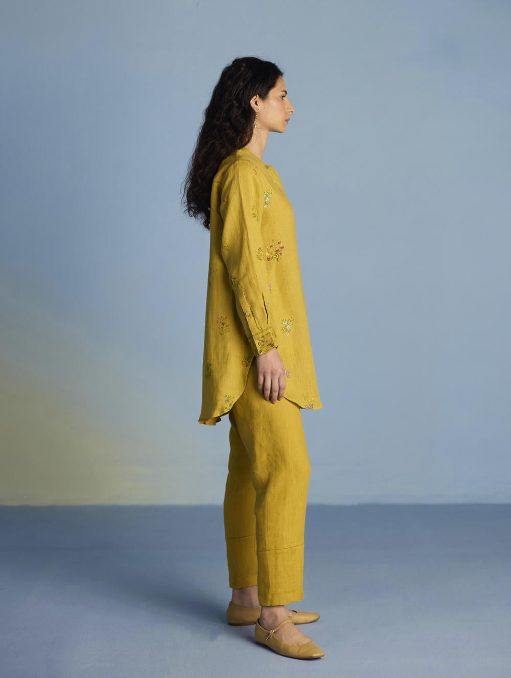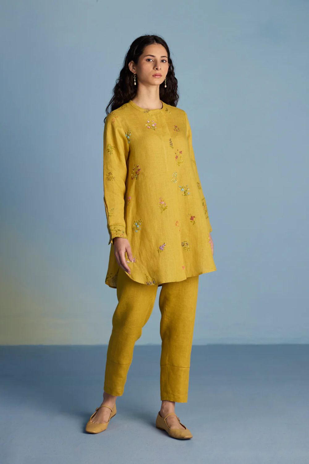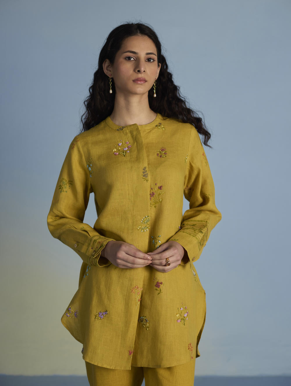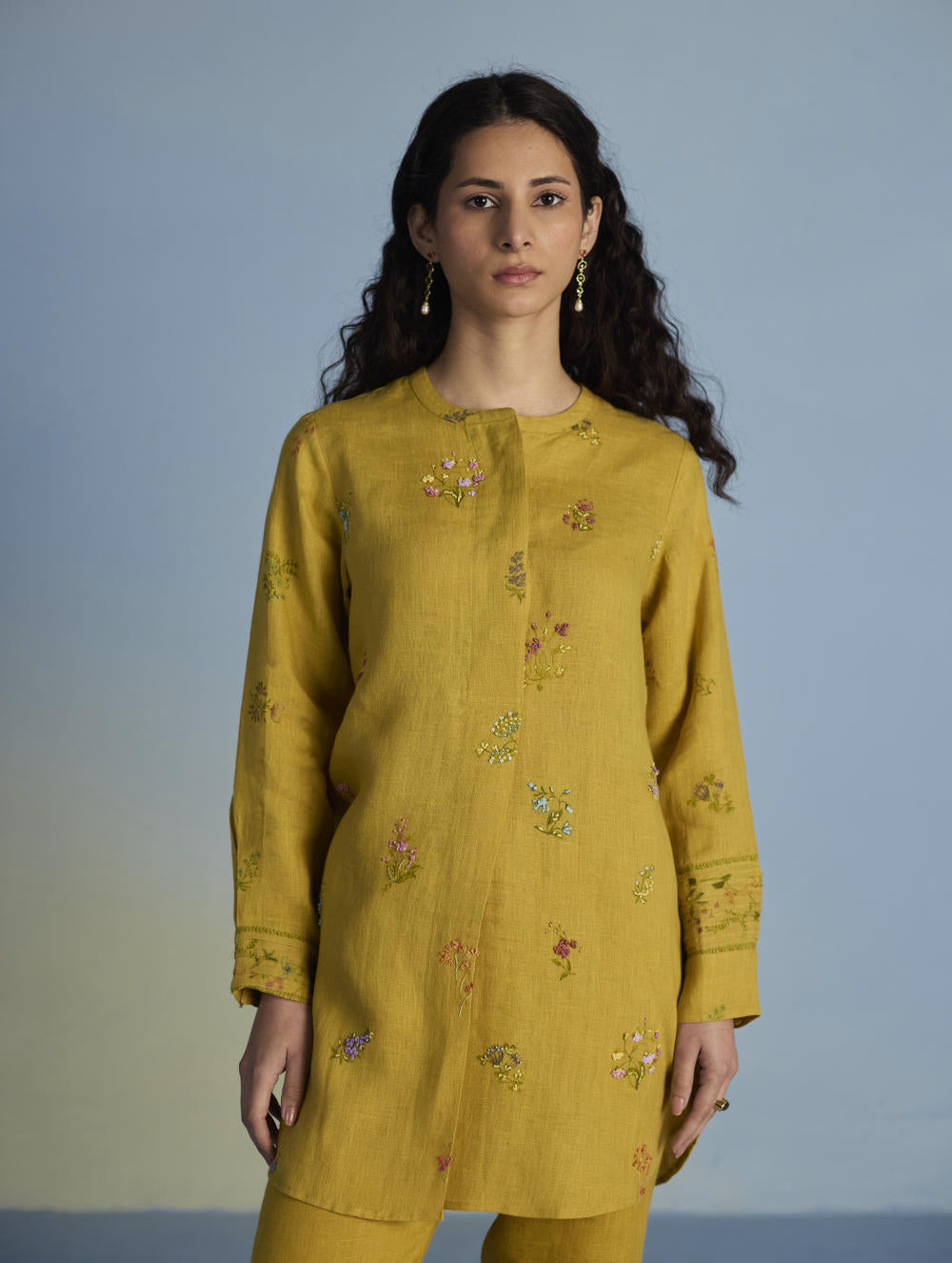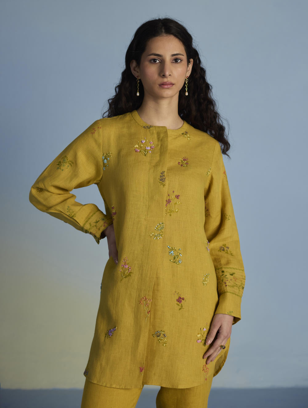 Kurta - A statement short kurta crafted from our signature soft yarn-dyed linen featuring a detailed hand-painted floral print intricately hand-embroidered with beads, zardozi thread work and french knots. The kurta has a concealed placket, a stylized pleat at the back and printed border with pintucks detailing on the sleeves.