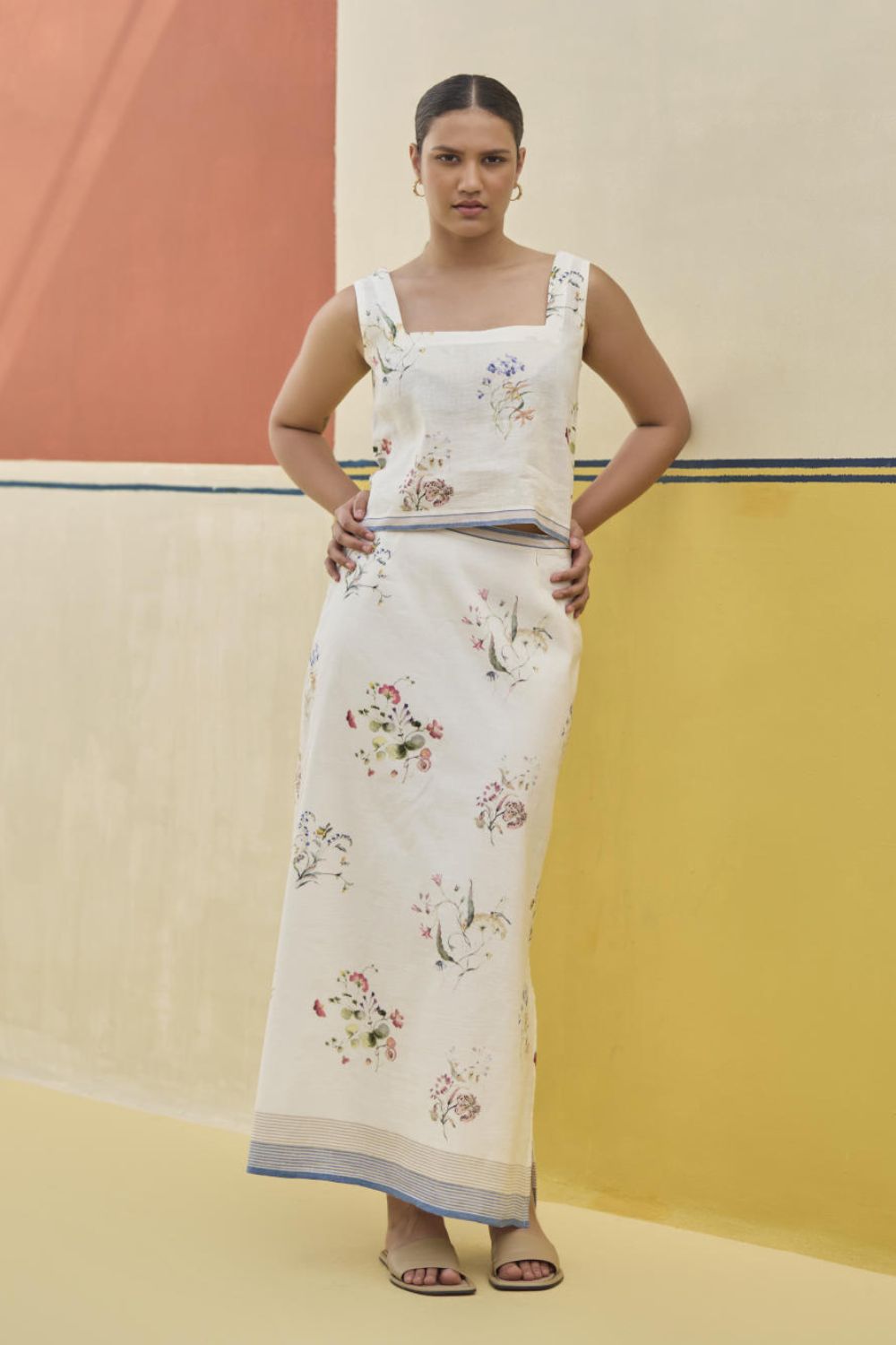 Skirt- An A-line skirt thoughtfully handcrafted from handloom linen cotton printed with hand-illustrated watercolour floral motifs. The Leena has a handwoven stripe border at the hemline and waistband and a side slit and zipper for ease-of-wear. Top-A sleeveless crop top in our bespoke soft handloom linen cotton with a handwoven stripe border. The top is printed with a hand-illustrated soft watercolour print. Pairs beautifully with our tapered pants or a classic skirt.