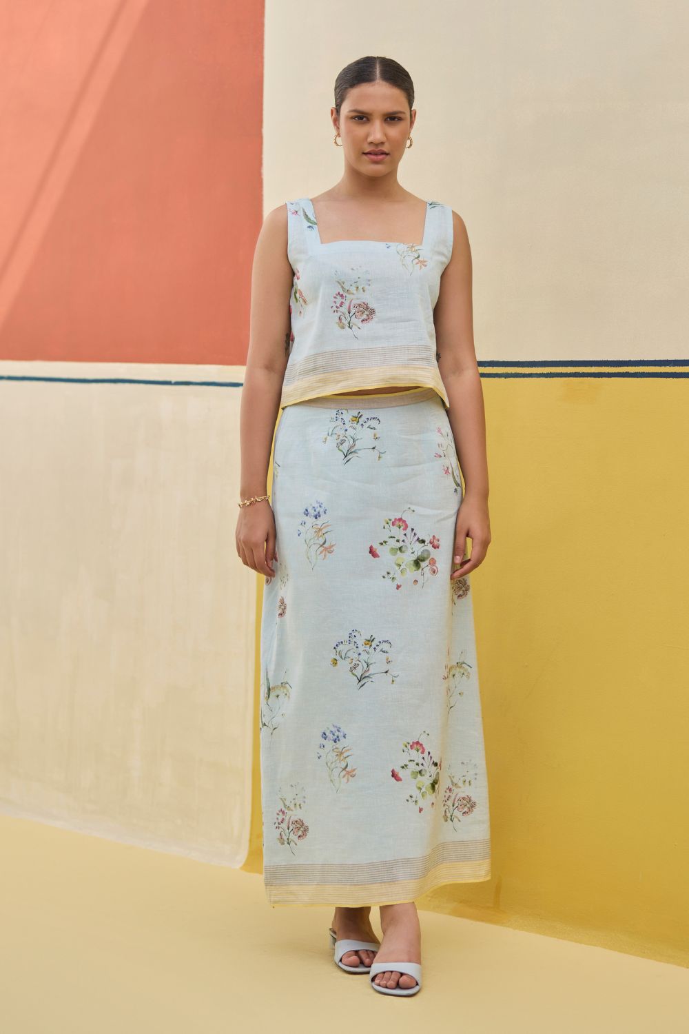 Skirt- An A-line skirt thoughtfully handcrafted from handloom linen cotton printed with hand-illustrated watercolour floral motifs. The Leena has a handwoven stripe border at the hemline and waistband and a side slit and zipper for ease-of-wear. Top-A sleeveless crop top in our bespoke soft handloom linen cotton with a handwoven stripe border. The top is printed with a hand-illustrated soft watercolour print. Pairs beautifully with our tapered pants or a classic skirt.
