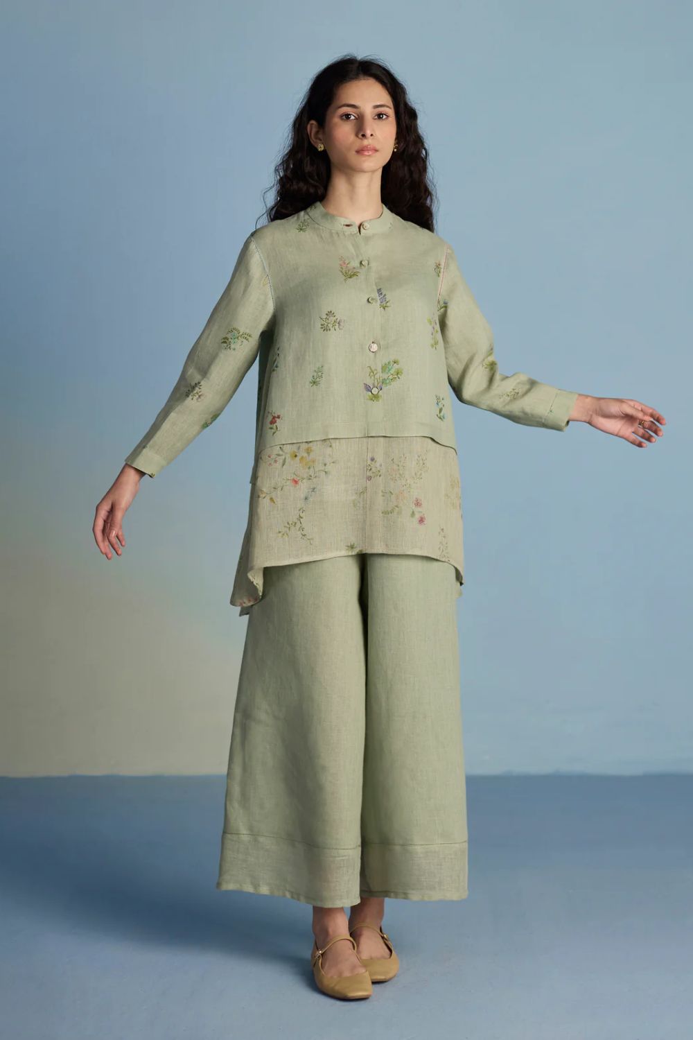 Top - A statement A-line shirt crafted from our signature soft pure linen and soft flowing sheer linen. Featuring two hand-illustrated delicate multi-colour floral prints - a jaal print and a buta print, the shirt is finished with unique mixed material buttons including linen fabric buttons and a crochet button, colourful thread buttonholes and faggoting stitch detailing. Leina is perfect for evening gatherings and social events, offering both comfort and versatility.