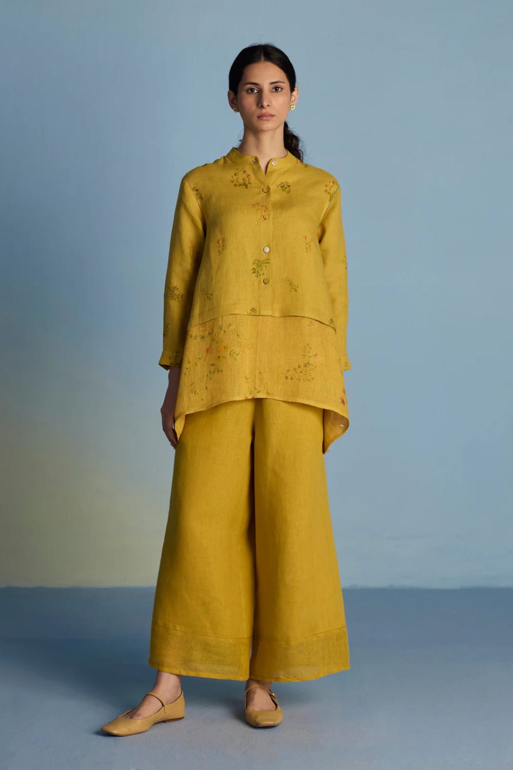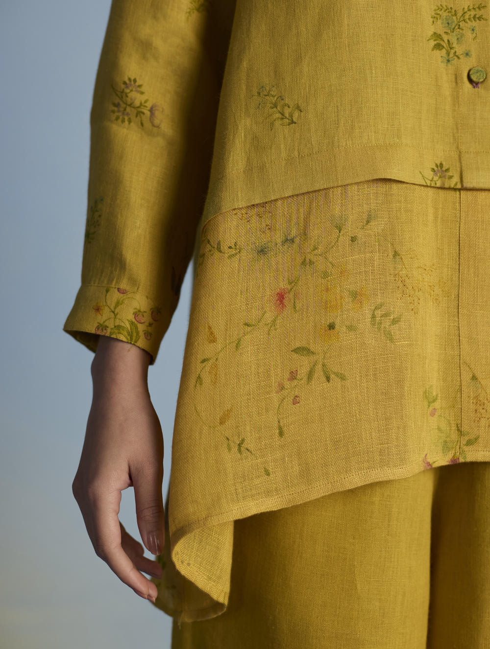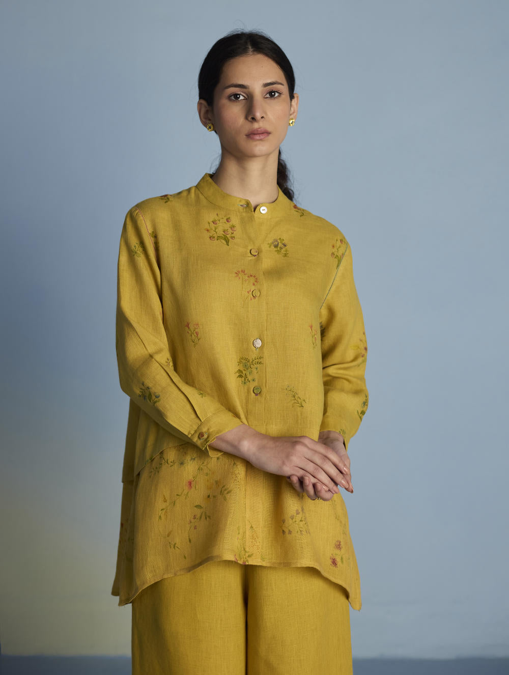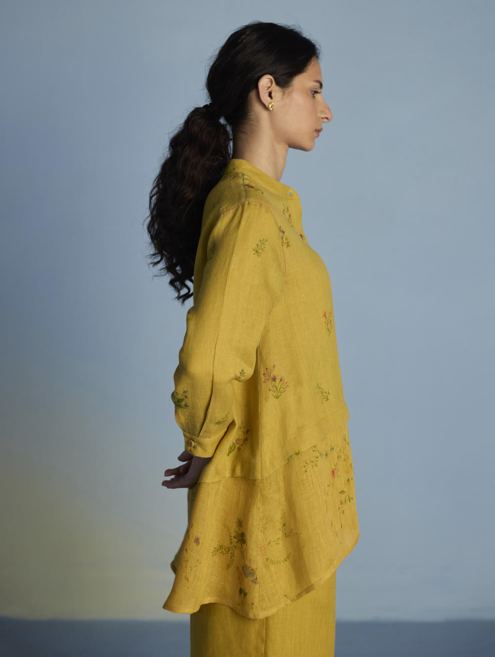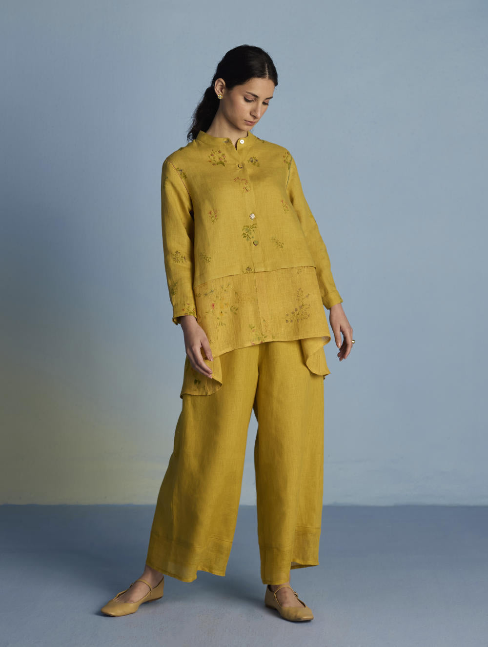Top - A statement A-line shirt crafted from our signature soft pure linen and soft flowing sheer linen. Featuring two hand-illustrated delicate multi-colour floral prints - a jaal print and a buta print, the shirt is finished with unique mixed material buttons including linen fabric buttons and a crochet button, colourful thread buttonholes and faggoting stitch detailing. Leina is perfect for evening gatherings and social events, offering both comfort and versatility.