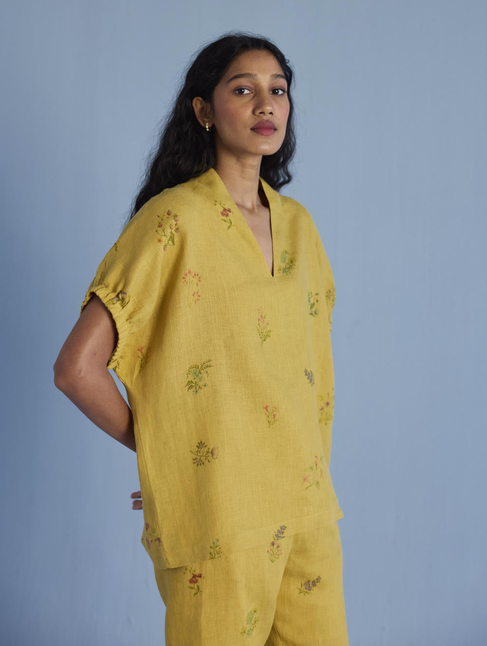 Top -A chic v- neck elasticated sleeve top crafted from our soft yarn-dyed linen with a hand- illustrated and hand-painted multicoloured floral print enhanced with coloured fagotting stitch detailing the back. Perfect for balmy summer days and relaxed get-togethers.