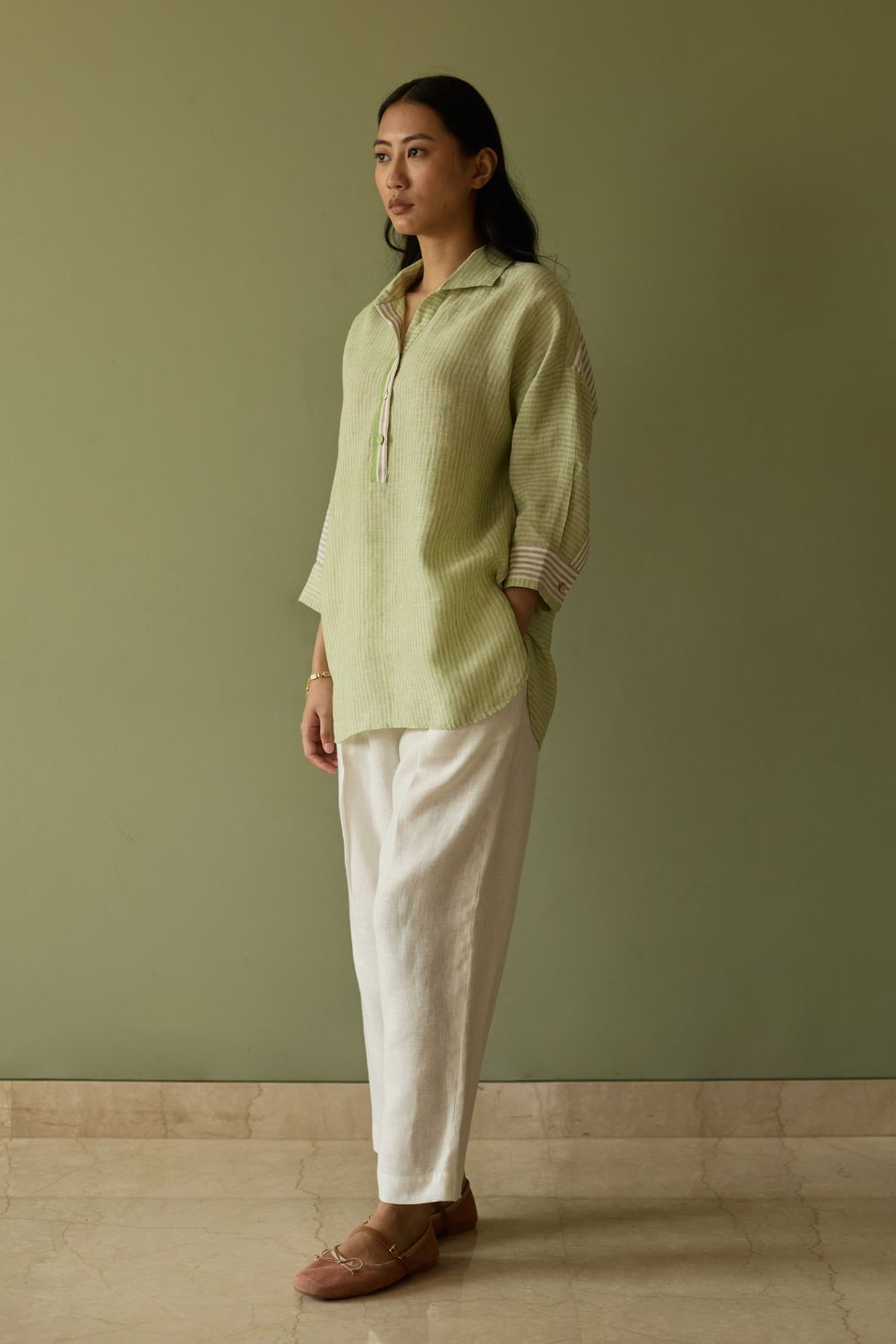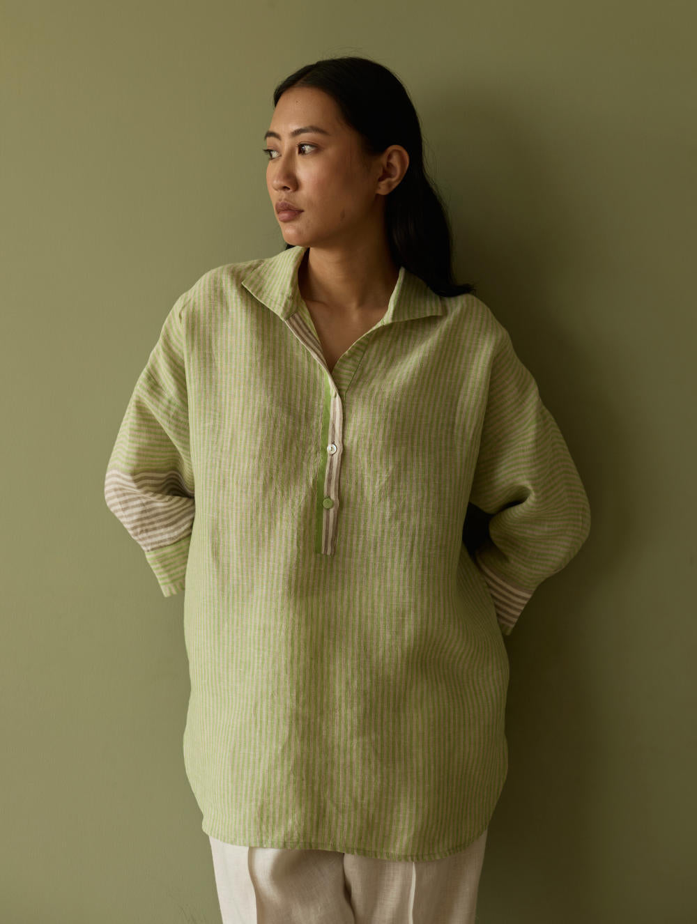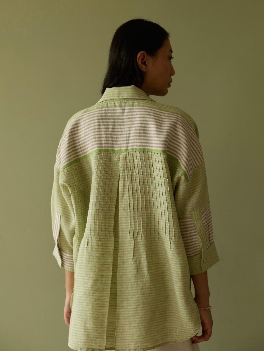 Shirt - Our favourite relaxed-fit shirt is designed in our bespoke handwoven yarn-dyed soft stripe linen in tones of green, grey and ivory. The weave is designed as a delicate, and unique multicolour stripe handwoven linen, known for its breathable texture and gentle drape. The relaxed collar and drop shoulders create an easy, effortless silhouette, while contrasting ivory woven borders on the placket, cuff and 3/4th sleeves add a subtle, shaped edge.The Risa is finished with intricate pintucks at the back and linen fabric and mother-of-pearl buttons.