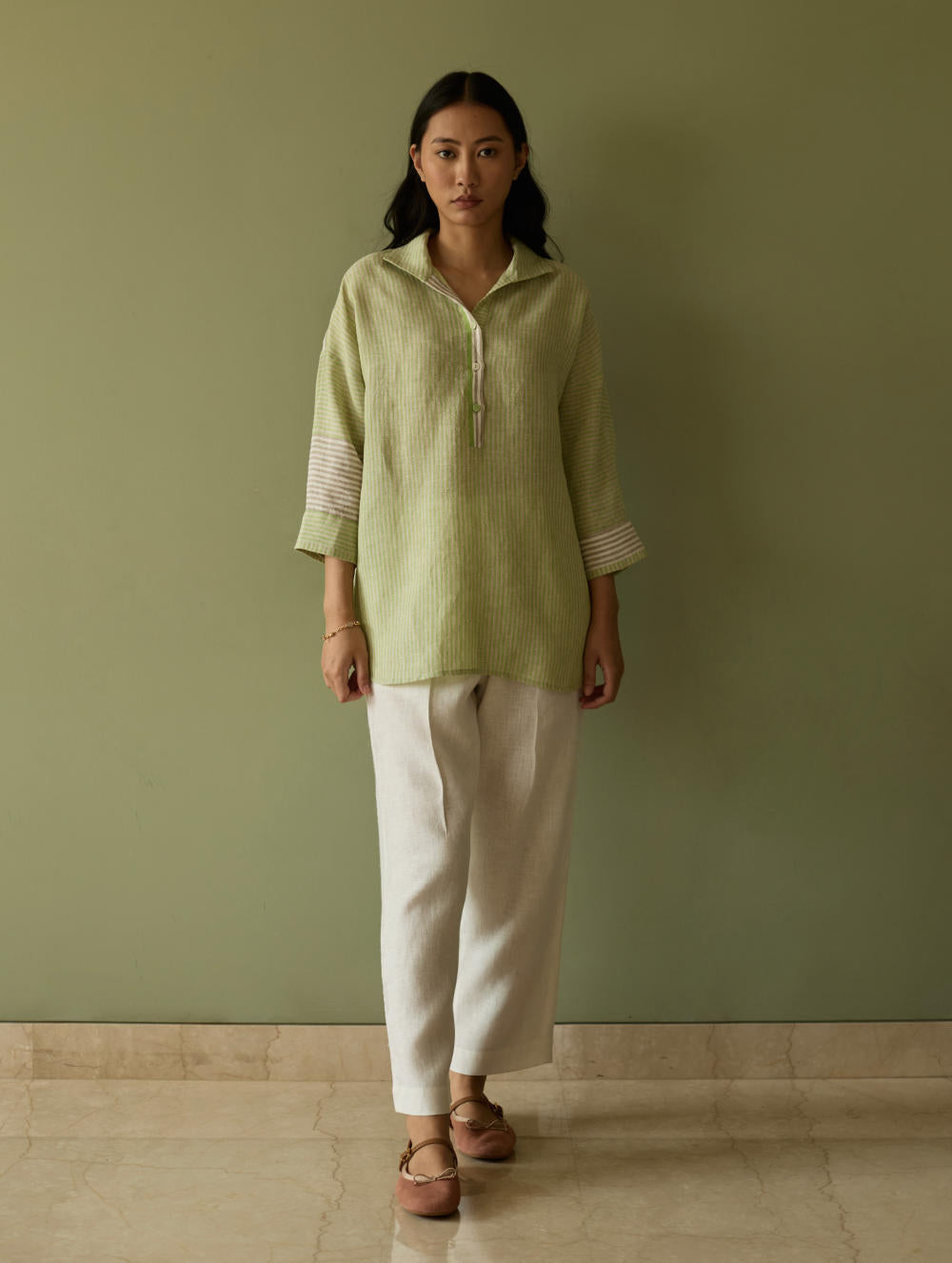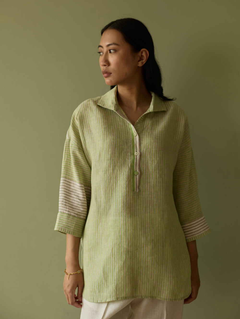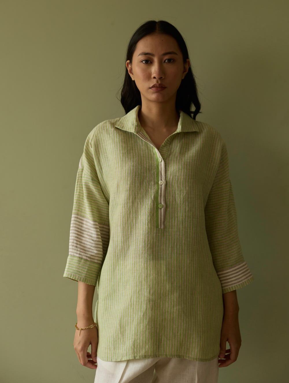 Shirt - Our favourite relaxed-fit shirt is designed in our bespoke handwoven yarn-dyed soft stripe linen in tones of green, grey and ivory. The weave is designed as a delicate, and unique multicolour stripe handwoven linen, known for its breathable texture and gentle drape. The relaxed collar and drop shoulders create an easy, effortless silhouette, while contrasting ivory woven borders on the placket, cuff and 3/4th sleeves add a subtle, shaped edge.The Risa is finished with intricate pintucks at the back and linen fabric and mother-of-pearl buttons.