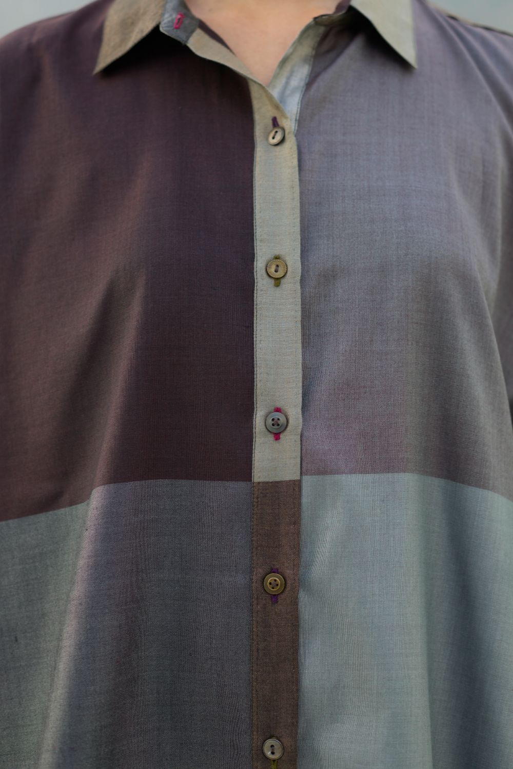Shirt - The signature Sara shirt is made thoughtfully in our our luxurious handwoven eri (ahimsa) silk, designed with an oversized check pattern in 4-5 shades. Designed with a relaxed drop shoulder, Sara offers ease and movement while detailed with a refined woven metallic piping throughout. The look is thoughtfully finished with intricate hand-kantha accents at the sleeve hems, a mix of varied brass buttons and multi-coloured button-holes. Ideal for a statement look that is comfortable and allows you to move easily through your day. Pant - The versatile culotte is crafted in our soft handloom eri (ahimsa) silk, woven as an oversized colour-block check pattern in 4-5 shades. Designed for comfort and functionality, the culottes include a back elasticated waistband with an inside drawstring for an adjustable fit, as well as comfortable pockets. The piece is intricately finished with a subtle woven metallic border at the hem.