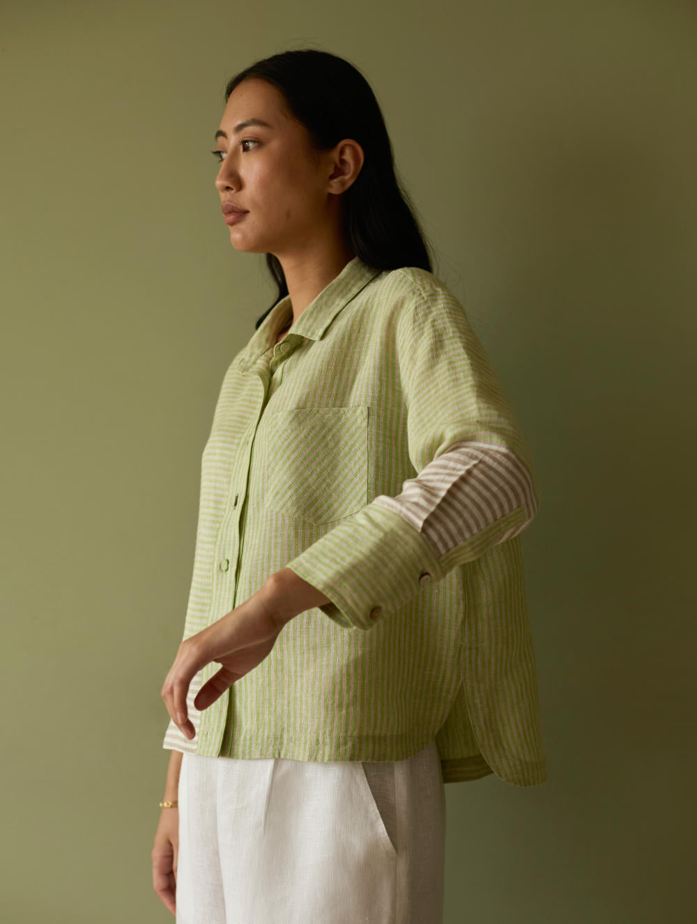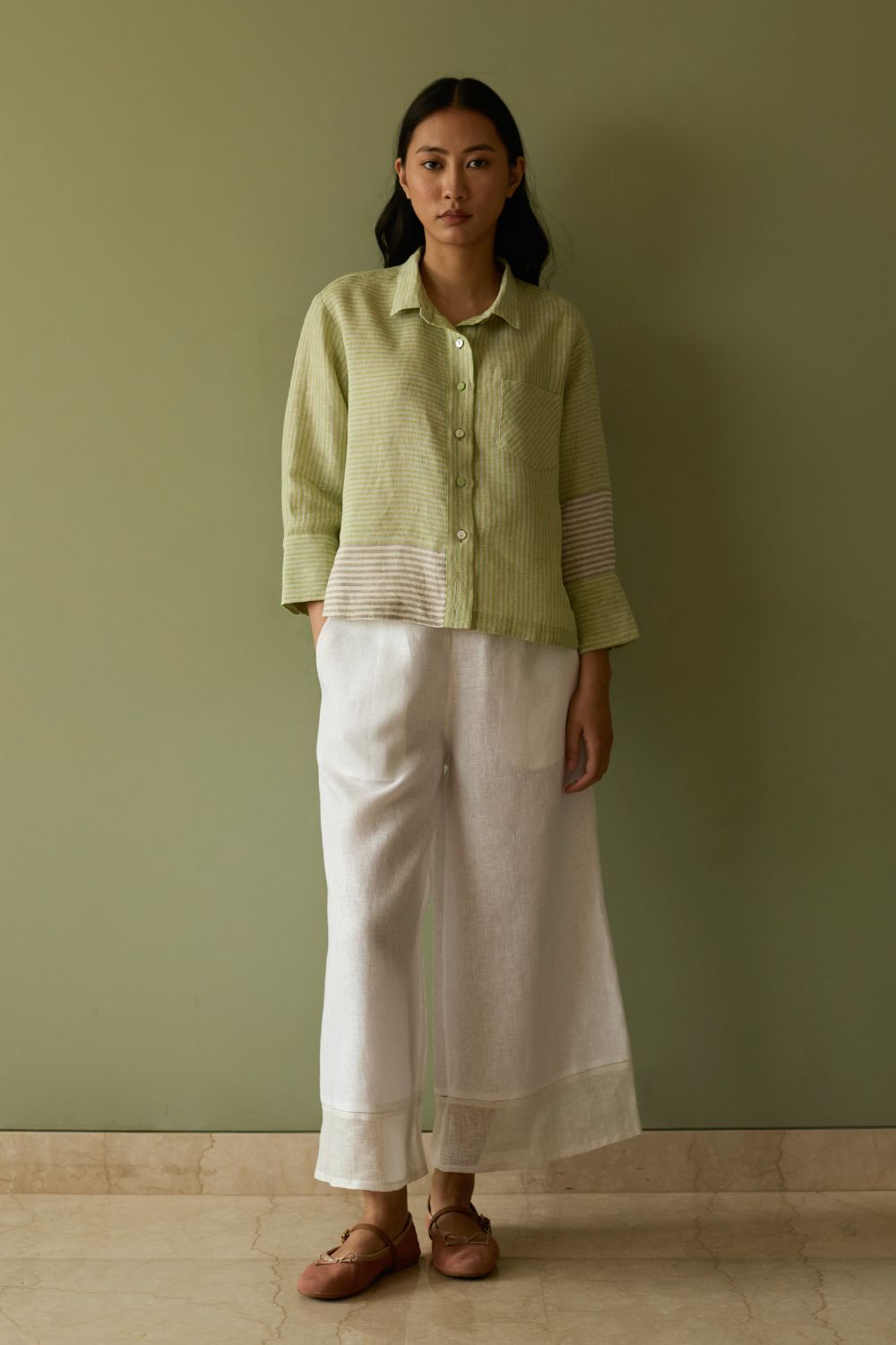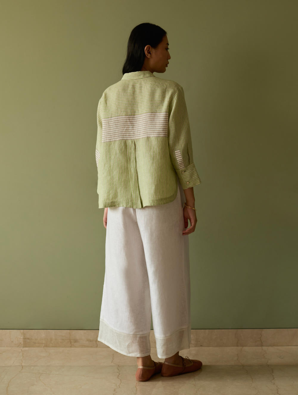 Top - This chic & contemporary colour-blocked shirt is crafted from our bespoke handwoven yarn-dyed soft stripe linen in tones of green, grey and ivory. The weave is a delicate, and unique multicolour stripe handwoven linen that is statement, yet balanced. The cropped shirt is sharp yet relaxed, featuring a clean button-down placket with 3/4th sleeves and thoughtfully placed border details on the front hem, sleeves and back. The shirt is finished with a mix of linen fabric and luminous mother-of-pearl buttons.