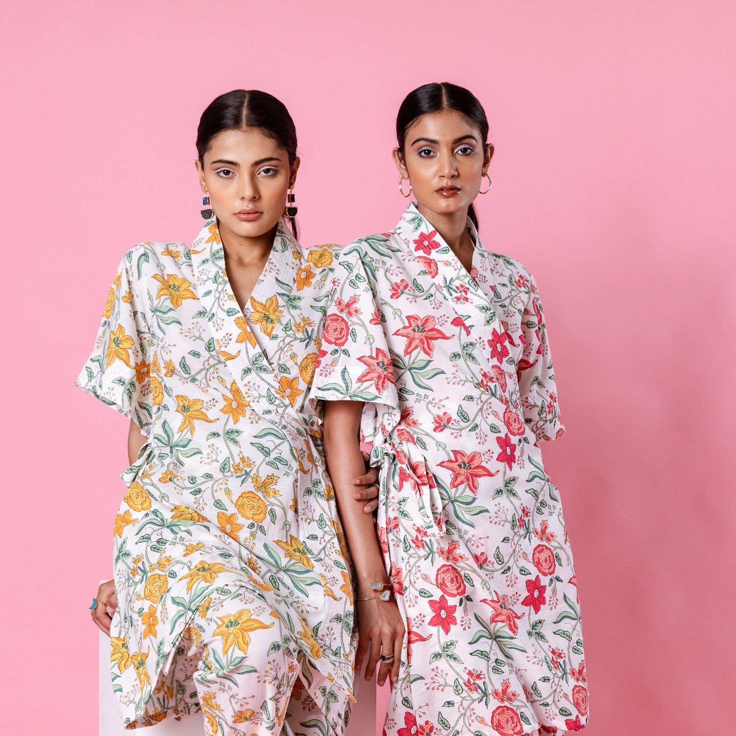 Product Type: Co-ord Set Delilah - Bright like the summer sun and beautiful like the first dawn of spring. Our forever essential kimono co-ords for summer. Florals on ivory remind us of English summers. This set consists of a hand-block printed kimono paired with matching trousers.
