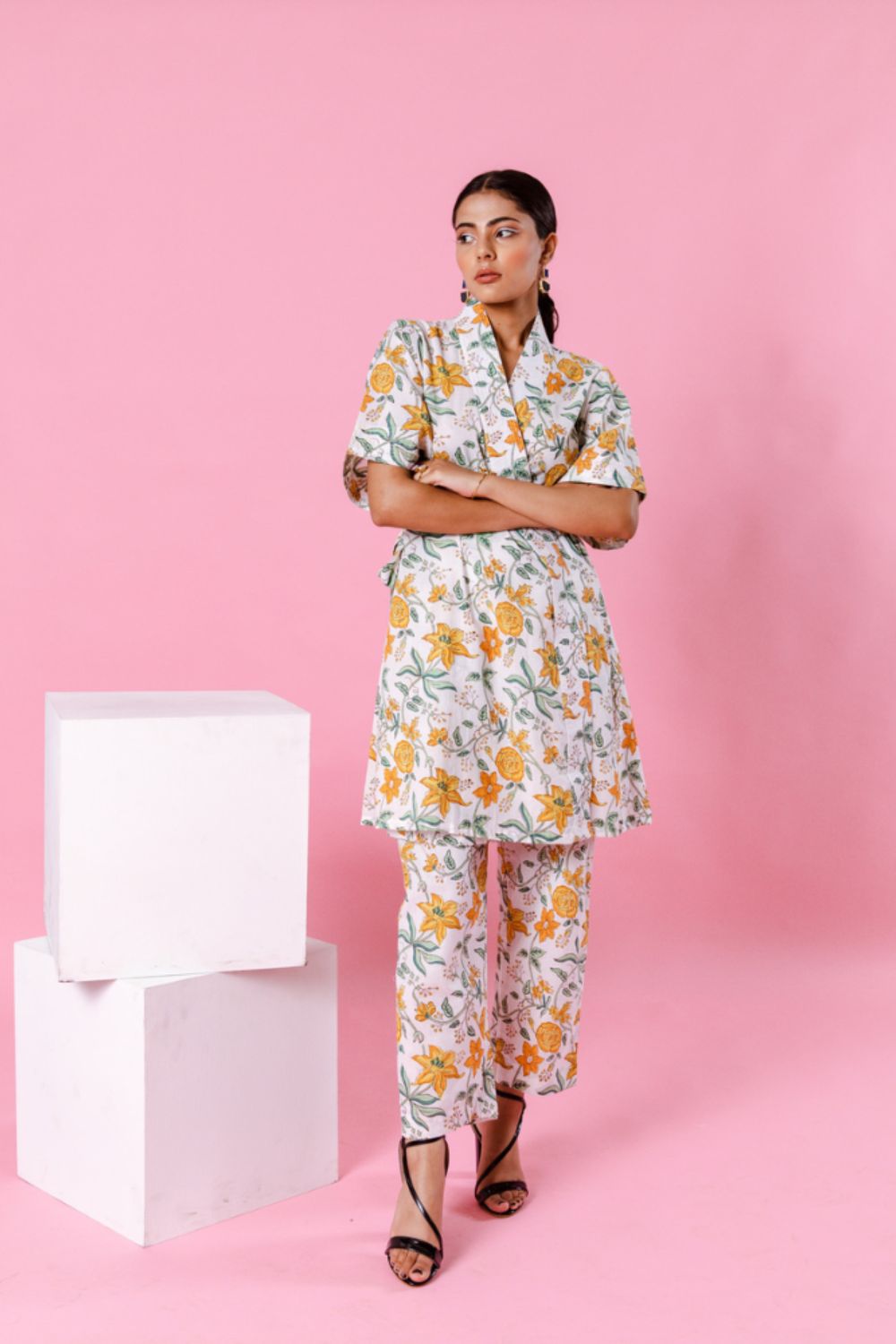 Delilah - Bright like the summer sun and beautiful like the first dawn of spring. Our forever essential kimono co-ords for summer. Florals on ivory remind us of English summers. This set consists of a hand-block printed kimono paired with matching trousers.
