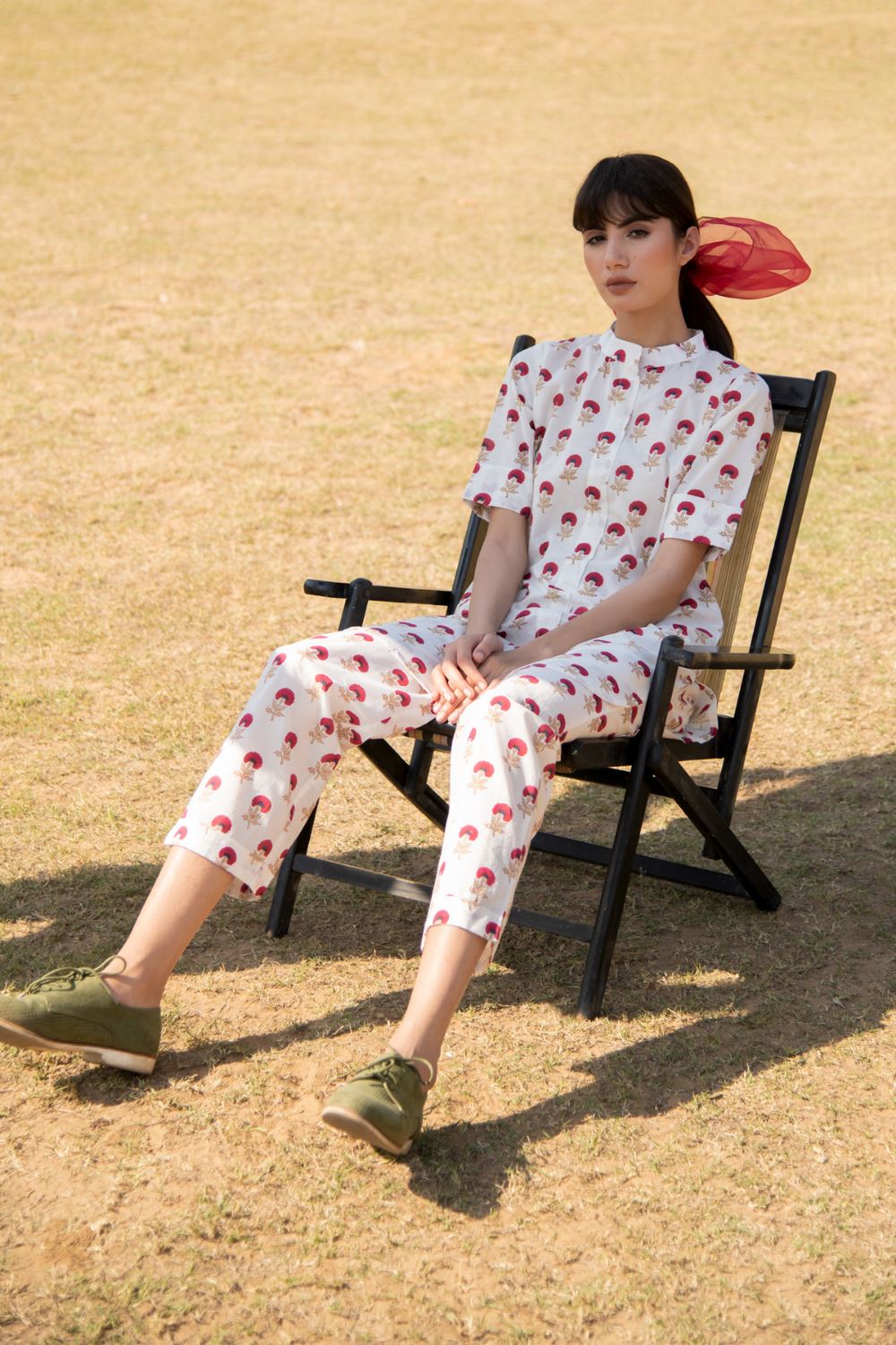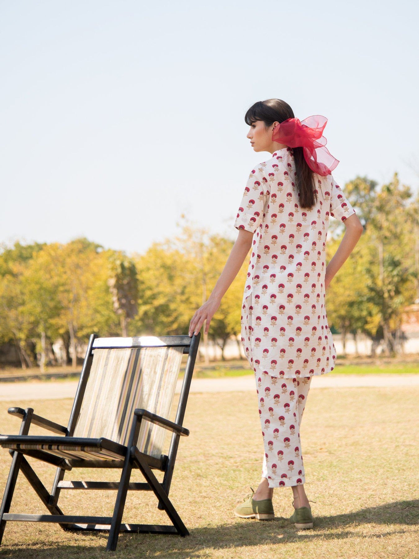 Chic co-ord set in floral block print. Dress it down for a casual lounge in at home or dress up as a fun kurta set. Set the style quotient high with this must have piece in your wardrobe.