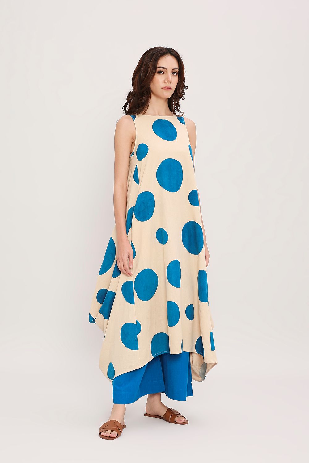 Our classic side cowl dress with a boat neckline makes a subtle yet striking statement, featuring handblocked polka dots all over. A perfect blend of effortless drape and playful detailing, styled here with matching pants for a coordinated and contemporary look.