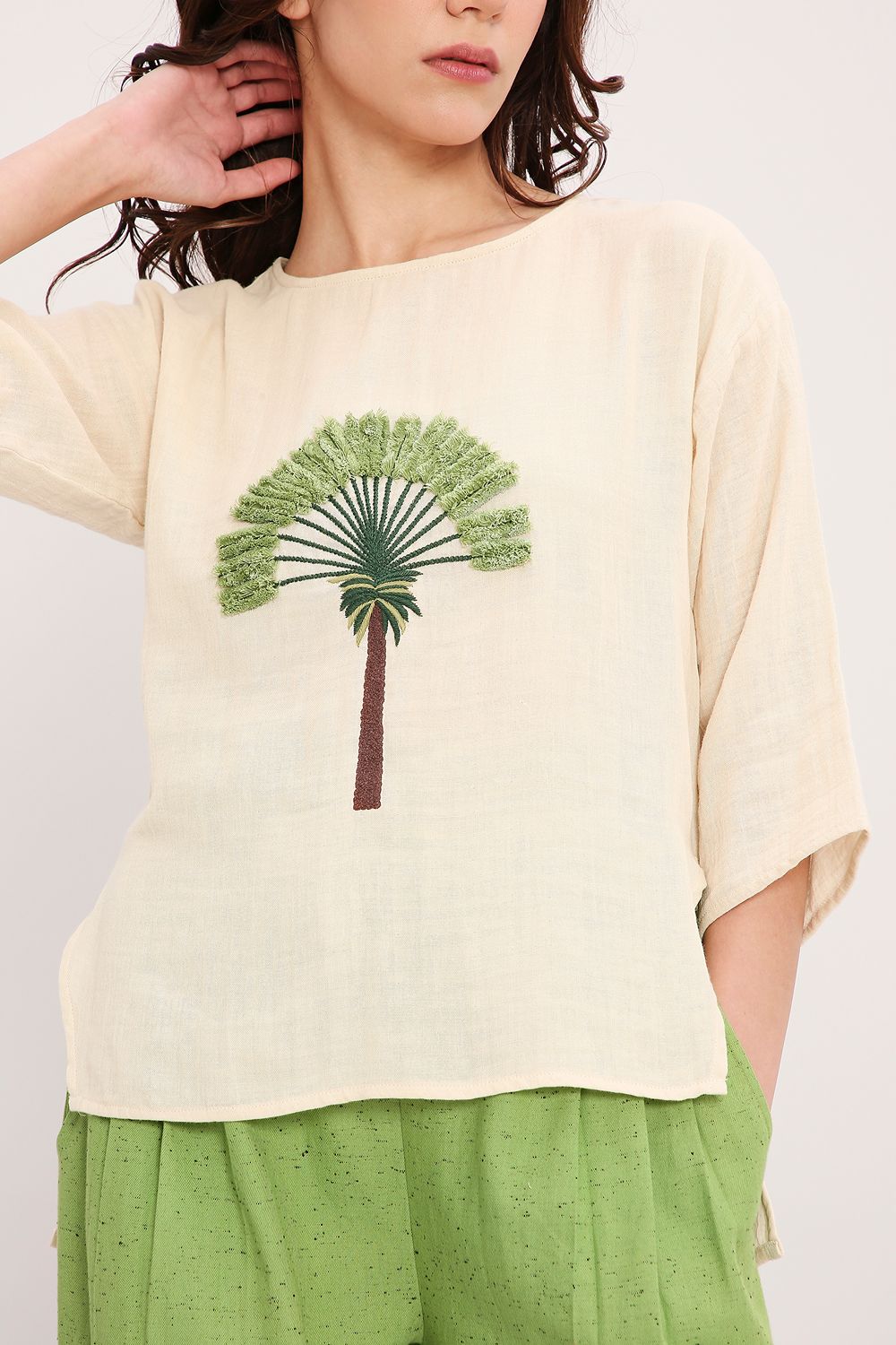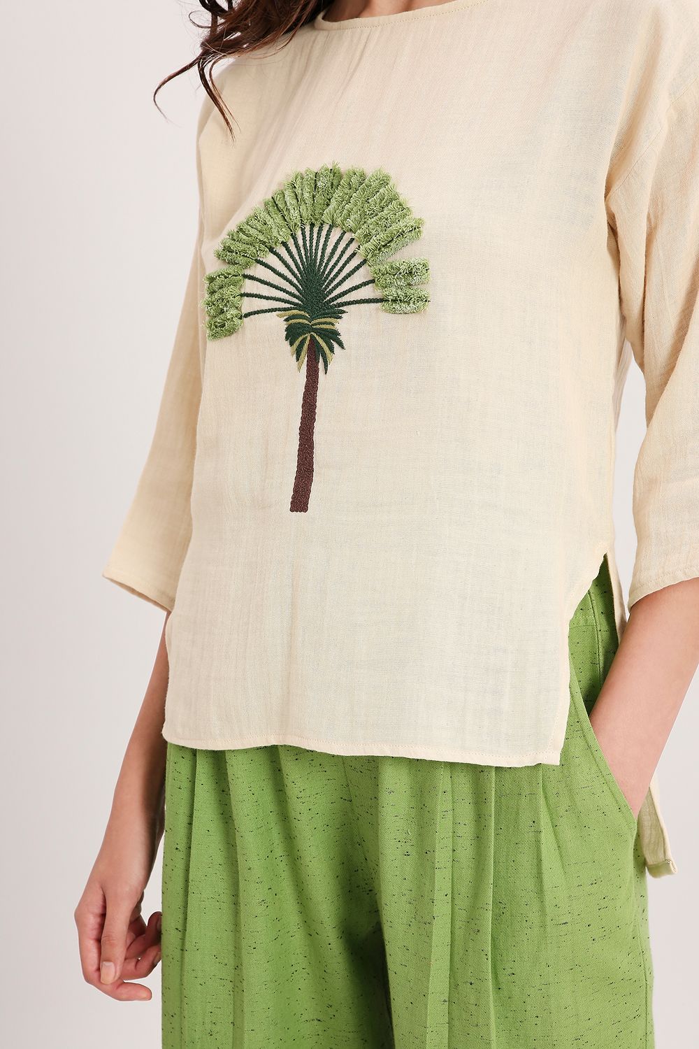 Hand embroidered soft crush cotton summer top teamed with textured cotton pants with fully elasticated waist with a draw string. Comes in 2 pcs.