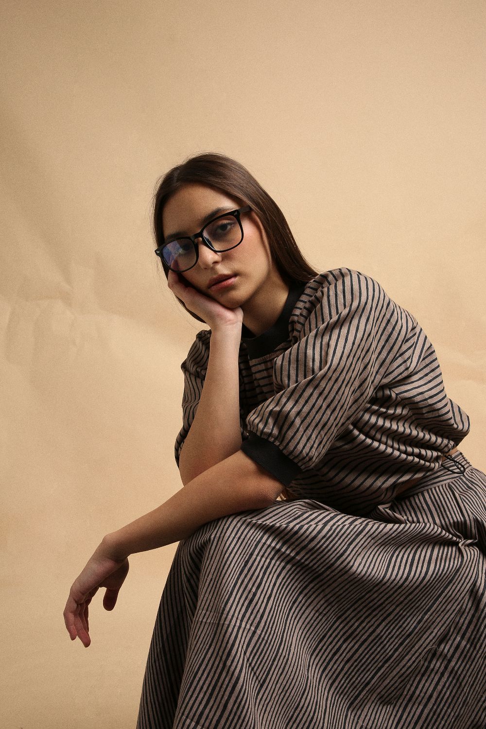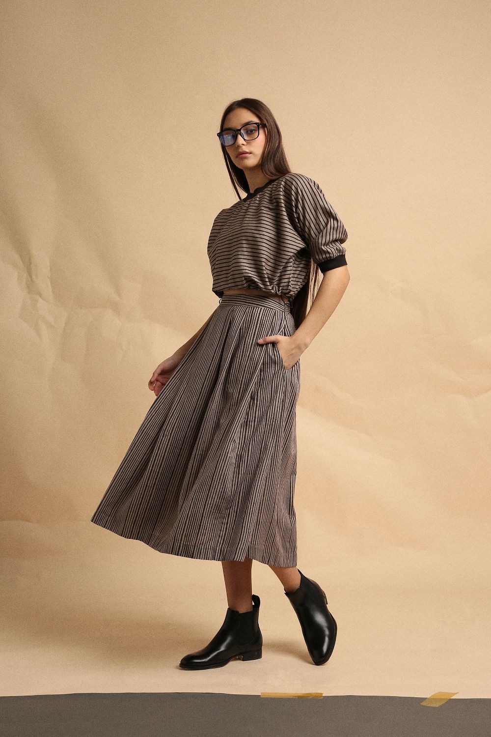 Crop top made with Handspun cotton with hand bloc printing. Edges of neck round and sleeves in contrast t-shirt cotton rib detail with back opening with wooded buttons and the hemline with elasticated drawstring with a side stopper for adjustments. Teamed with box pleated skirt with back elastic and side zipper opening. Made in Handspun cotton with hand block printing, side pockets for ease.