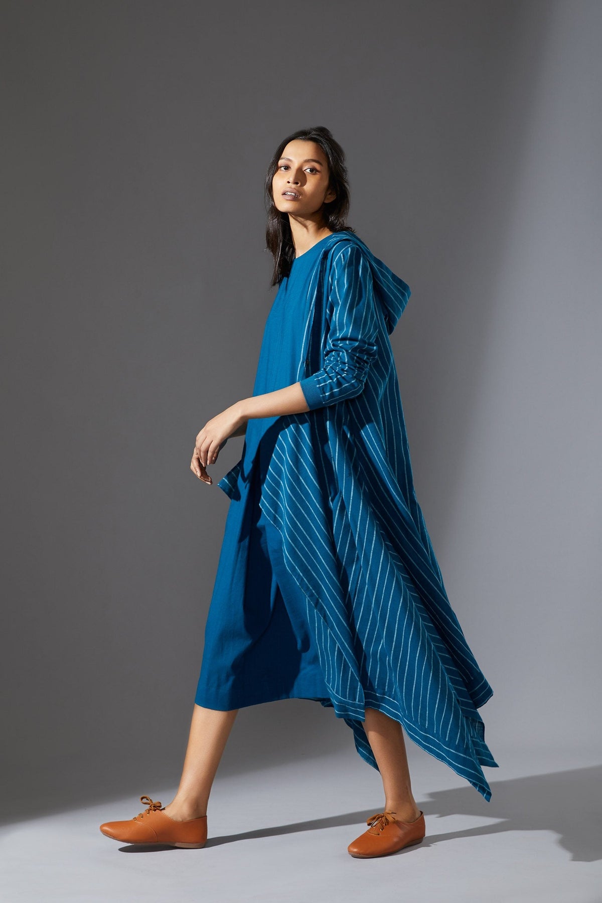 An interesting and modern take on a stripe shirt. With a simple placket in front and elastic on the sleeves it gives a chic look from the front. From the side it surprises with intricate pleated shoulders and makes a statement. Team it up with our stripe pants and sport it as a set. This set comes with a dress and jacket.