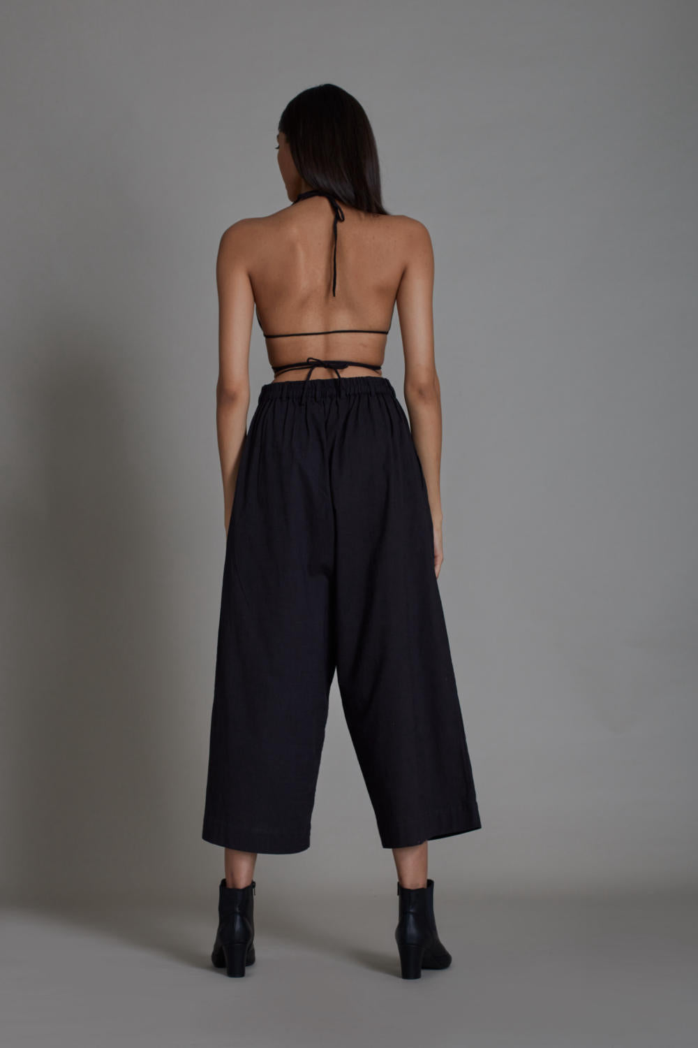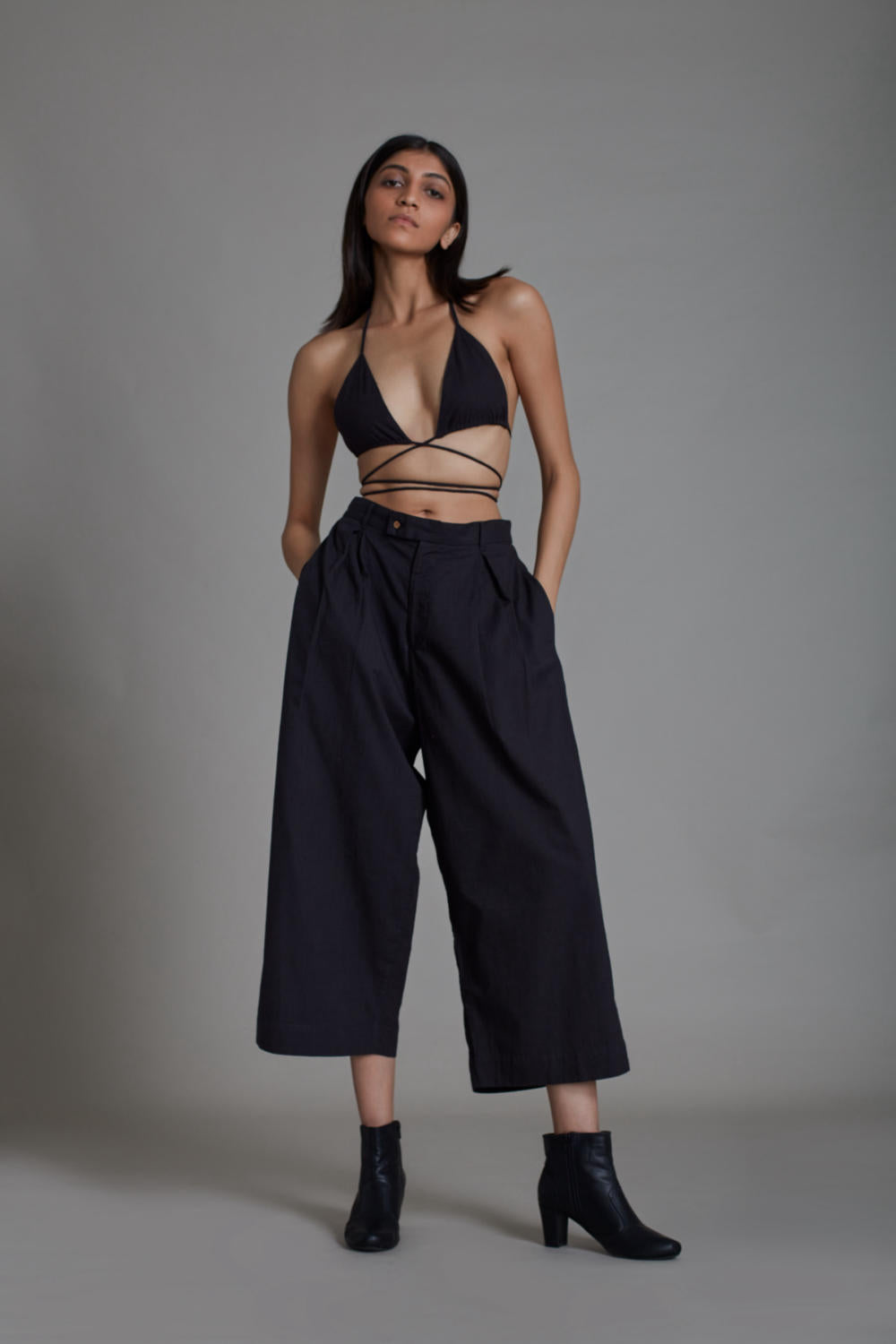 Co-ord Set: This edgy and cool ensemble features wide leg front pleated pants and bralette made in handwoven cotton this set is breathable and comfortable. Style this set together or with shuffle jacket from our collection and this can be your next go to outfit. (Set of 2)
