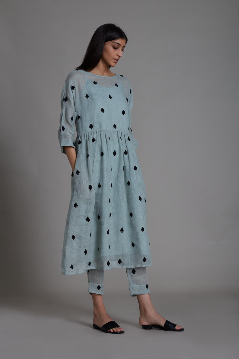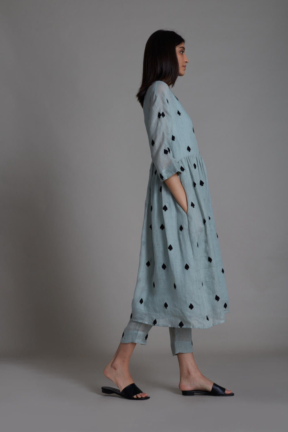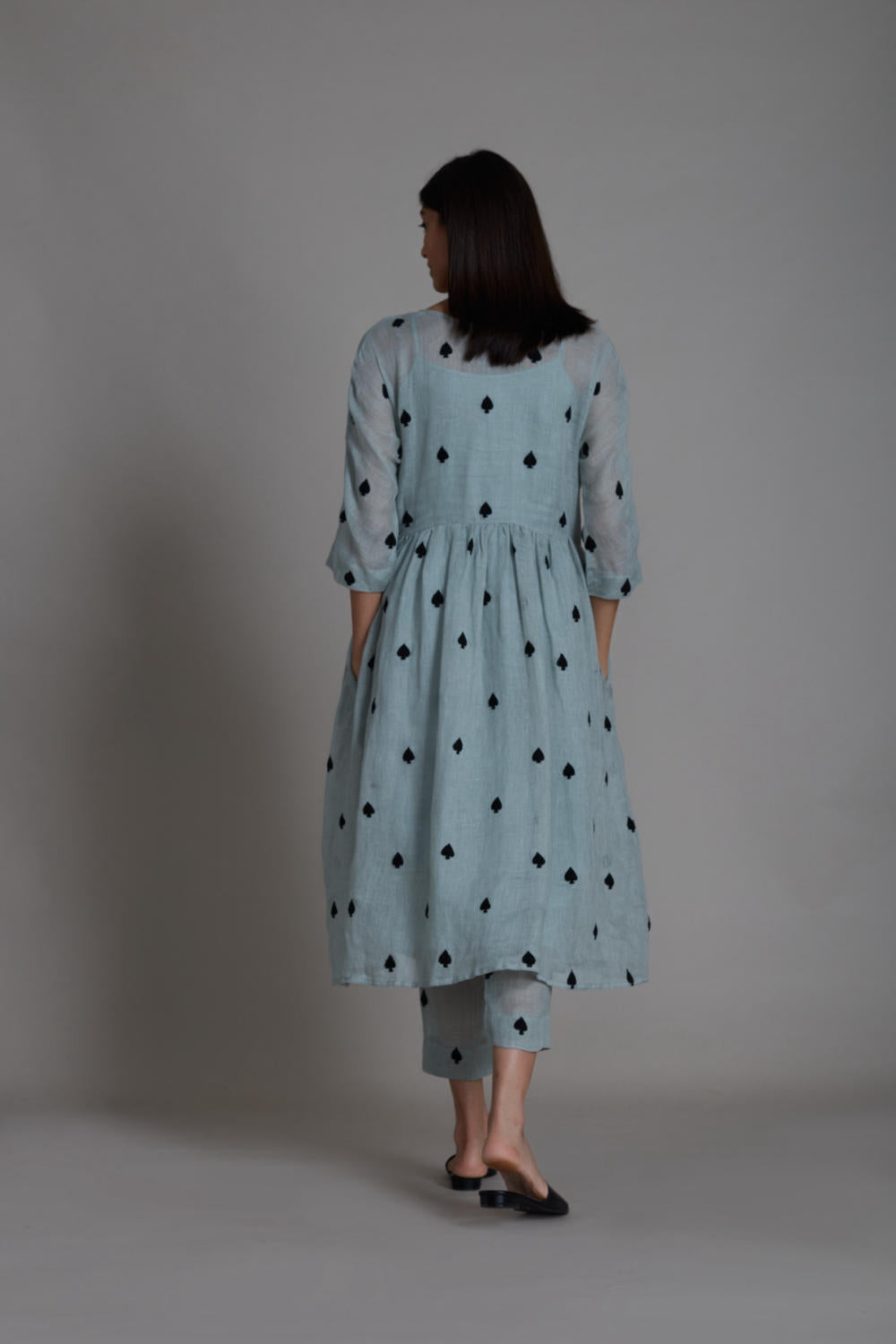 Give your festive outfit a fashionable spin with this teen patti set. Made in pure linen this ensemble features an embroidered dress and comfortable linen pants. The dress has side pockets and pants which are elasticated at the back and lined with soft handwoven mal. (SET OF 2, DRESS AND PANTS, also handwoven cotton bralette inner comes with the set) Complete the look with the matching linen jacket from our collection!
