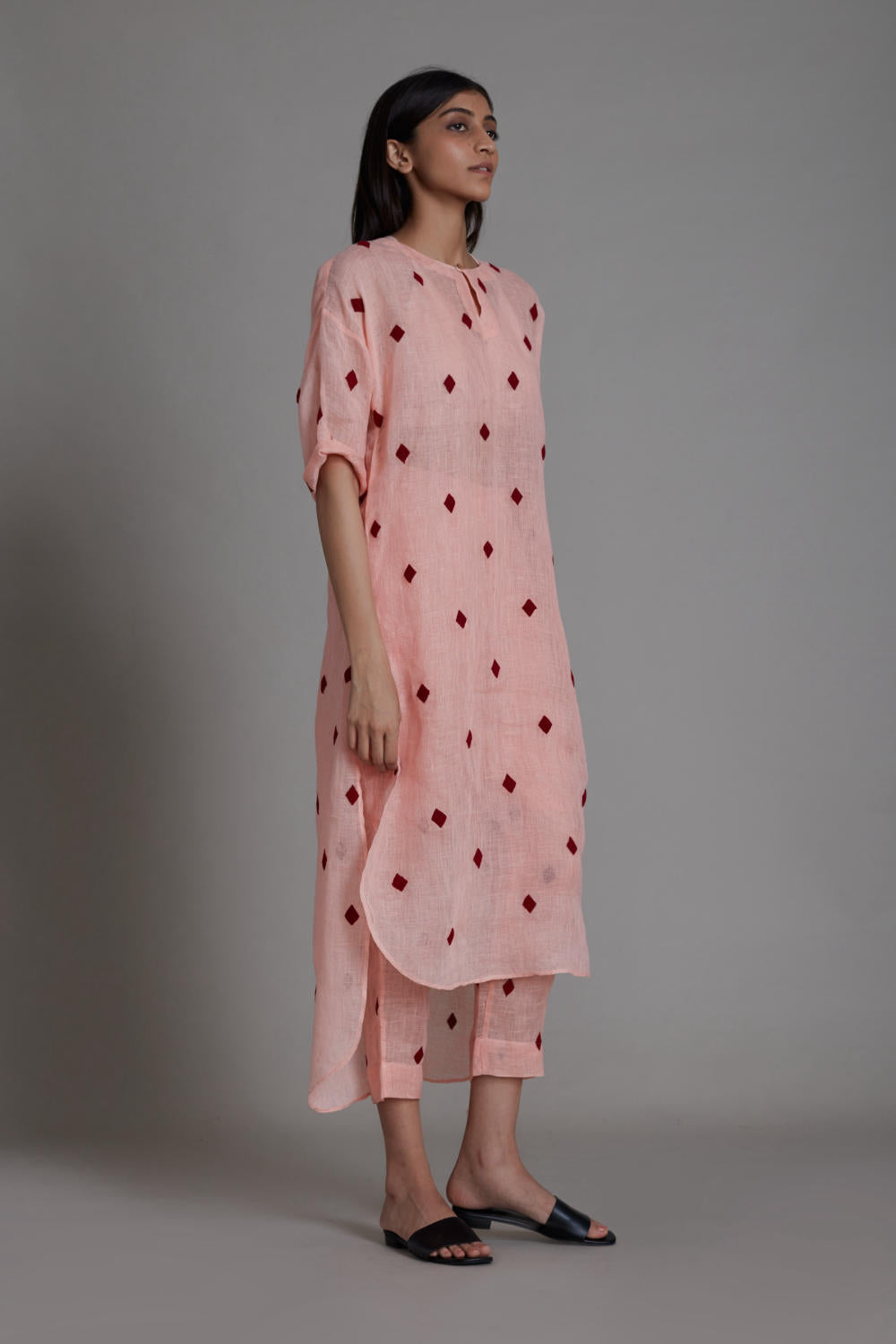 This tunic set is all that you need for daytime festivities. The apple cut detailing on the kurta brings elegance and class to the outfit. Pair this set with statement earrings and potli bag to complete the look. (SET OF 2, TUNIC AND PANTS, handwoven cotton bralette inner comes with the set)