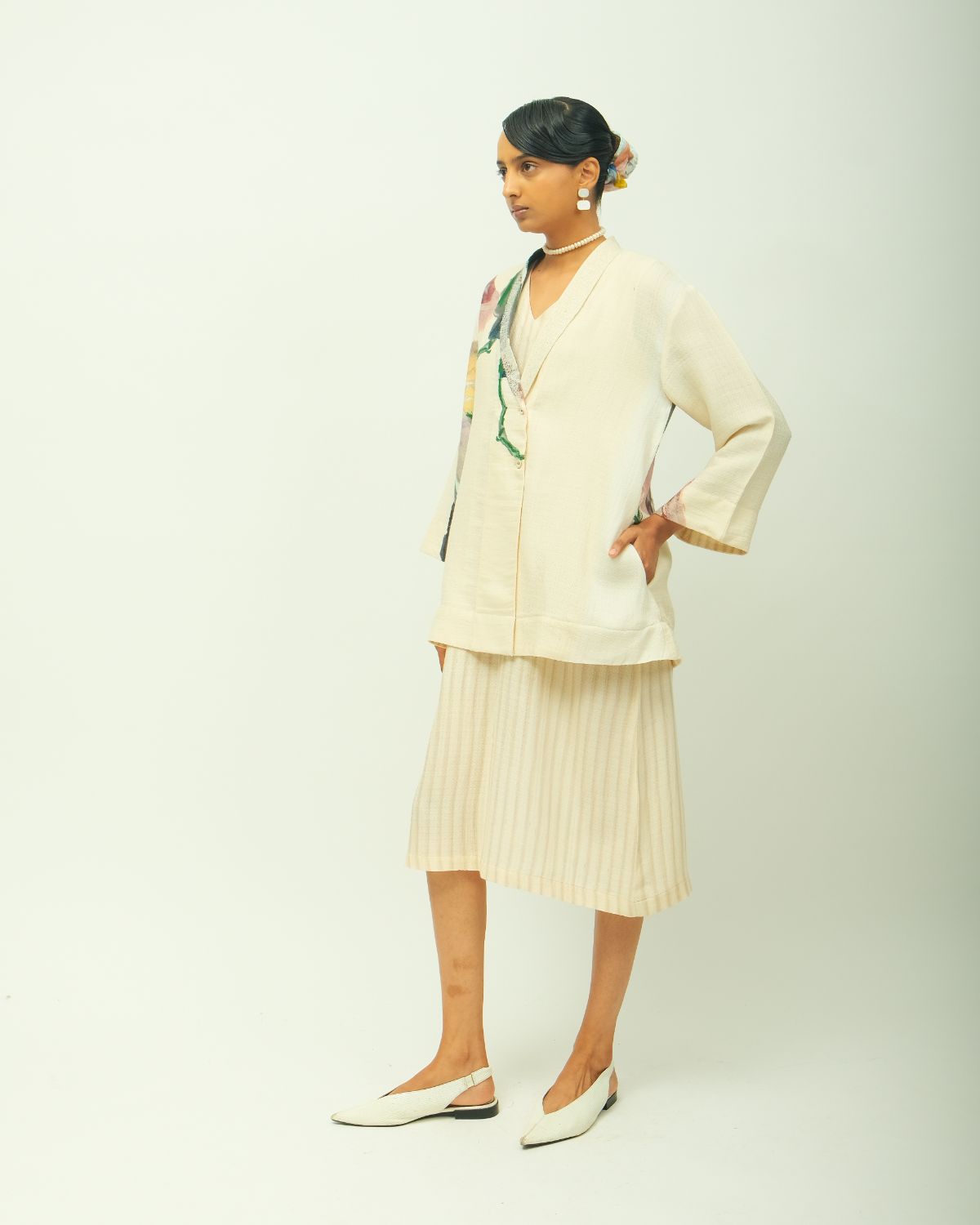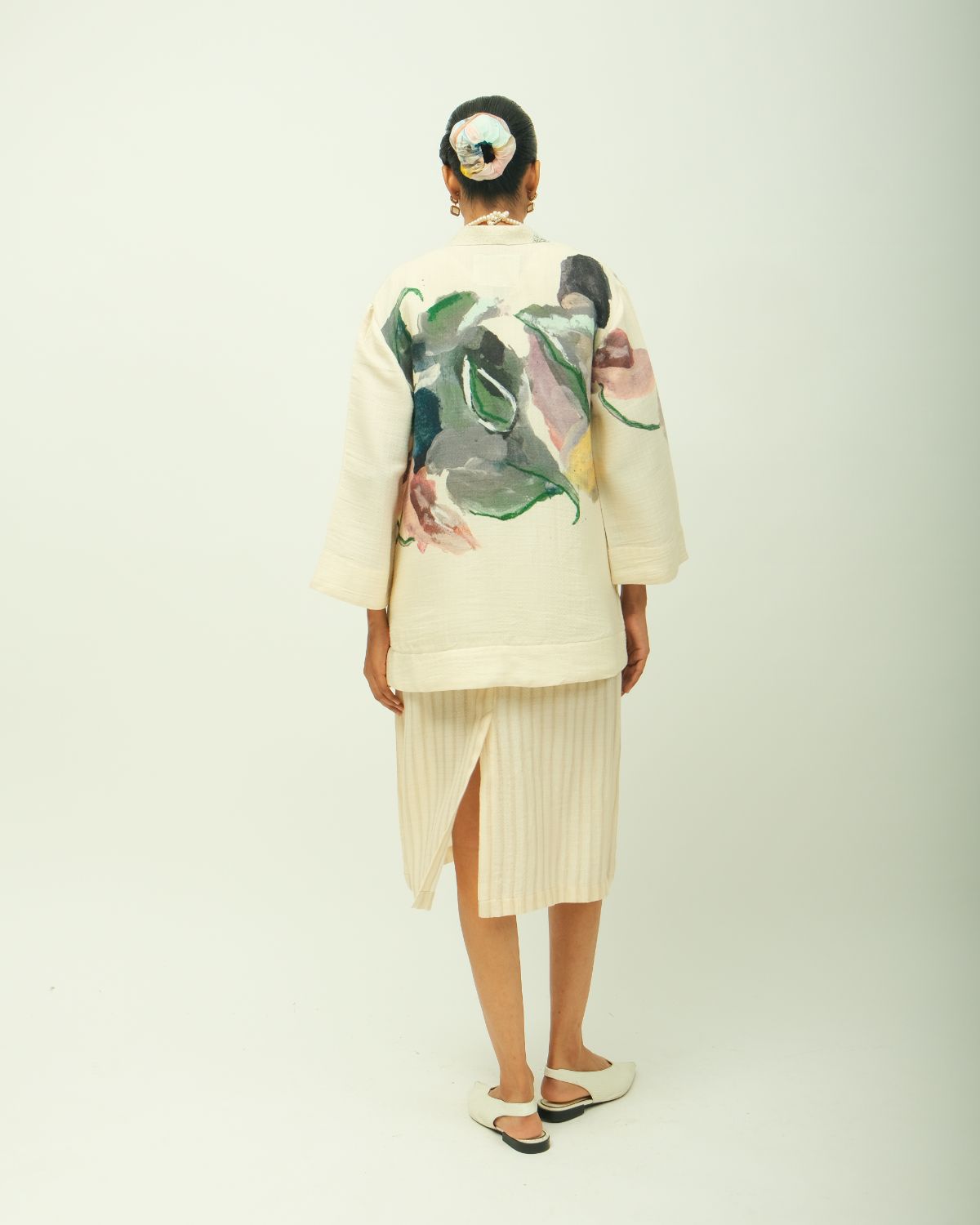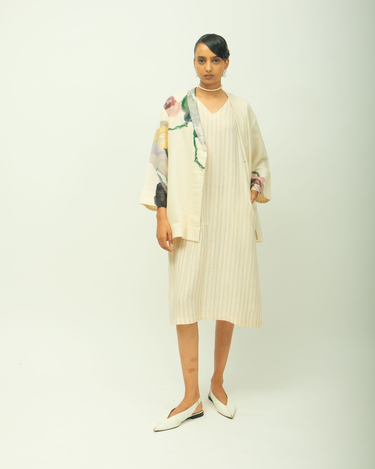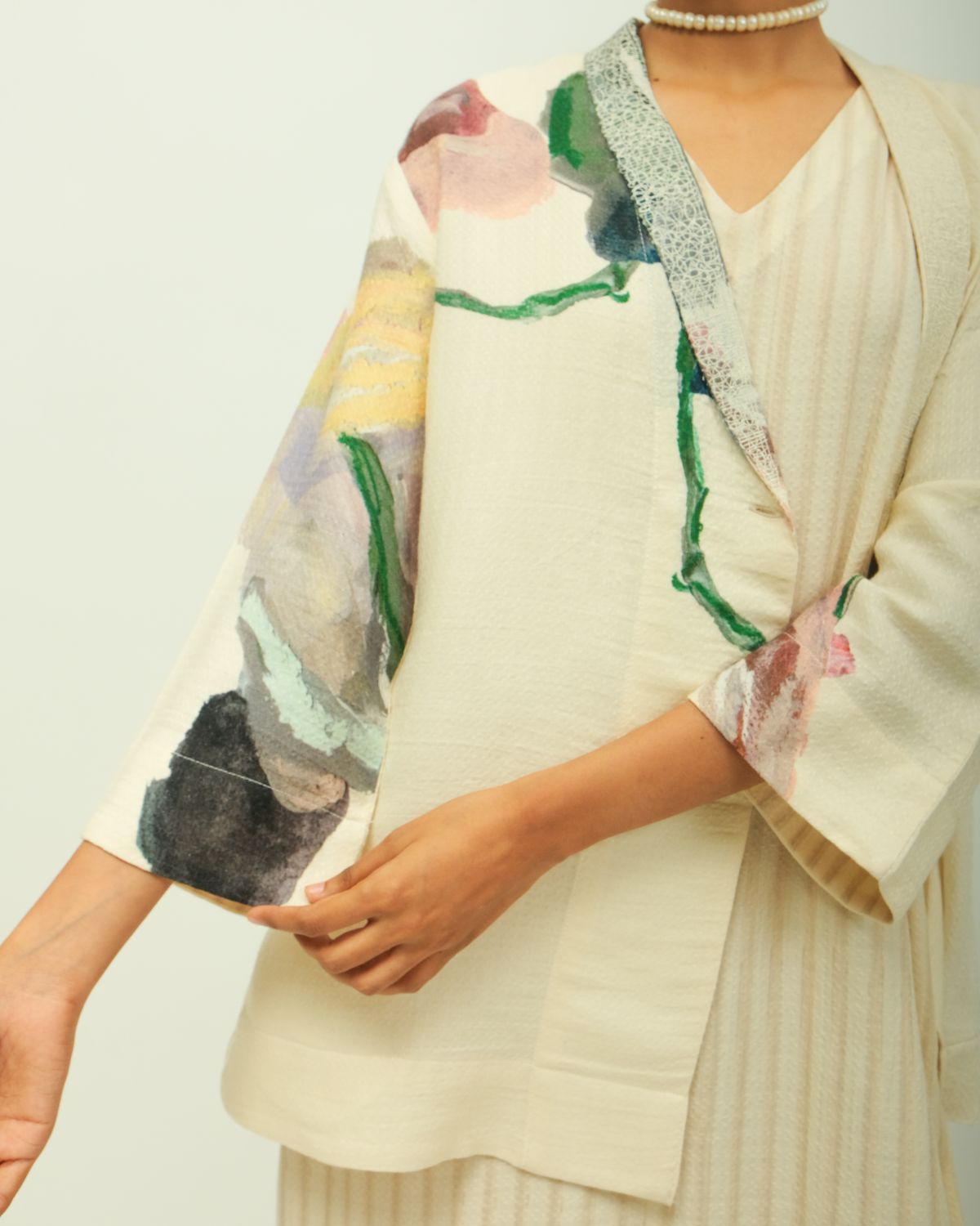 Jacket: Anti-Fit Jacket, shawl collar, V-neck and three-quarter sleeves, hand-painted abstract expressionist digitally transferred print, embroidery detailing on lapel, hidden placket and a relaxed fit. Print placement may vary - single piece
