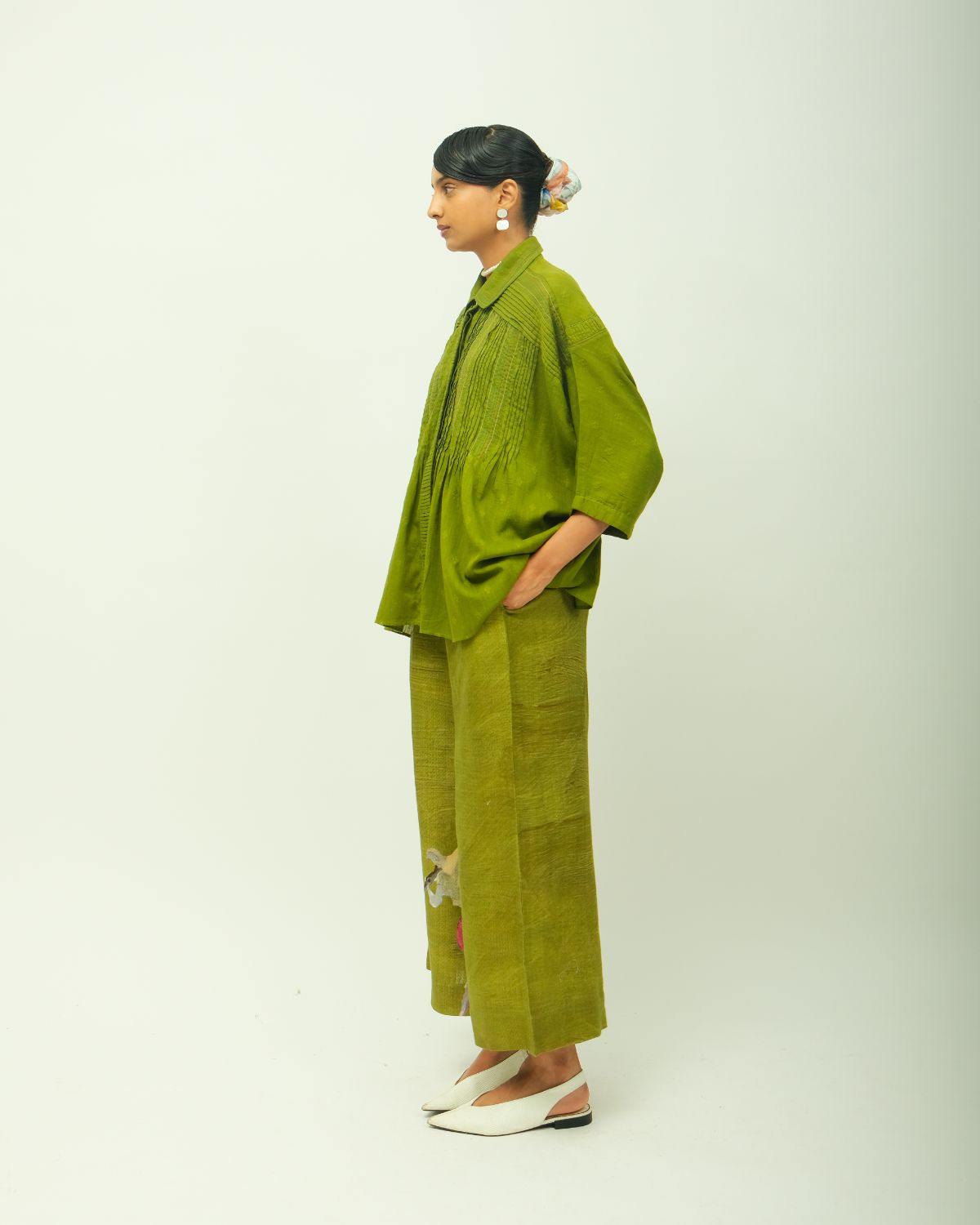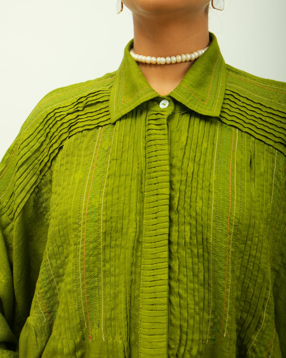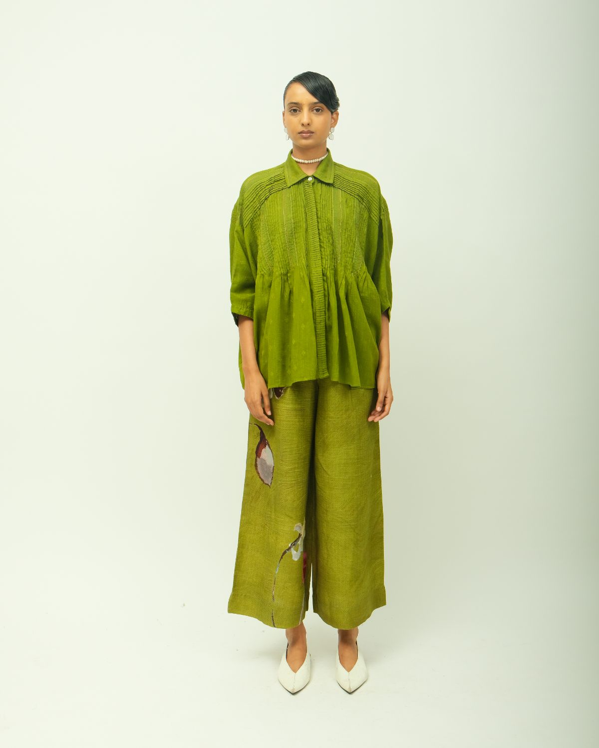 Top: Anti fit, short sleeved top, relaxed fit, vertical pin tucks on front, crafted from lightweight textiles. this piece offers both comfort and understated elegance. Variations in color, texture, and weave are inherent due to the hand-made nature of the garment- Single piece.