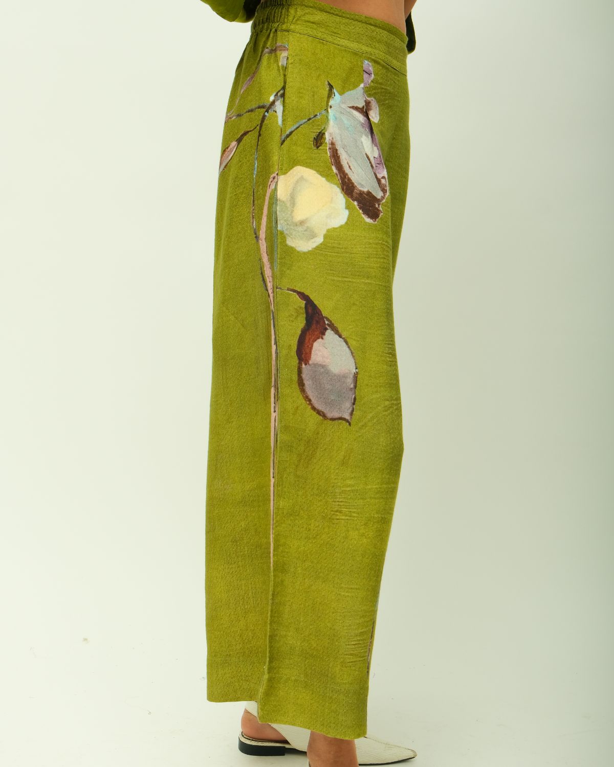 Lower: Anti fit, hand-painted abstract expressionist digitally transferred print, tapered fit, front belt, back elasticated lowers comes with a drawstring, side pockets. Print placement will vary—single Piece.