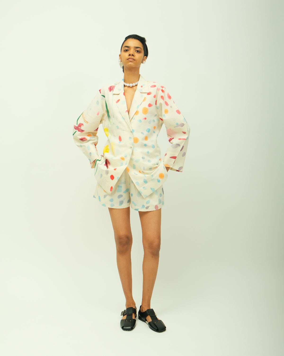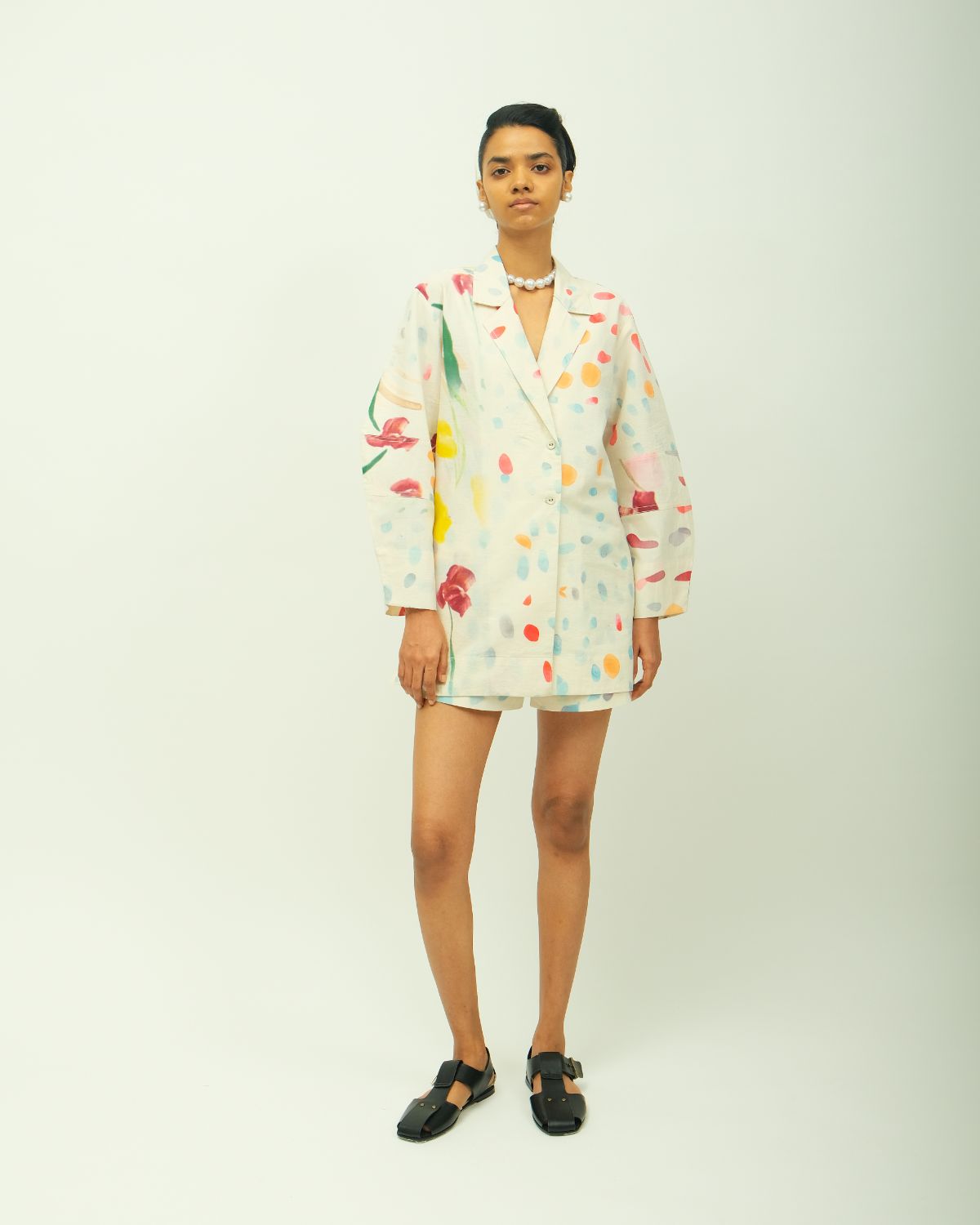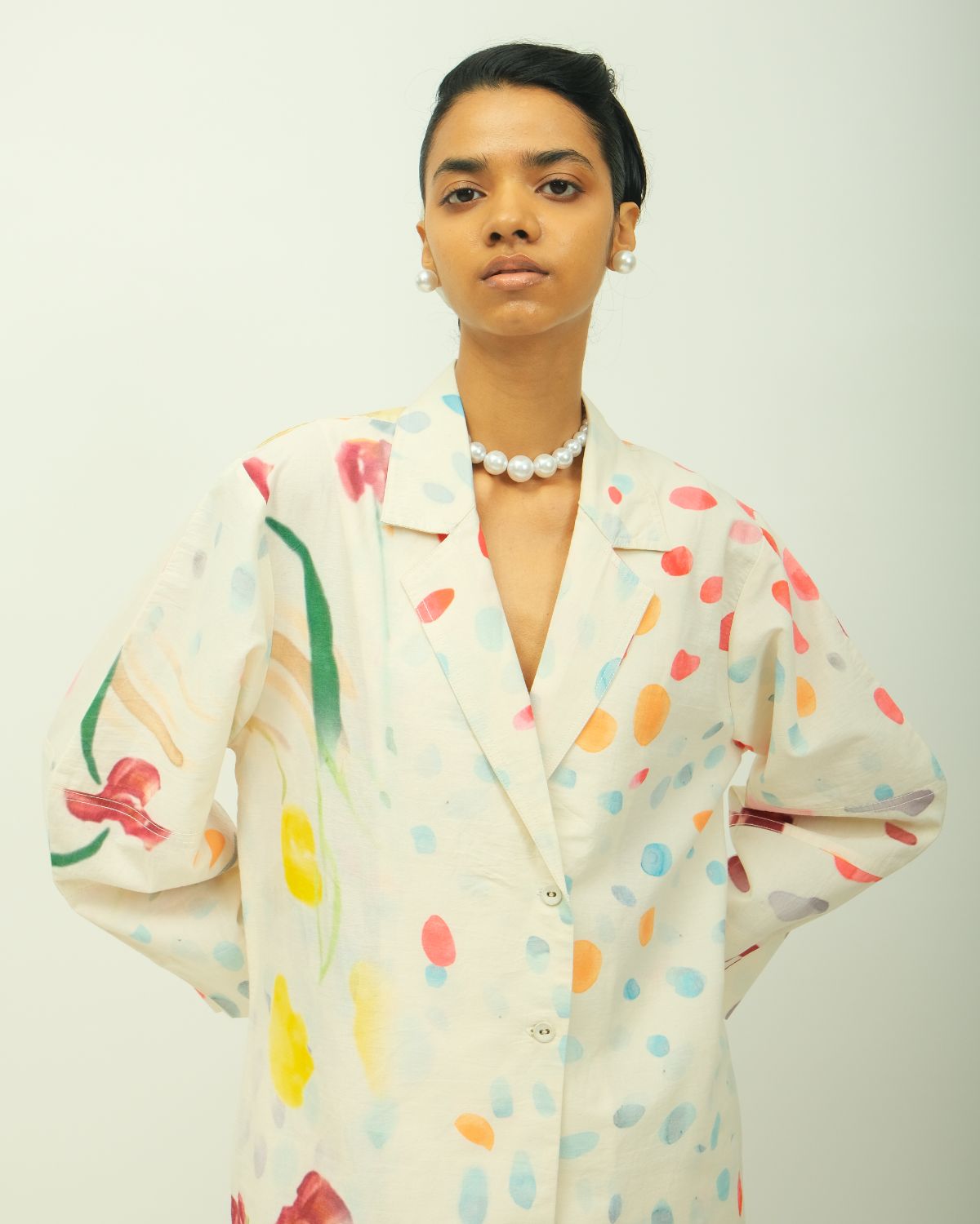 Shirt: Anti-fit silhouette featuring a V-neckline with a notched lapel collar. The garment showcases a hand-painted abstract expressionist print, digitally transferred for precision and vibrancy. Sleeves are highlighted with intricate appliqué detailing. each piece is uniquely crafted.