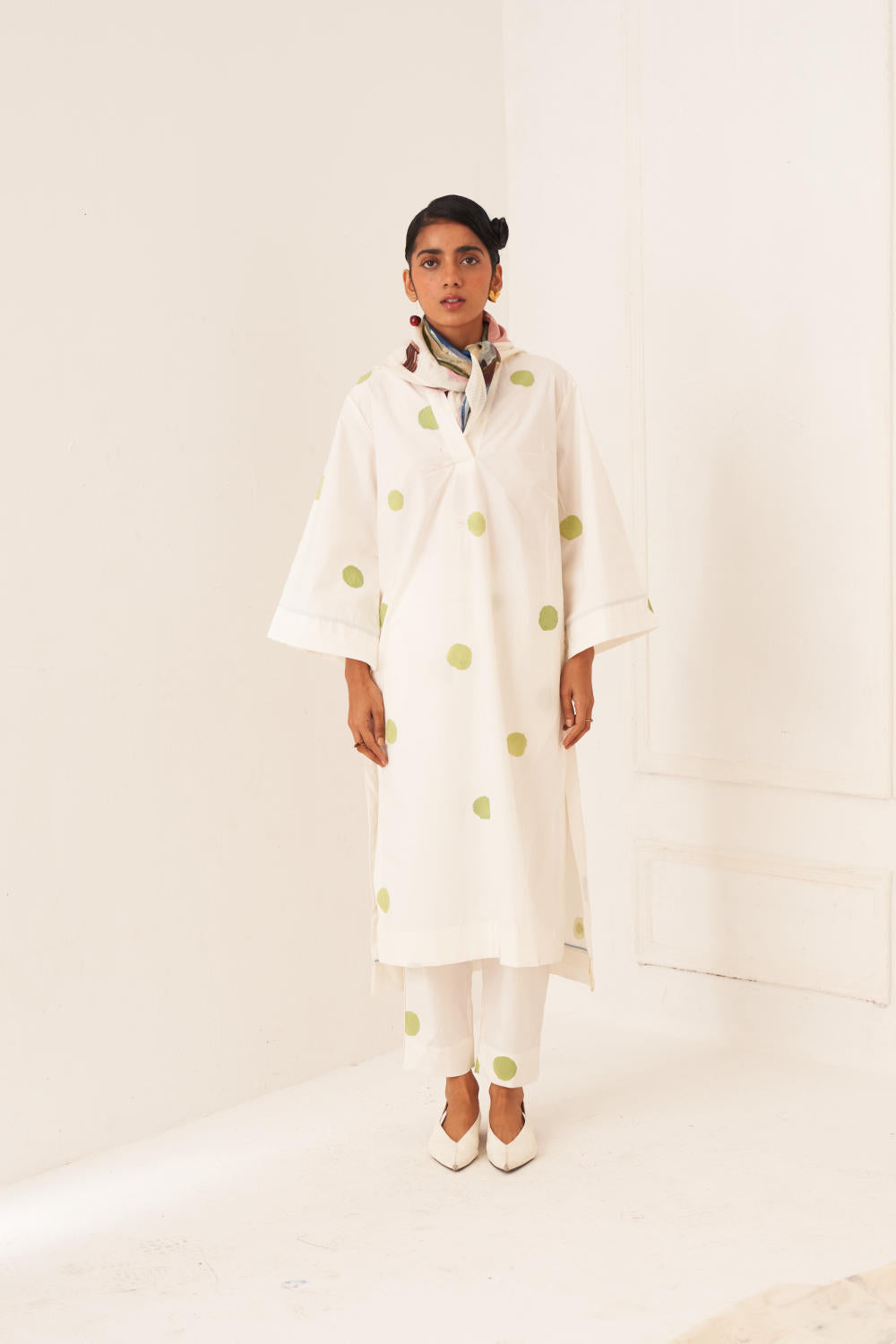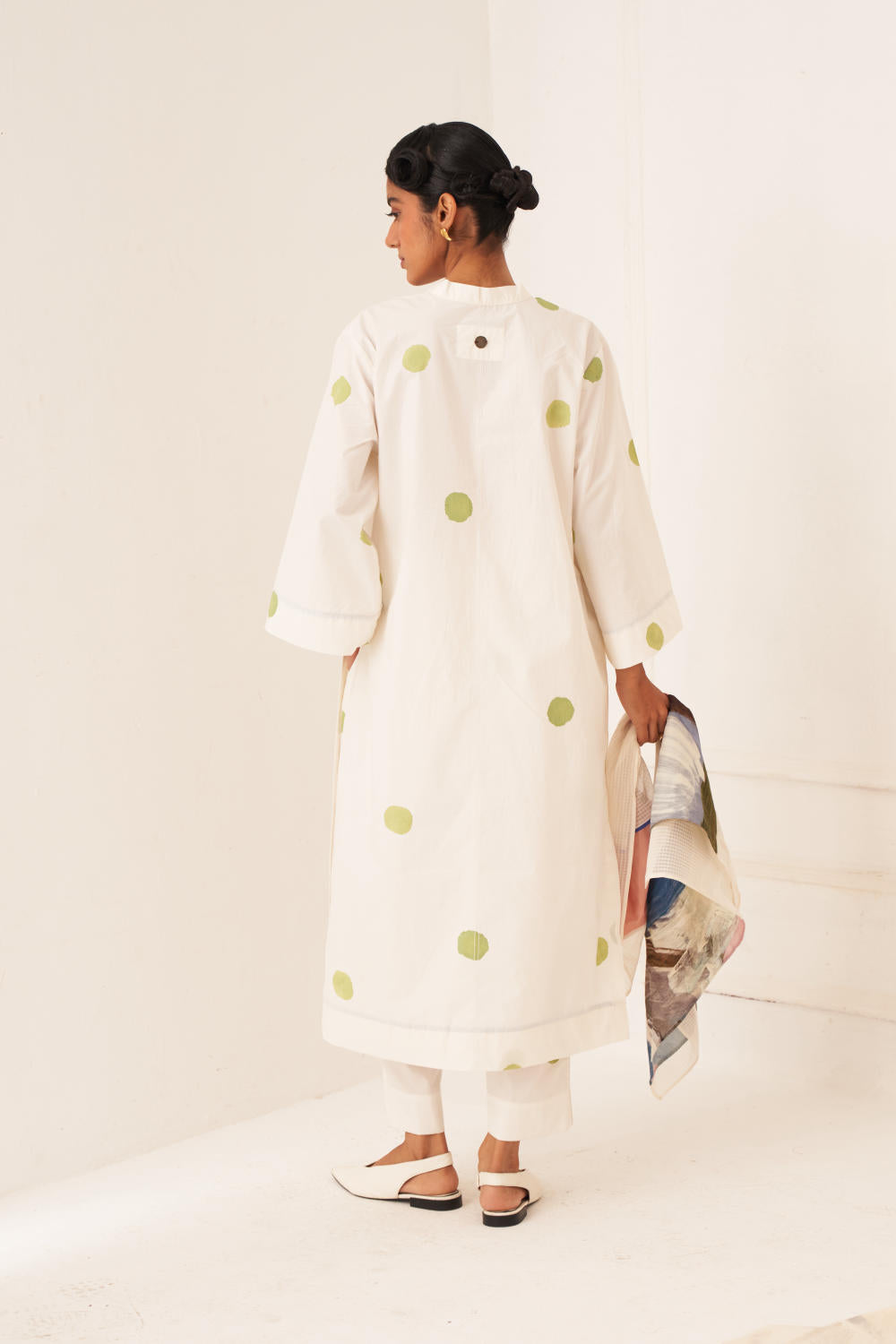 Dress/Kurta: Anti-fit Stft kurta is perfect for effortless style and comfort. It has hand-painted polka with an insert in the centre back, V-neckline, and side pockets. Signature vintage coin detailing in the back. Each piece is unique, with print placements varying due to the handmade nature of the garment. Model is wearing size M