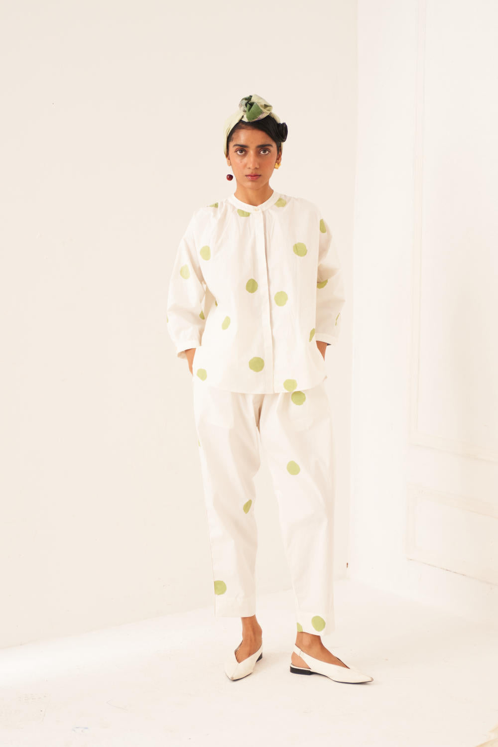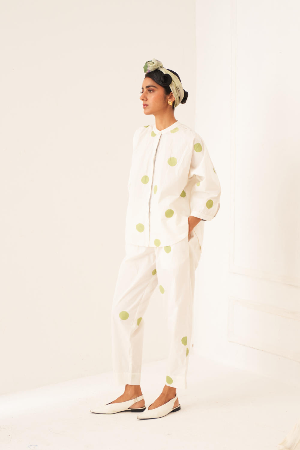 Top: The RJ shirt has a hand-painted polka which features a gathered neck, with side slits and a front button placket. It has our Signature vintage coin at the back which adds a unique touch. print placements will vary. Model is wearing size M.