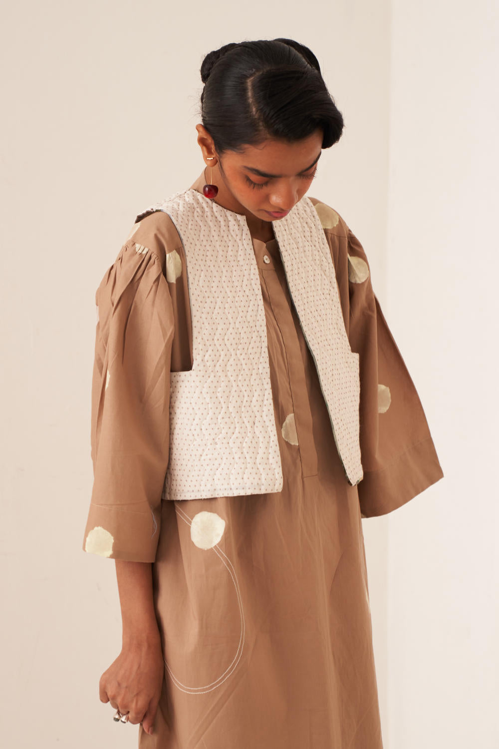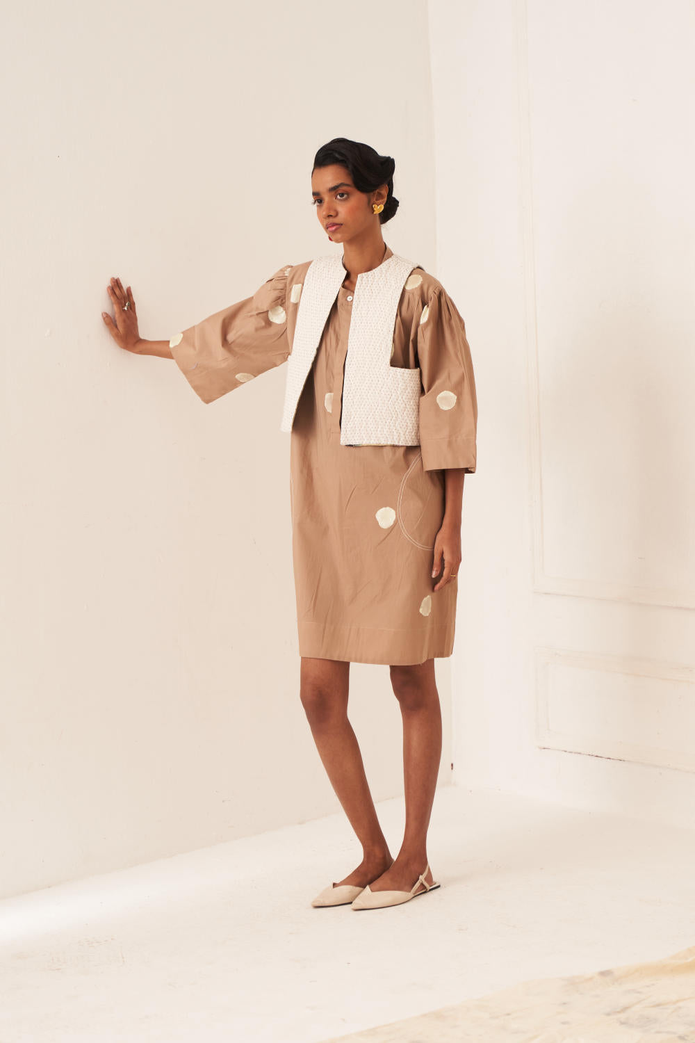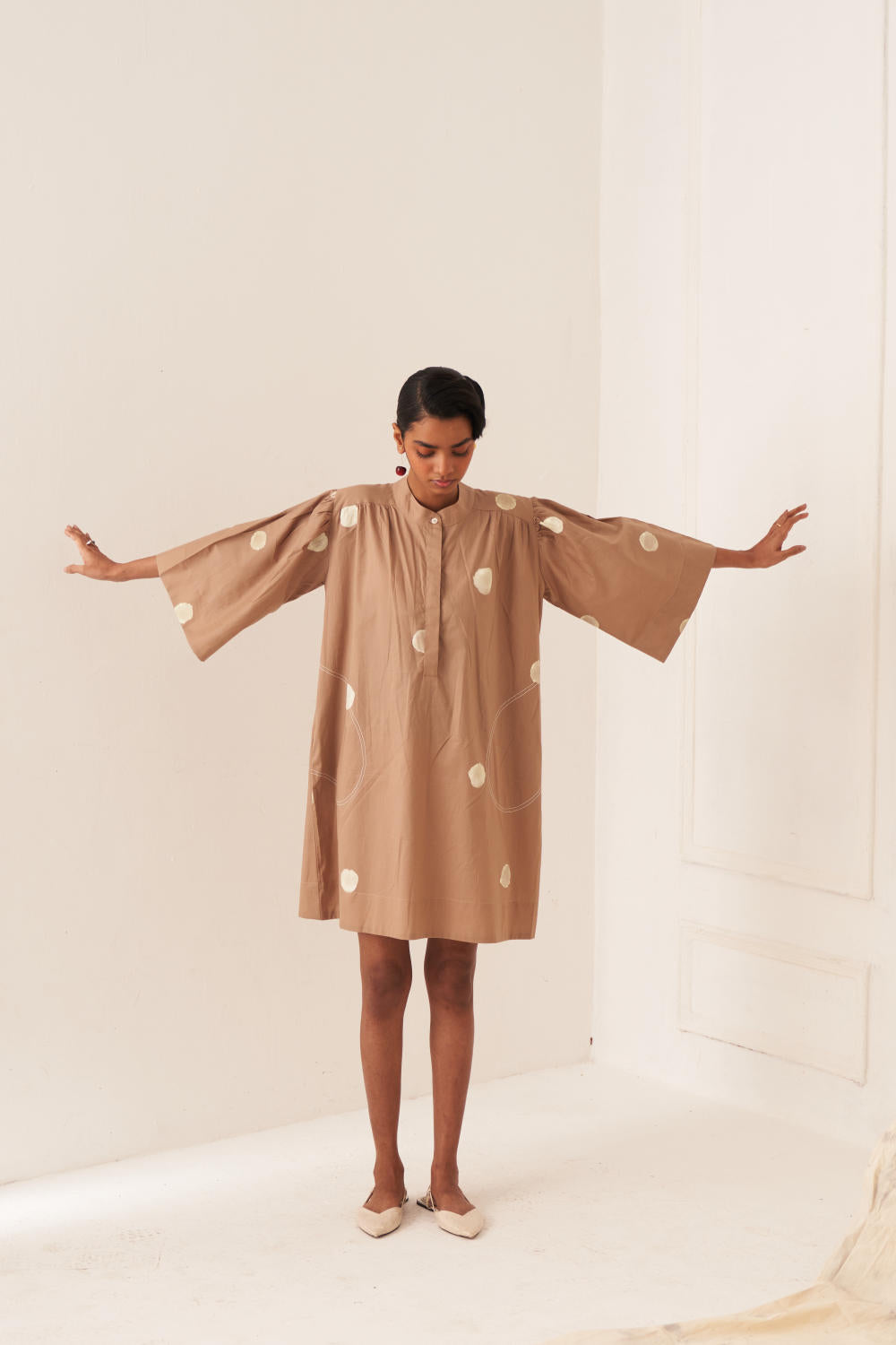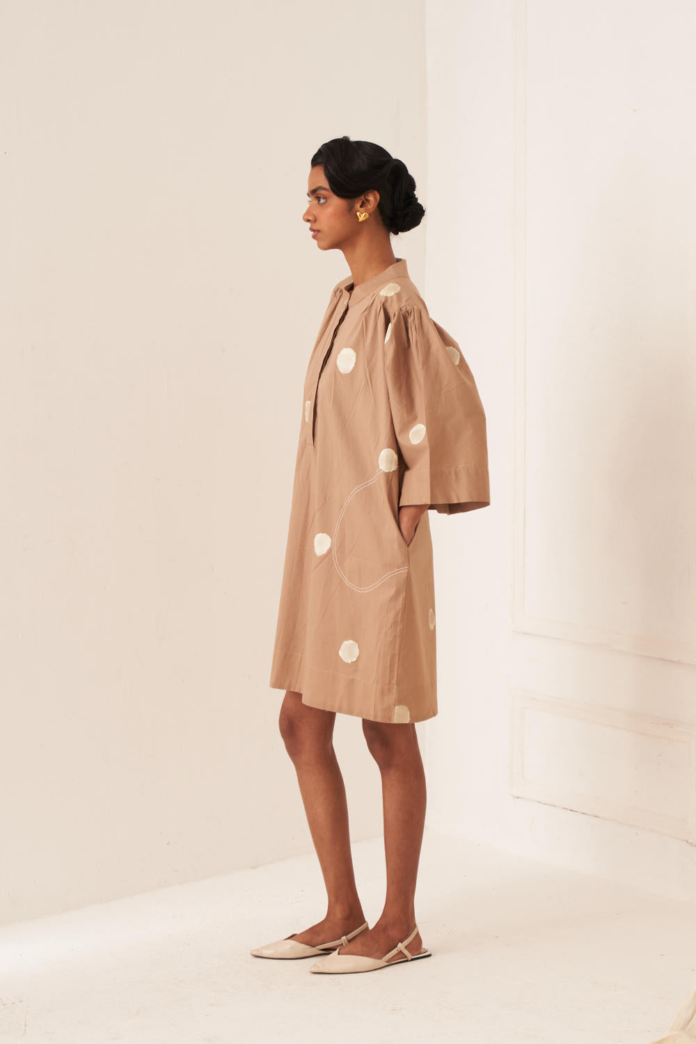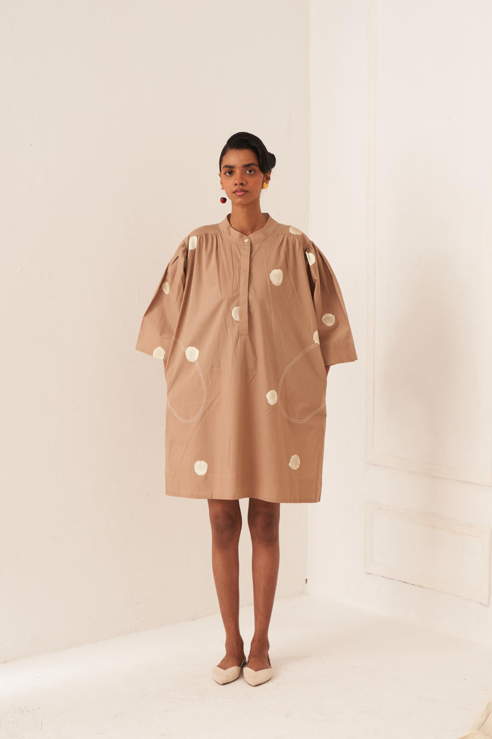 Dress/Kurta: Anti–fit dress with a hand-painted polka featuring U–shaped pockets & top–stitch details. Designed with a mandarin collar (half placket) and gathers at the shoulder and sleeves, finished with a vintage coin at the back yoke. Print placement will vary - single piece. Model is wearing size S.