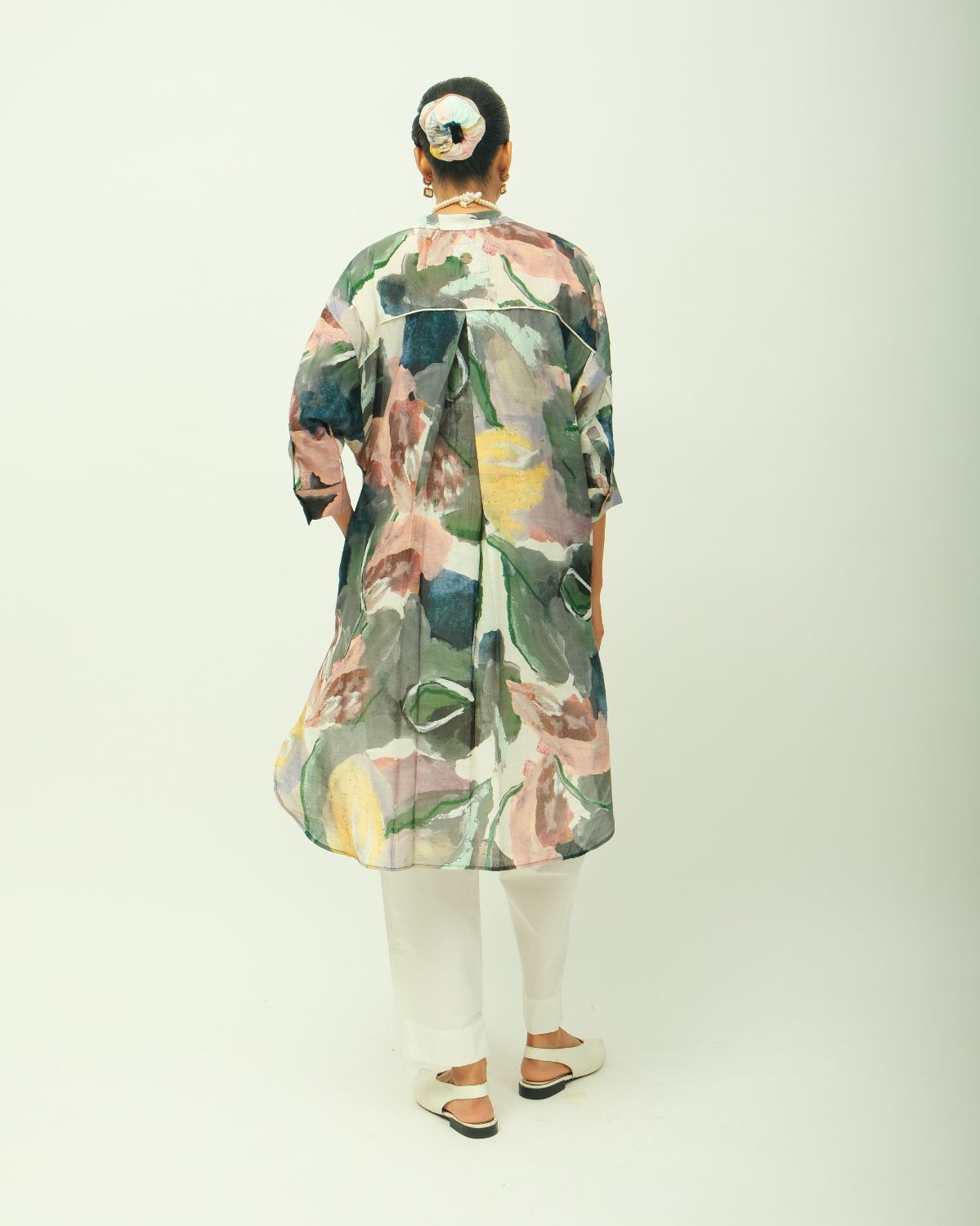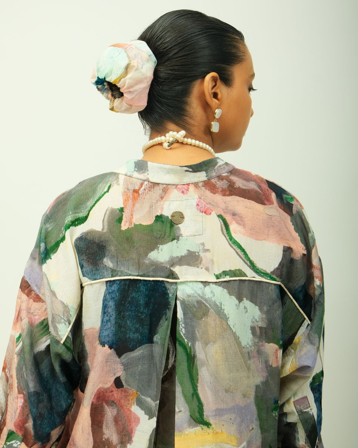 Top: Anti fit, band collar, V-neckline, full sleeves, hand-painted abstract expressionist digitally transferred print, relaxed fit, perfect for effortless style, side pockets. Ideal for casual outings, lunch. Print placement may vary- Single piece.