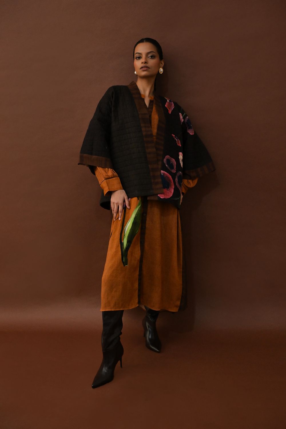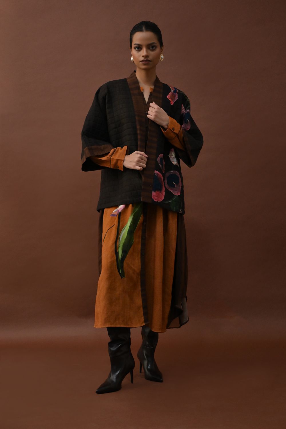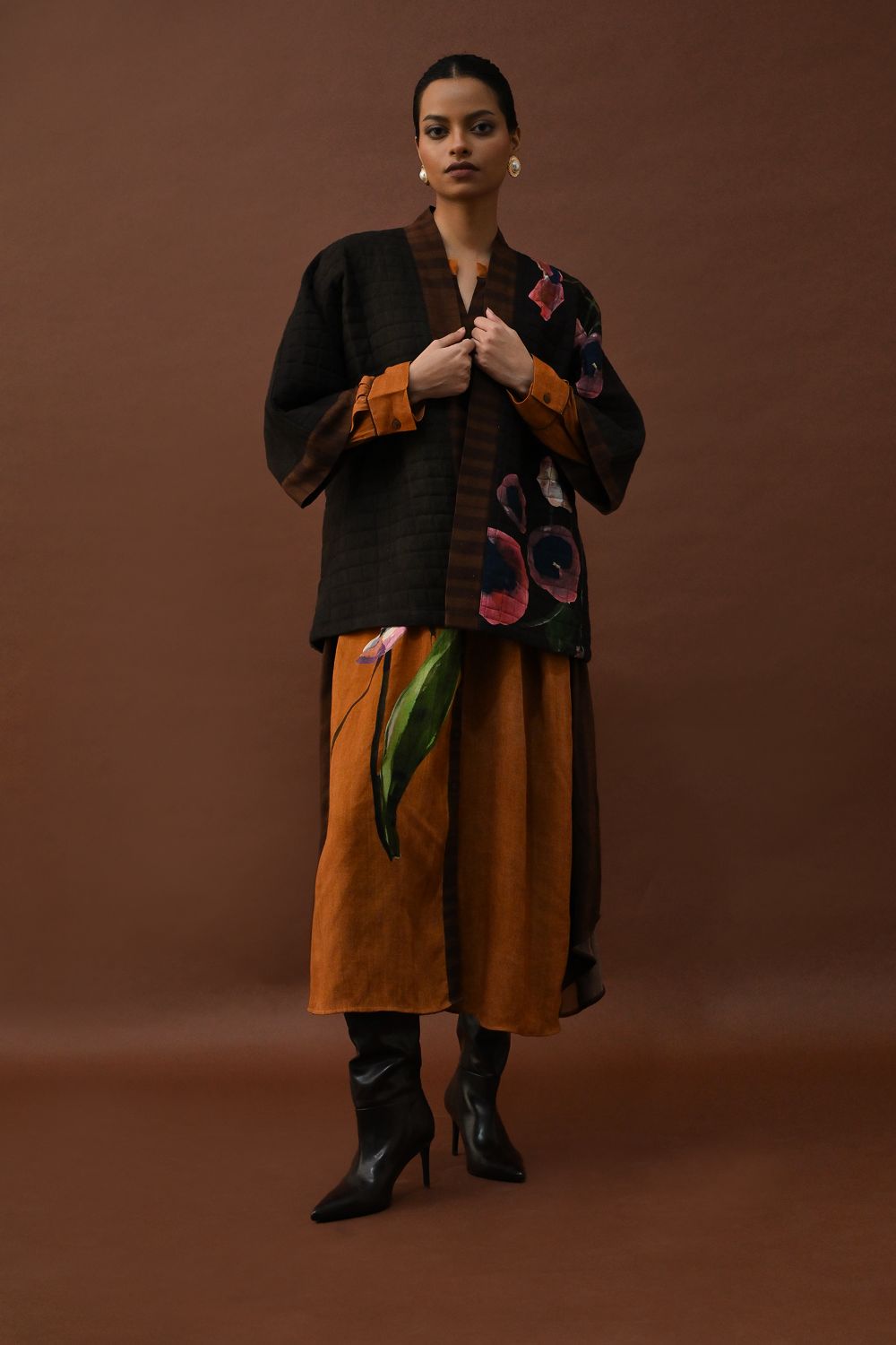 Jacket: A handcrafted quilted jacket featuring a vibrant floral hand-painted pattern on a textured grid base. Designed with a relaxed, open-front silhouette and a contrasting striped lapel.