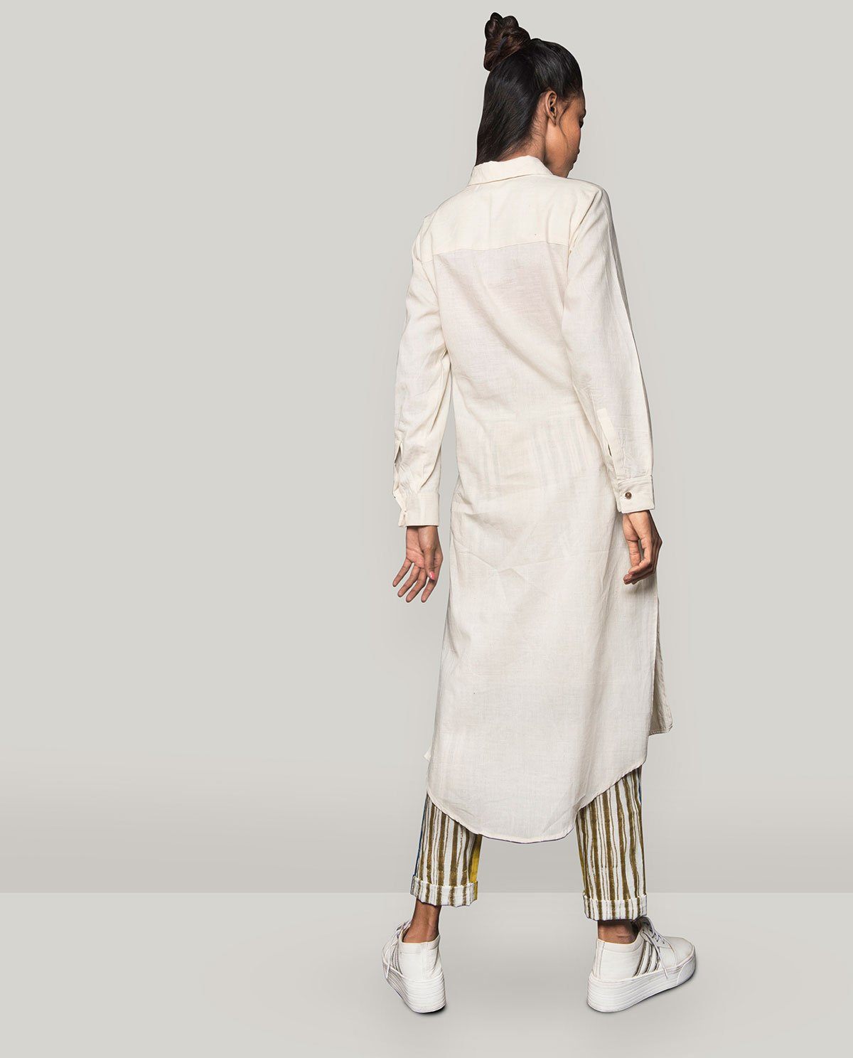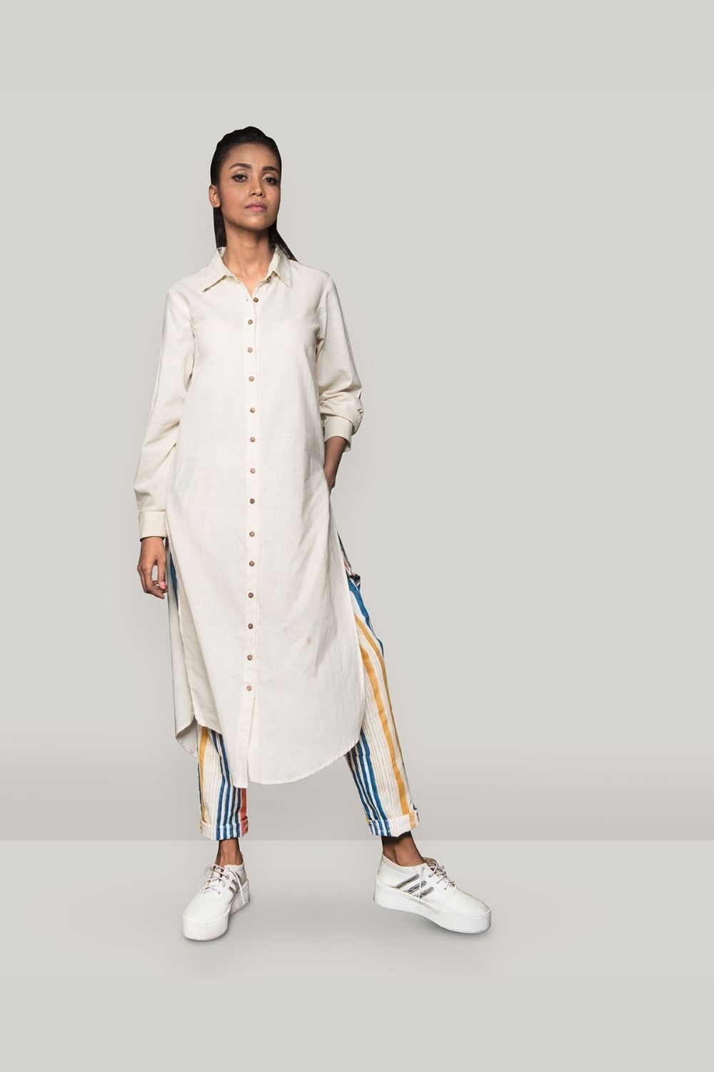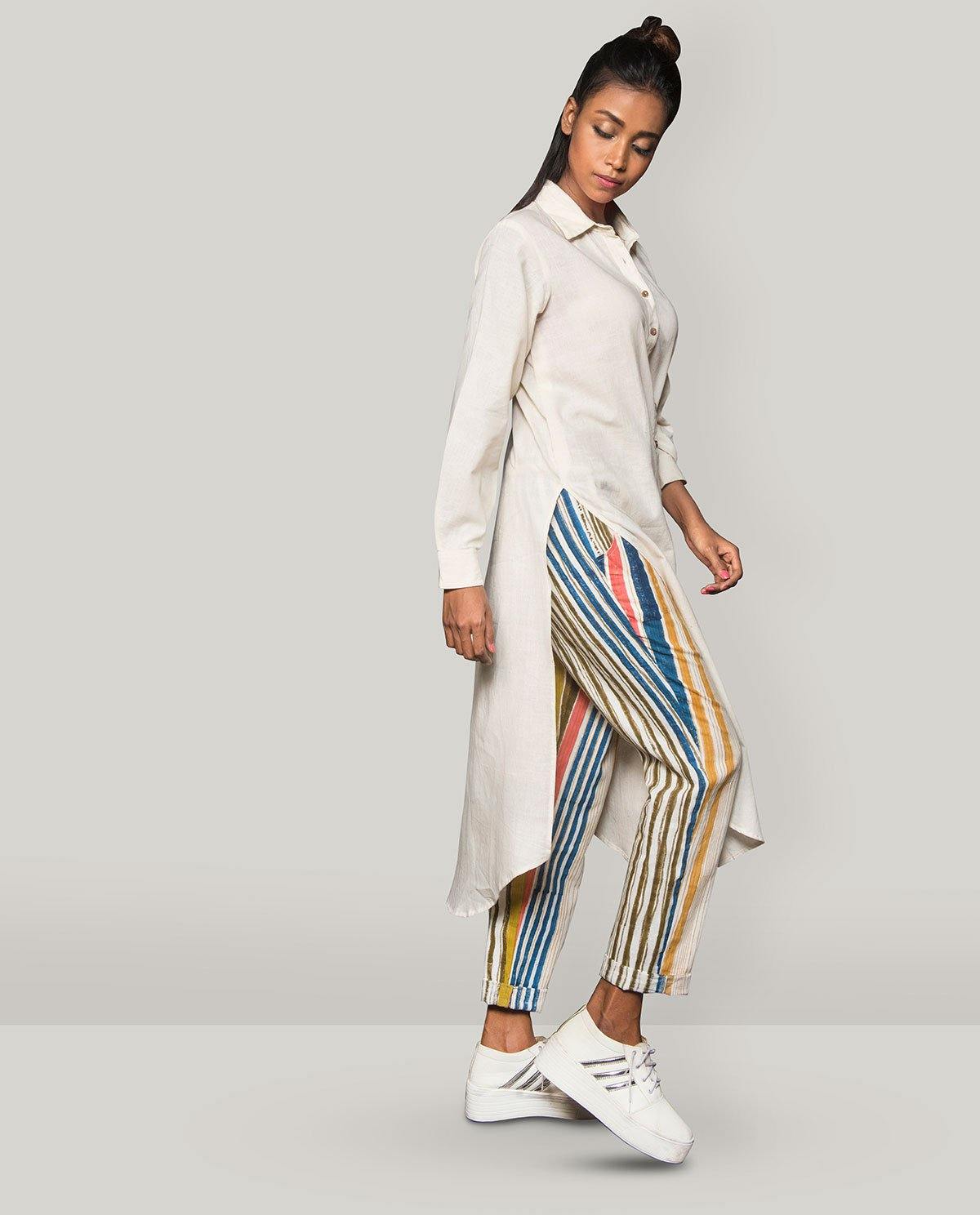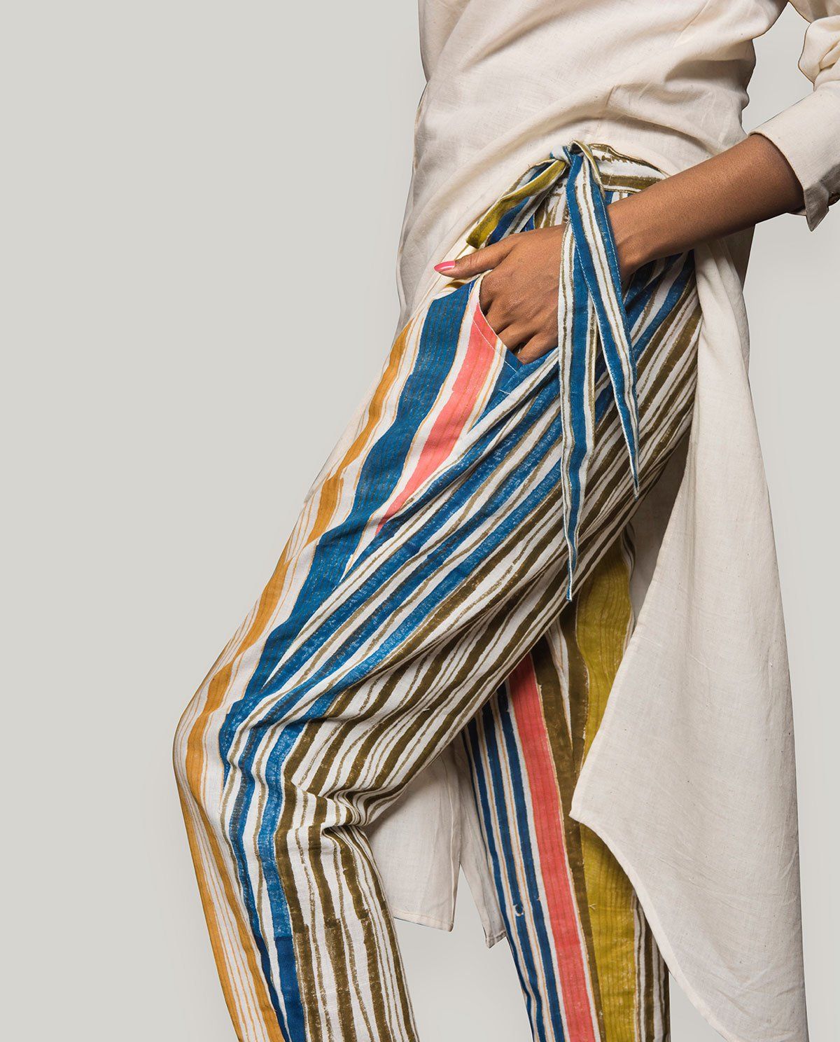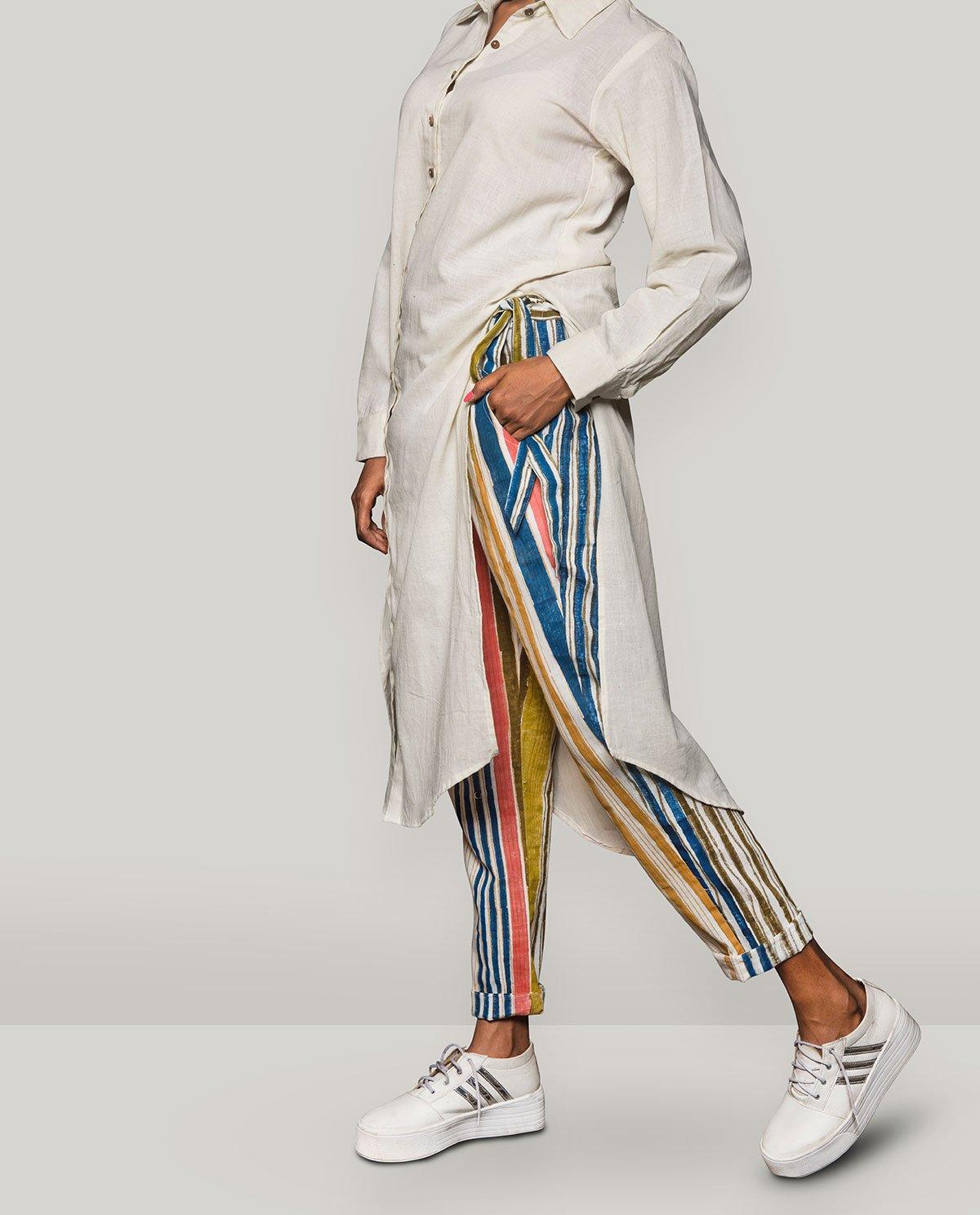 Long collared shirt with long sleeves. Features an A-line silhouette with side vents at the hem and contrasting wooden buttons in the front, teamed up with hand blocked printed stripes knotted ankle pants.