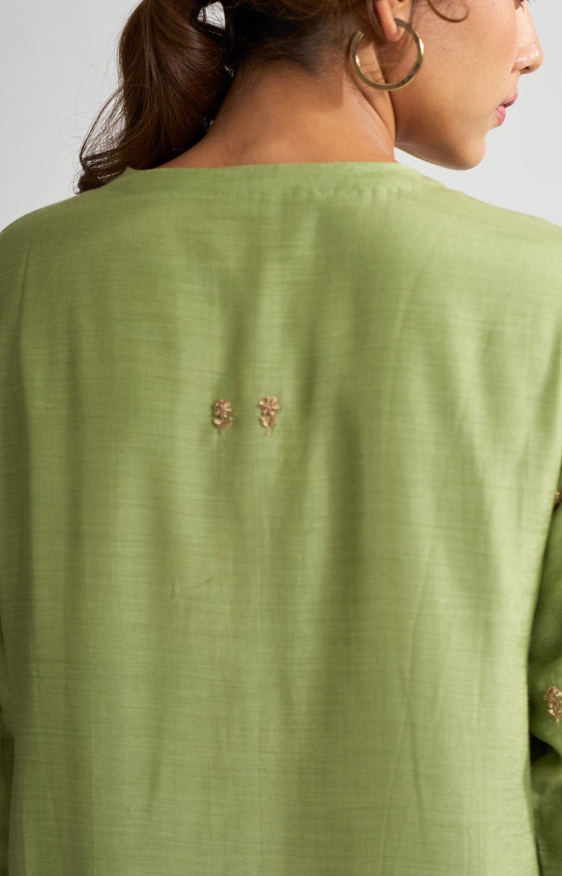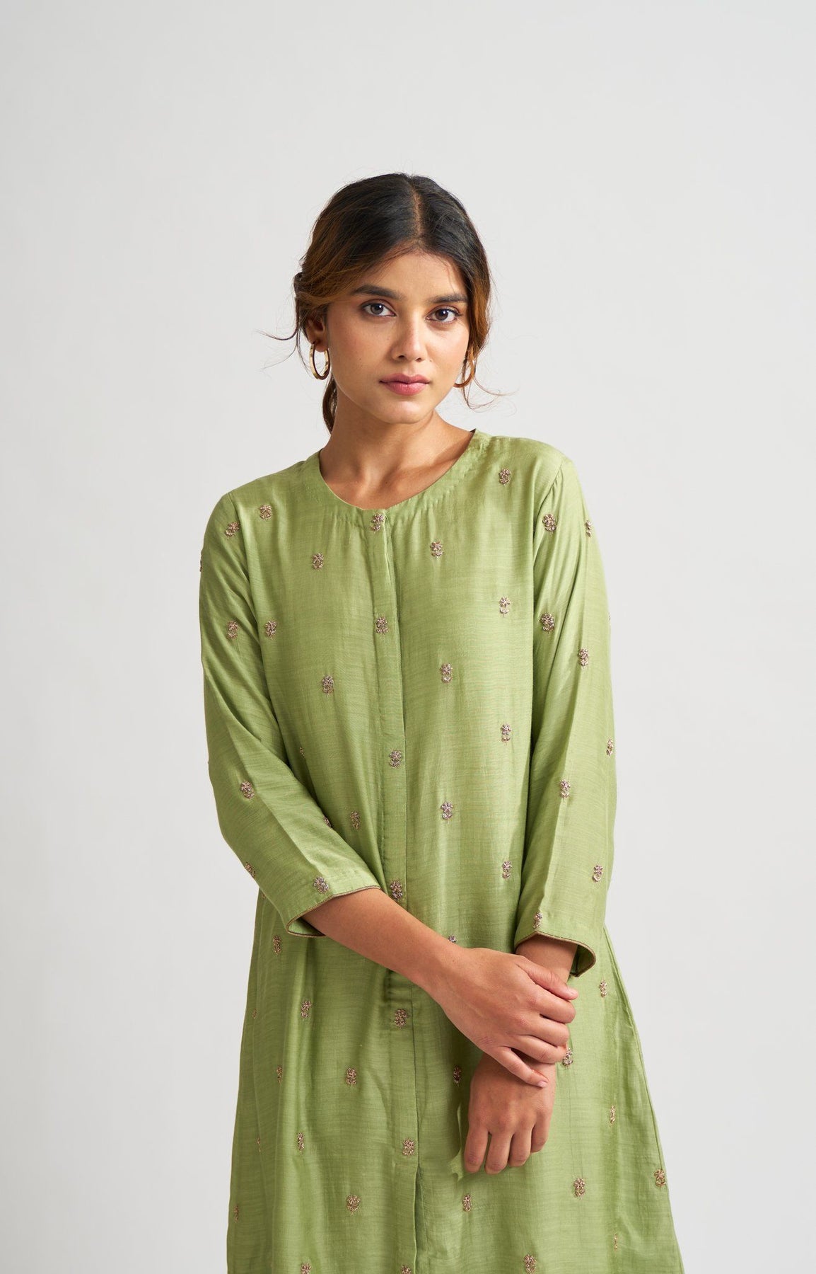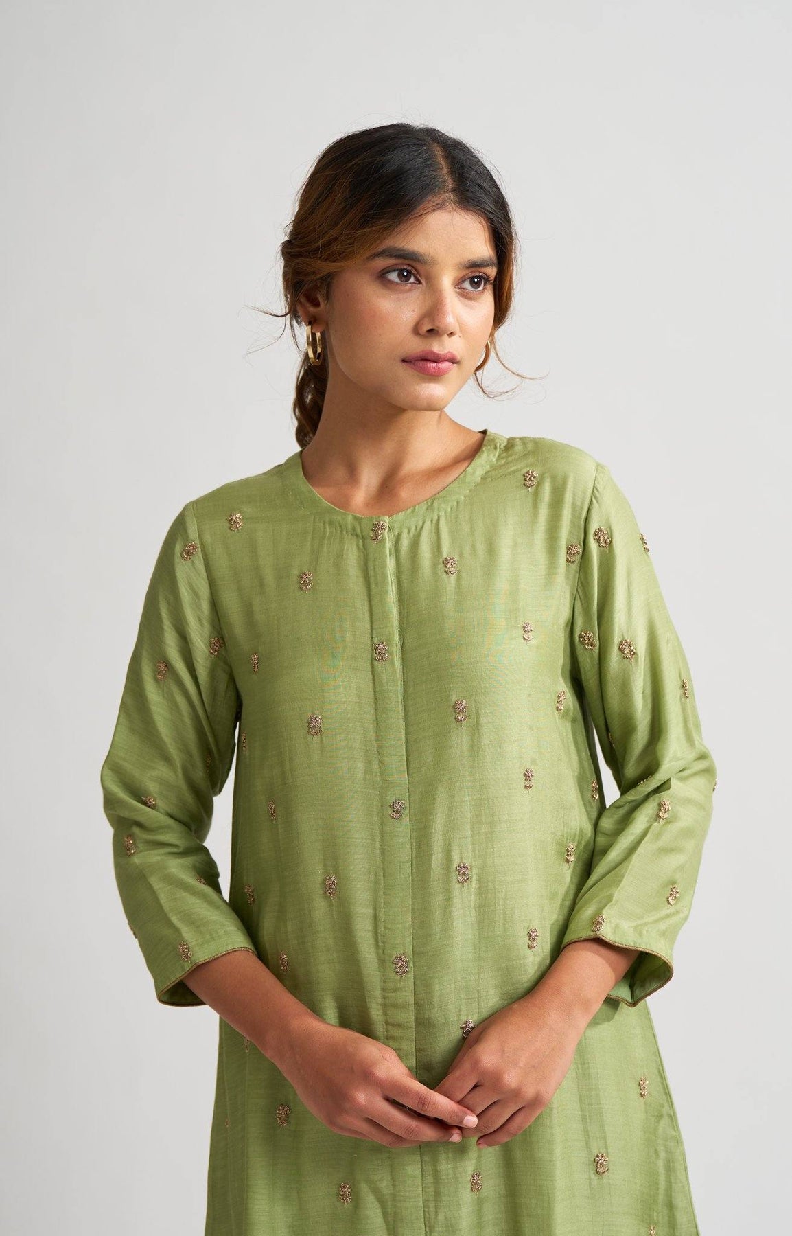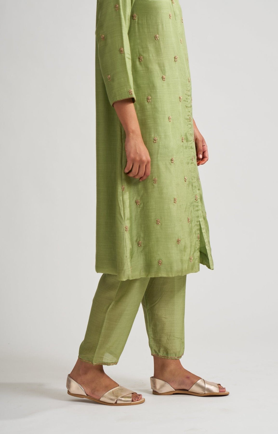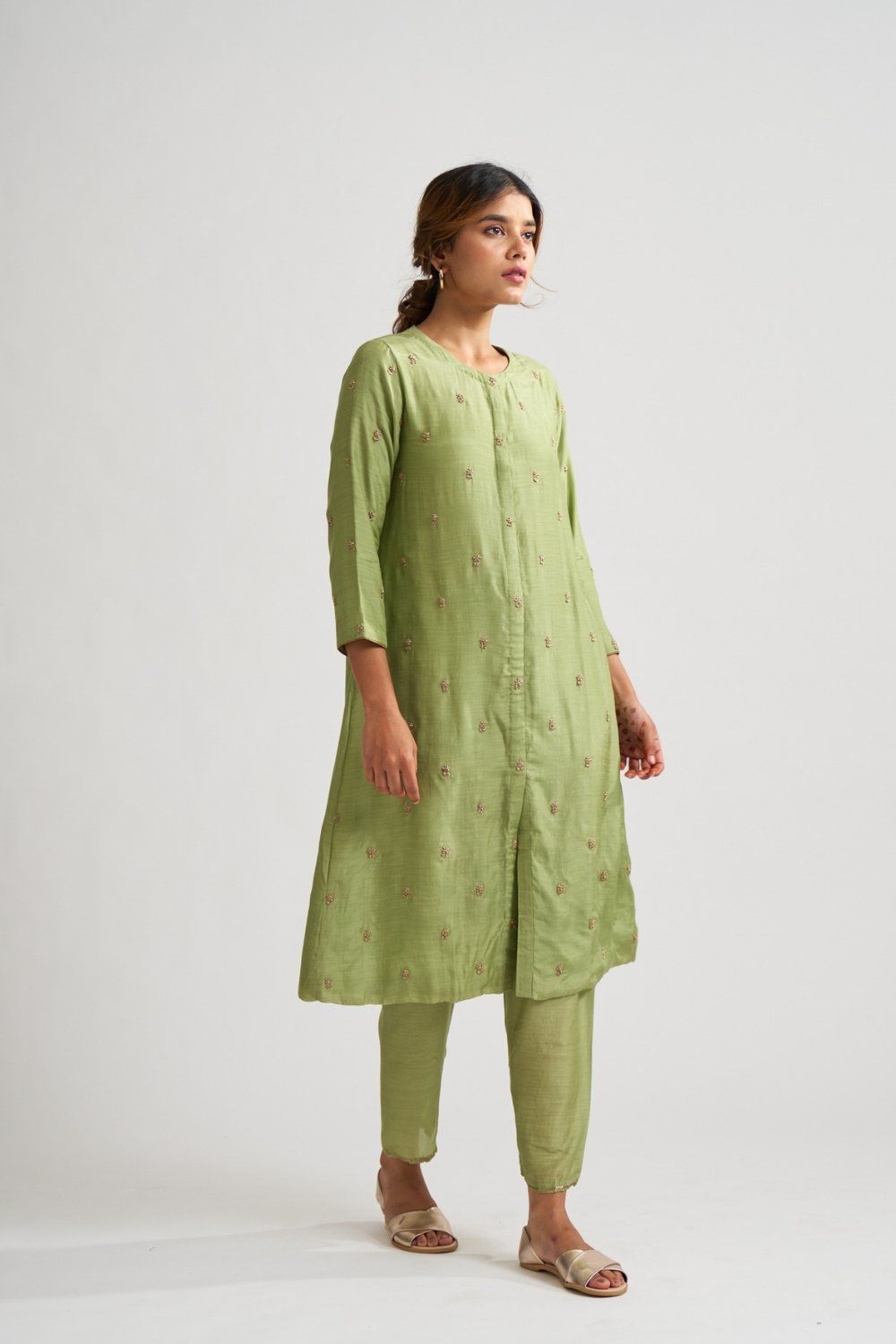 Rohita kurta set is a perfect blend of contemporary fashion and traditional roots. Its a two piece garment made in cotton silk. It's embellished with delicate hand embroidered buds of flowers. The motif is made with dabka and the intricacy of french knots made in zari.