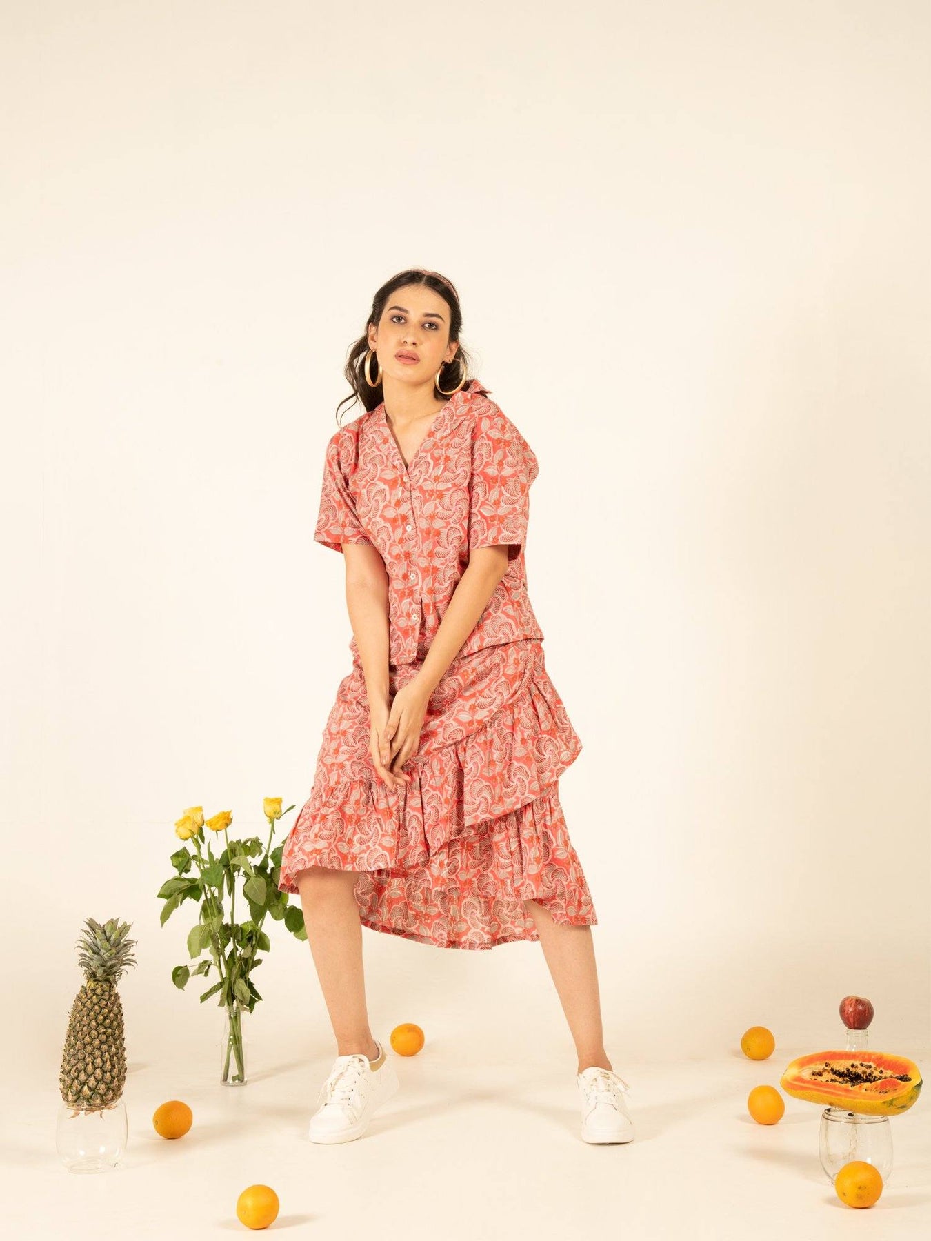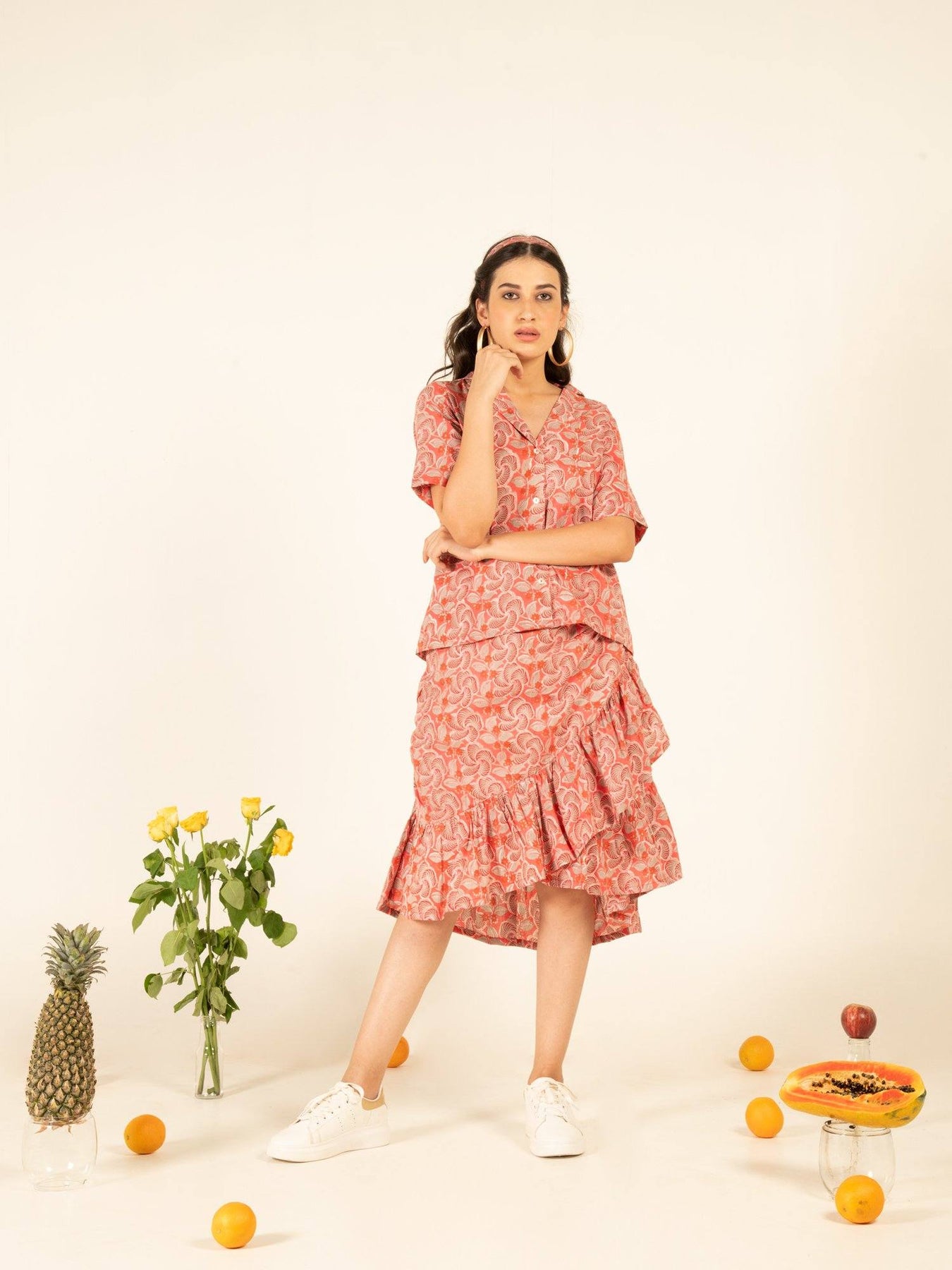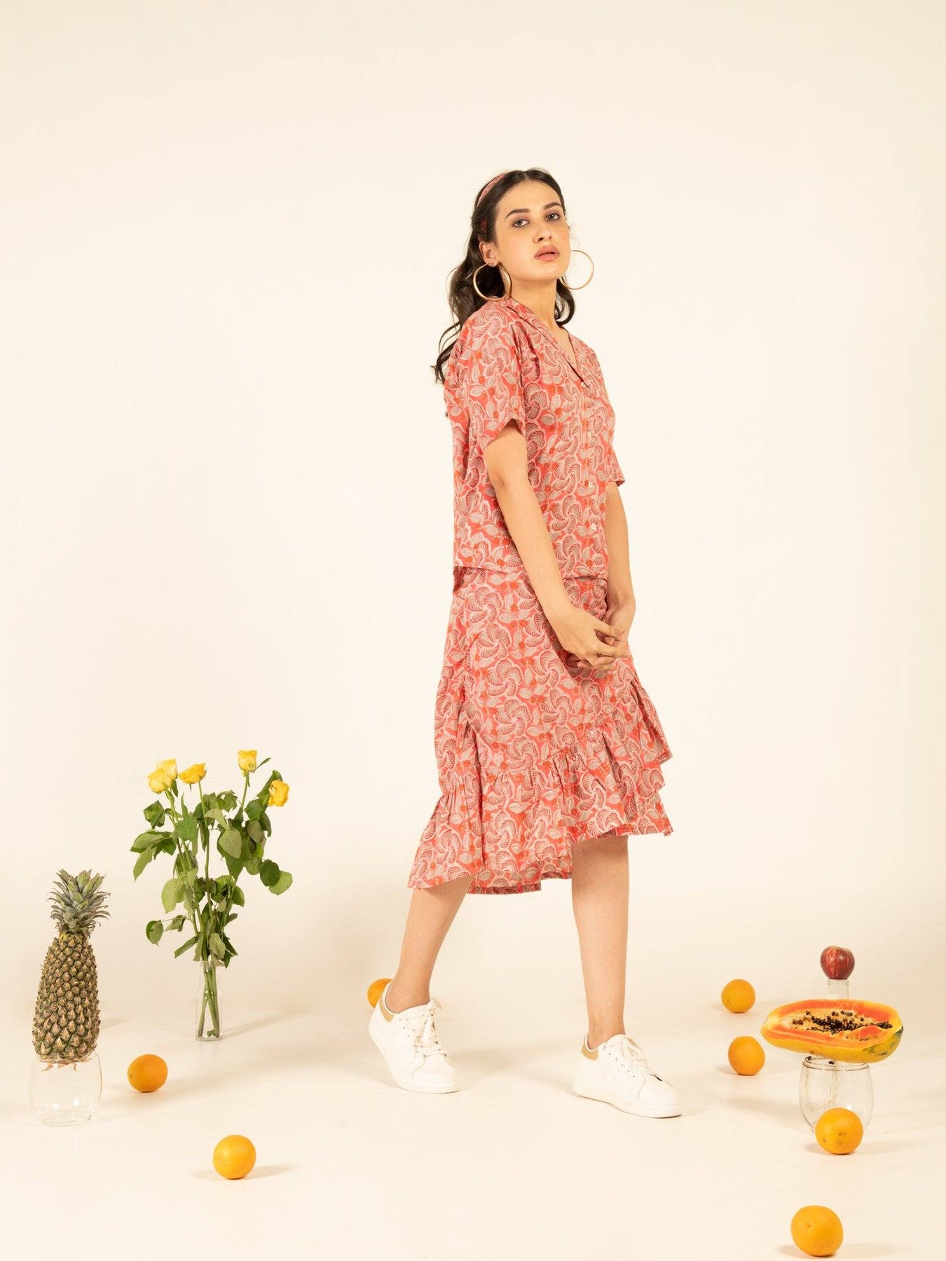 Chic co-ord set with afro-inspired blooms hand printed on a cotton base. Ruffle detailed skirt with shirt style button up top. Perfect companion for those beach holidays.