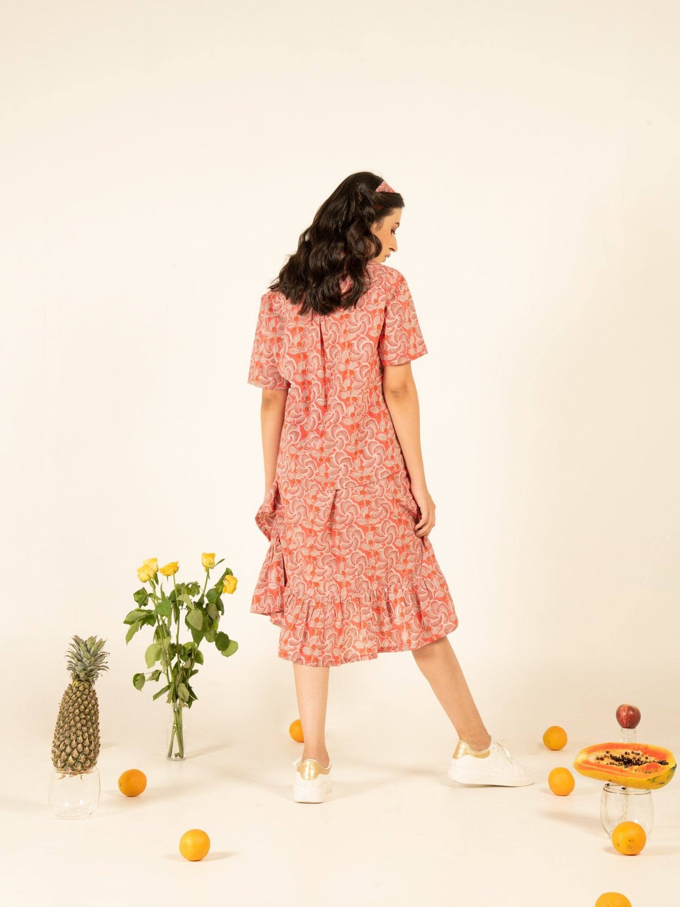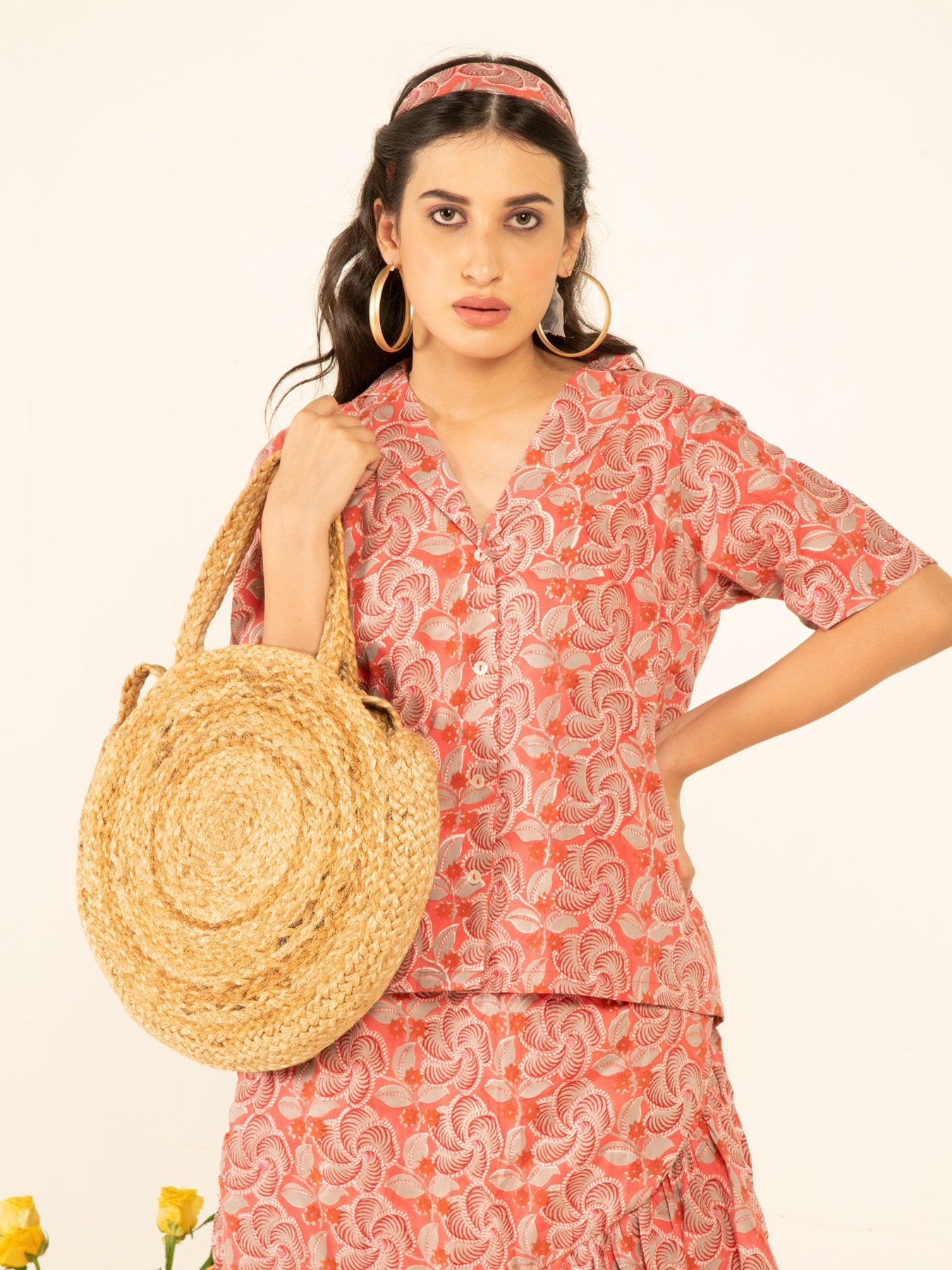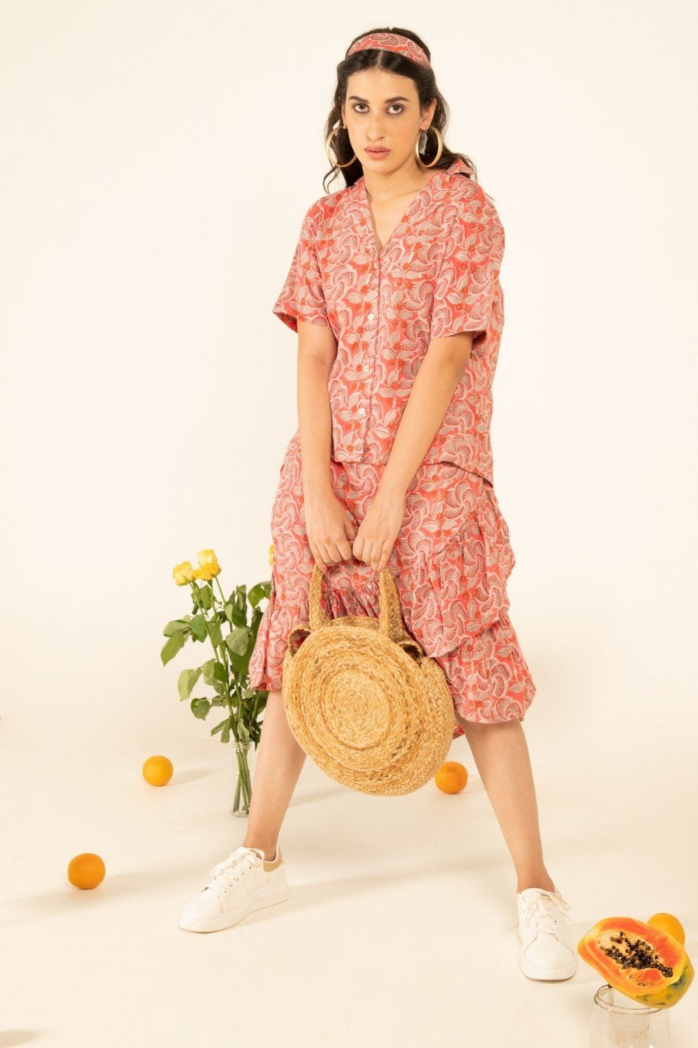 Chic co-ord set with afro-inspired blooms hand printed on a cotton base. Ruffle detailed skirt with shirt style button up top. Perfect companion for those beach holidays.