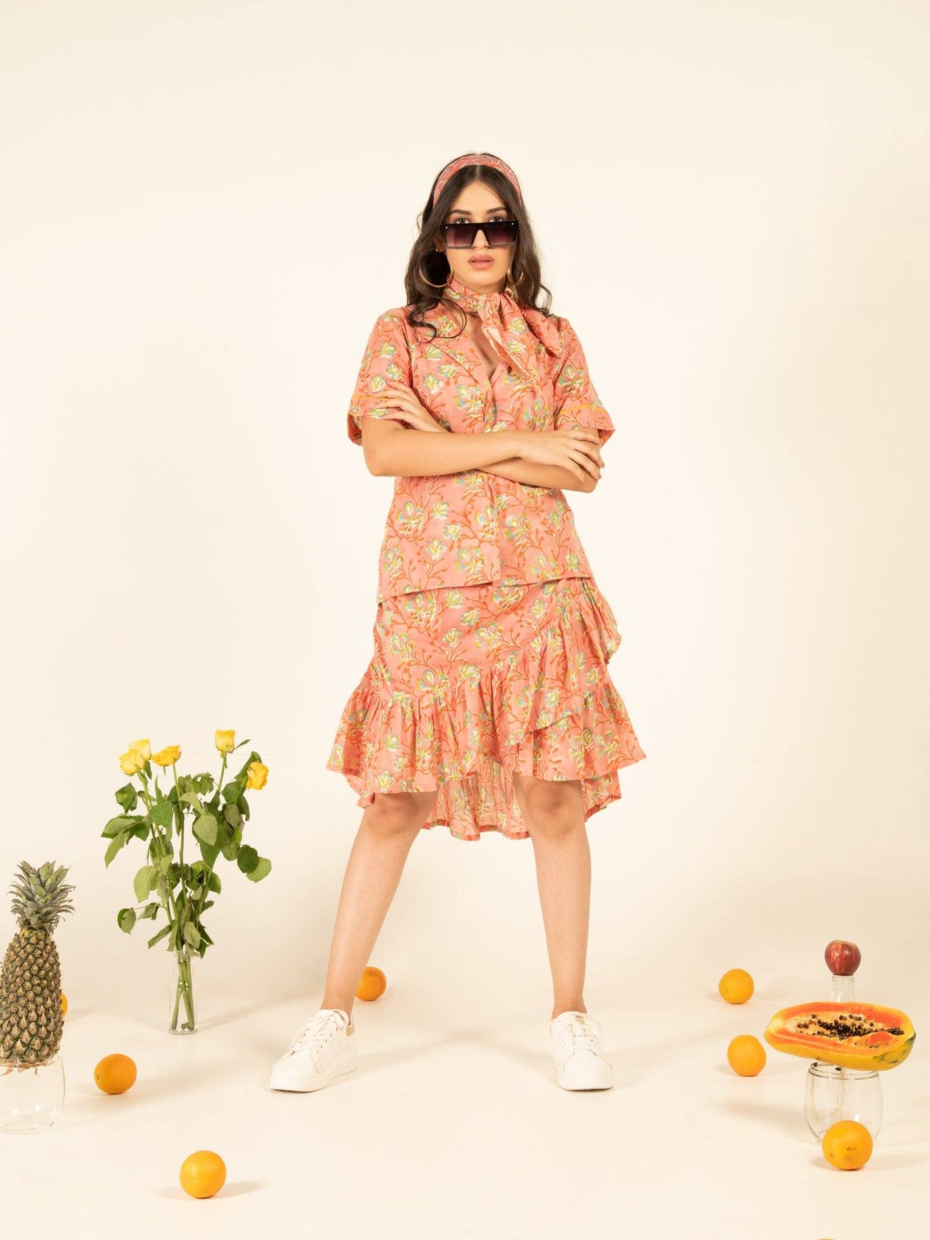 Chic co-ord set with afro-inspired blooms hand printed on a cotton base. Ruffle detailed skirt with shirt style button up top. Perfect companion for those beach holidays.