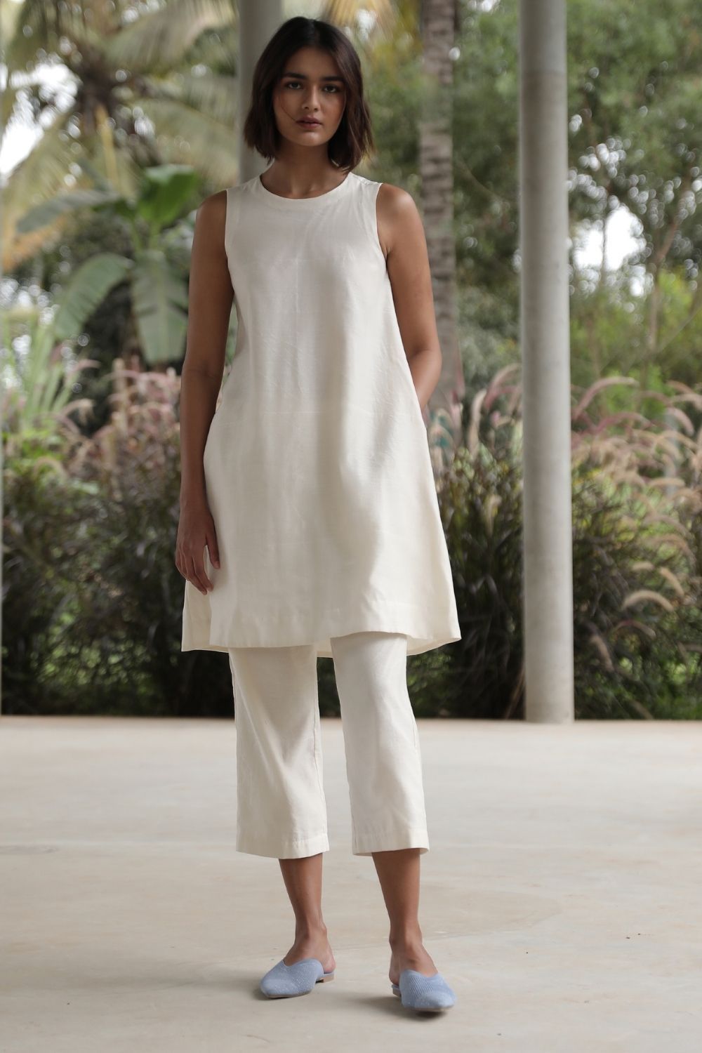 Paired with easy, crop pants. Elasticated waist. In-seam pockets. Fully lined.