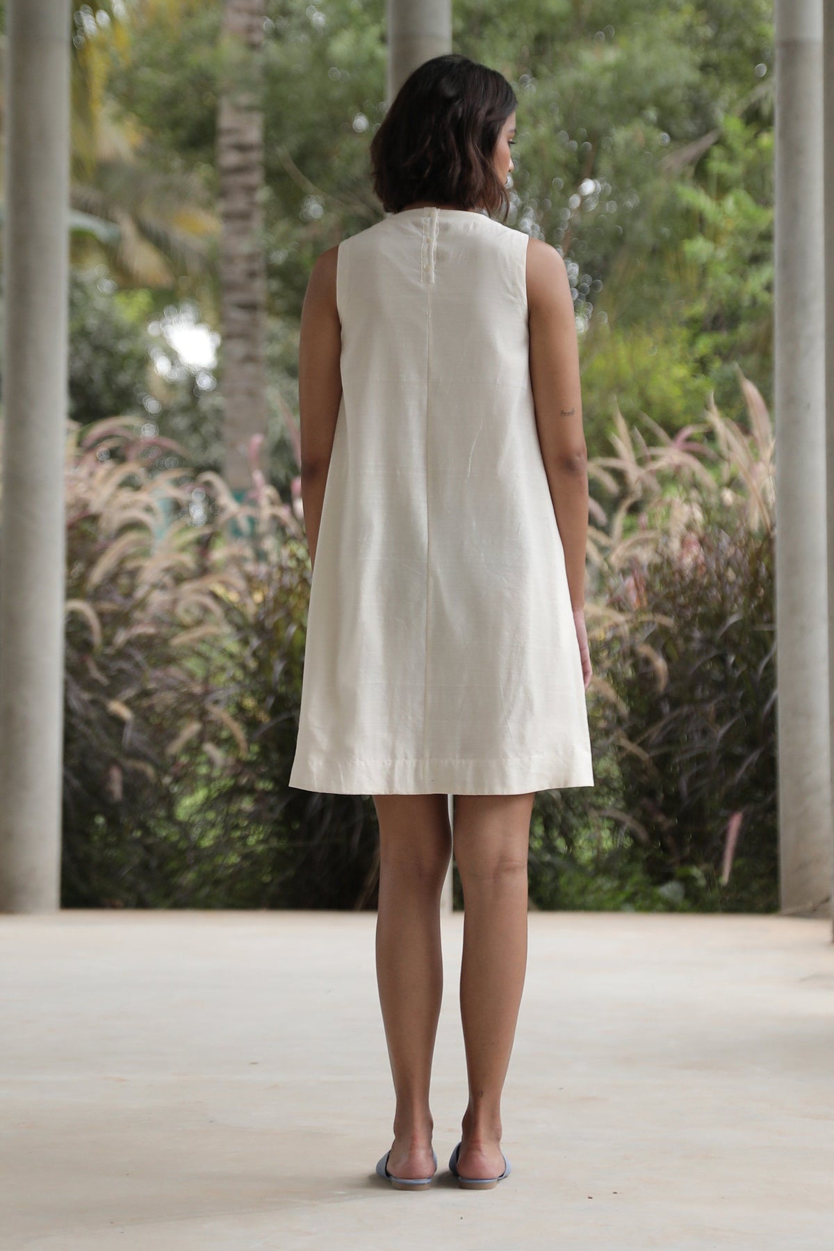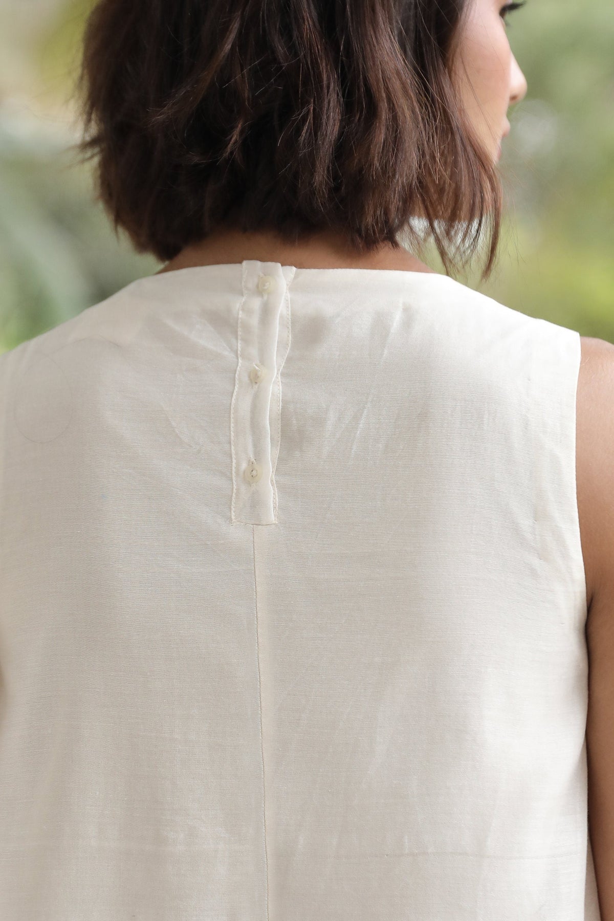 Sleeveless tunic with a close round neck. Back button fastening. In-seam pockets. Fully lined. Can be worn separately as a dress.