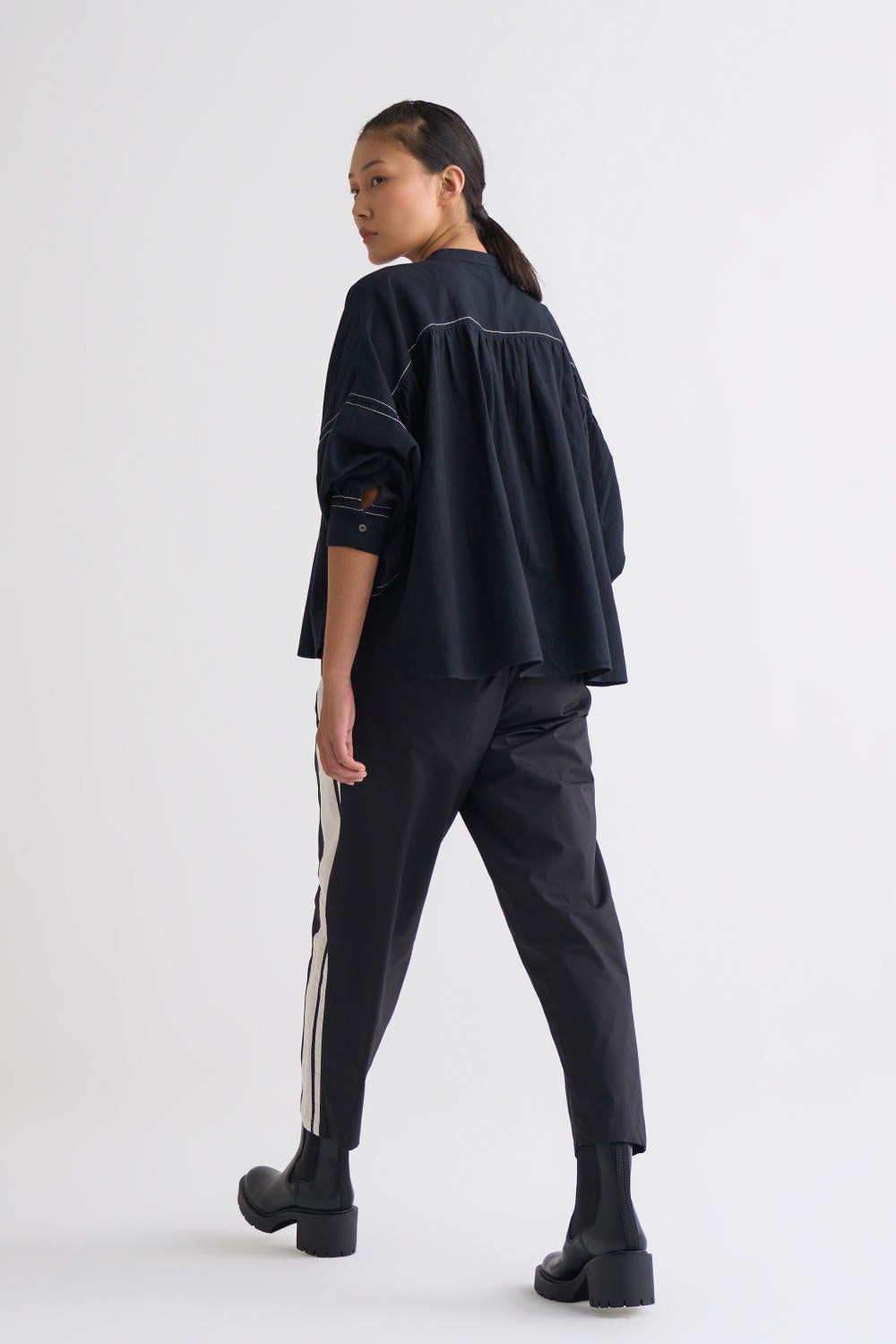 Clever cuts, asymmetric patterns, a neutral palette and simplicity of geometric details form the core aesthetic of the brand. Their love for asymmetry and imperfection clearly reflects in their silhouettes and hemlines. The label is a modern mix of conceptual and wearable clothing which defies age bar as the ensembles exude comfort, more so with their signature anti-fit coords.