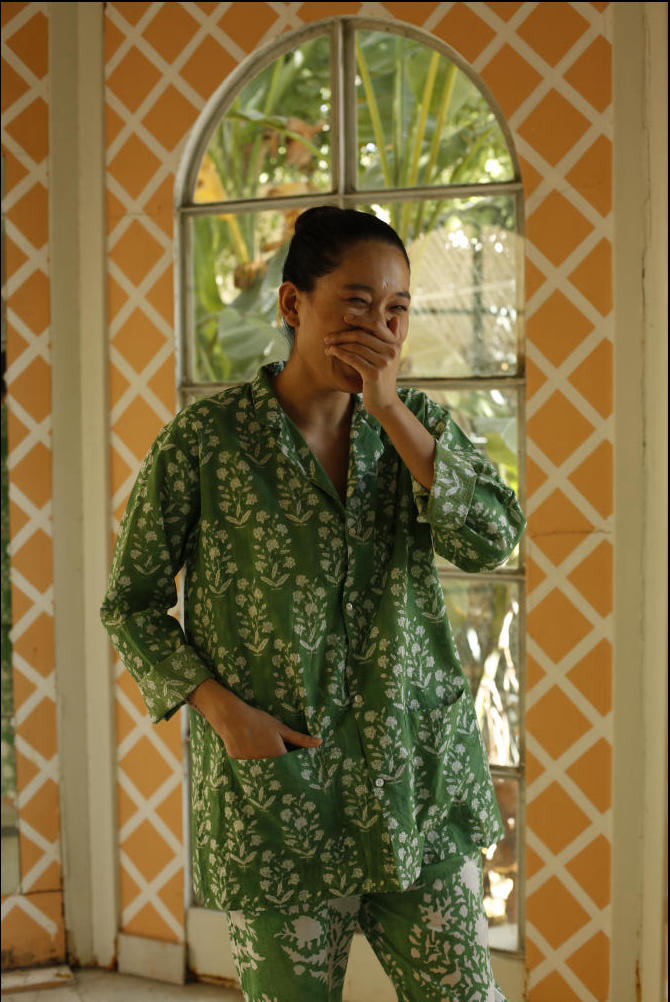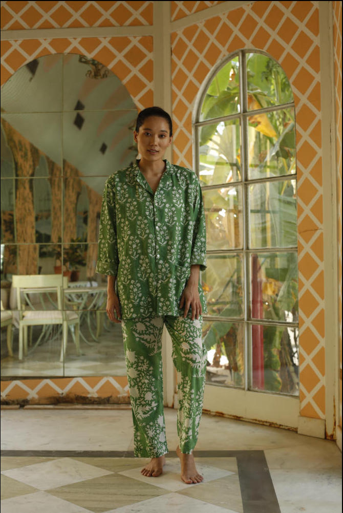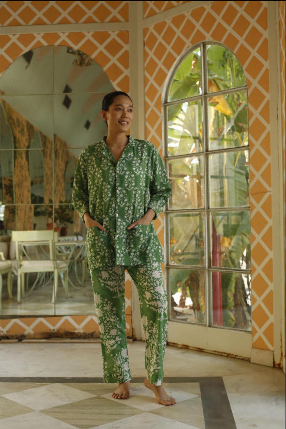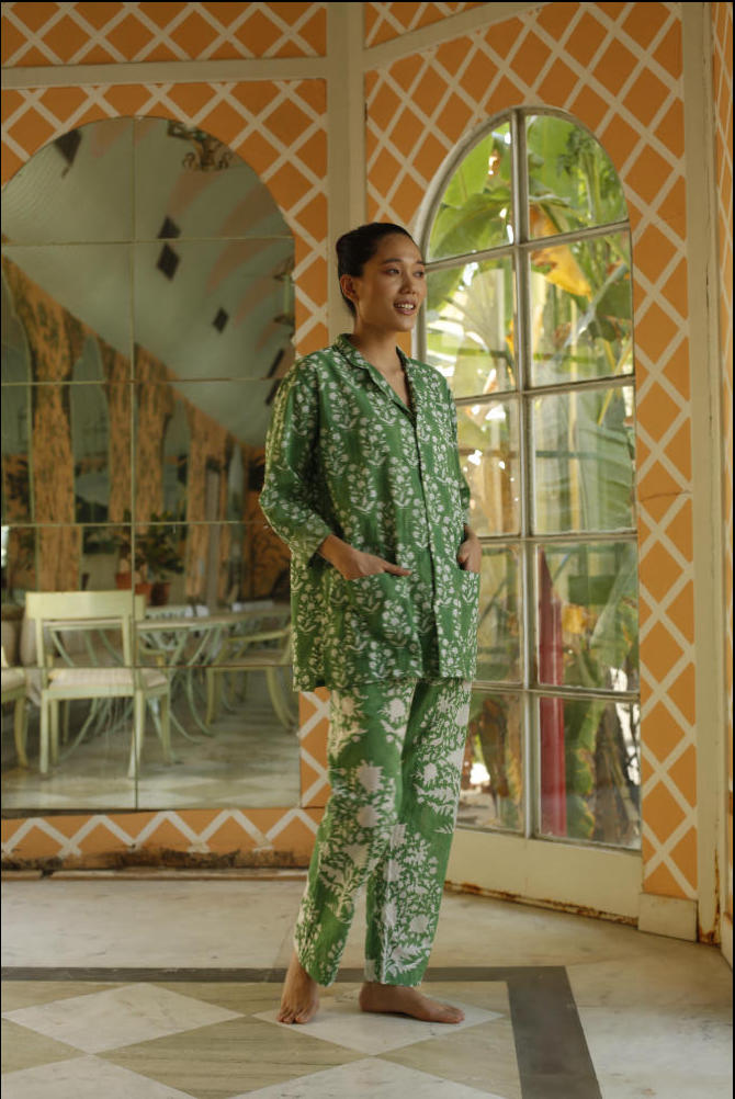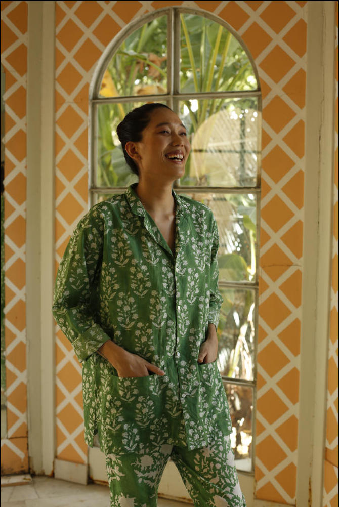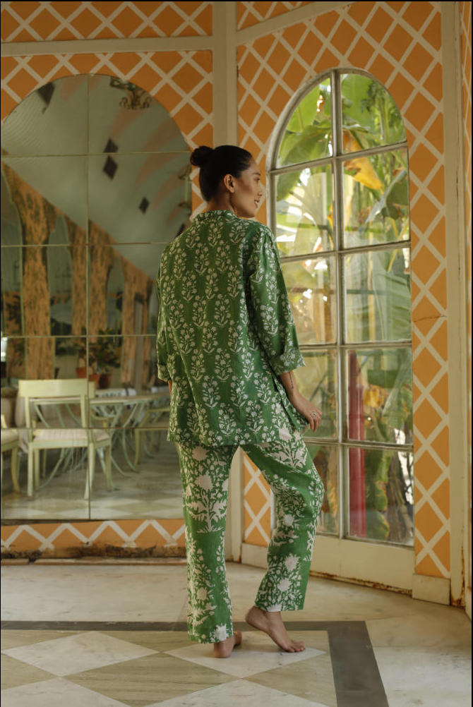 Hand block printed co-ord set in cotton mulmul. These have been printed by our partner artisans in the neighboring printing village of Sanganer. This set has a front open shirt with hand hemmed mother-of-pearl buttons and drawstring elasticated pajama pants.