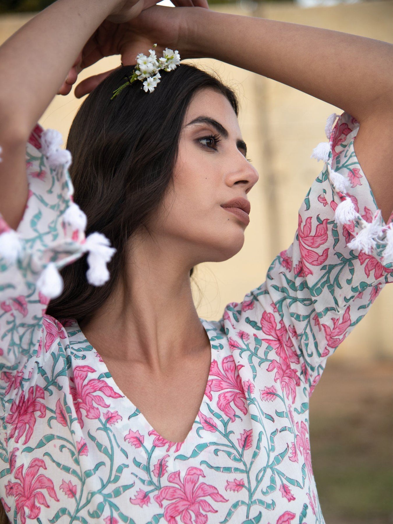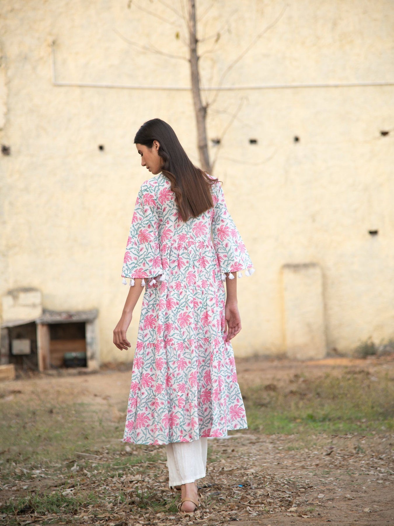 Easy, breezy floral block printed tiered kurta set. Comes with flared sleeves with lace detailing. Perfect for casual day outs or semi formal occassions. Set of 2 consists of kurta and bottom. Material- cotton NOTE- All accessories in the image are only for styling purposes and not sold along with the garment. Garment Measurements: Kurta