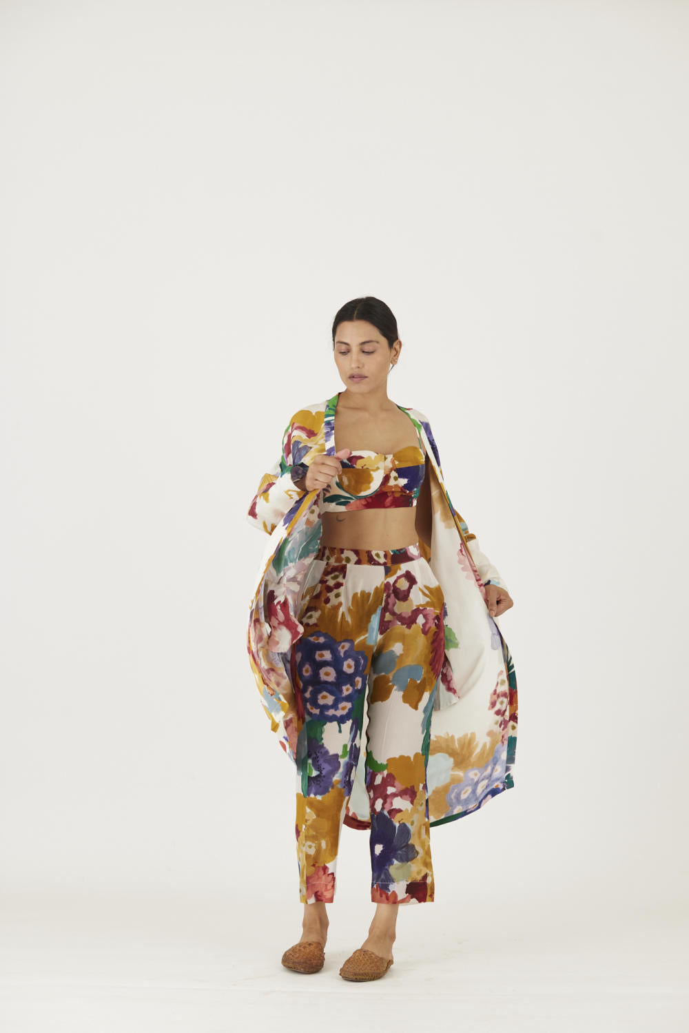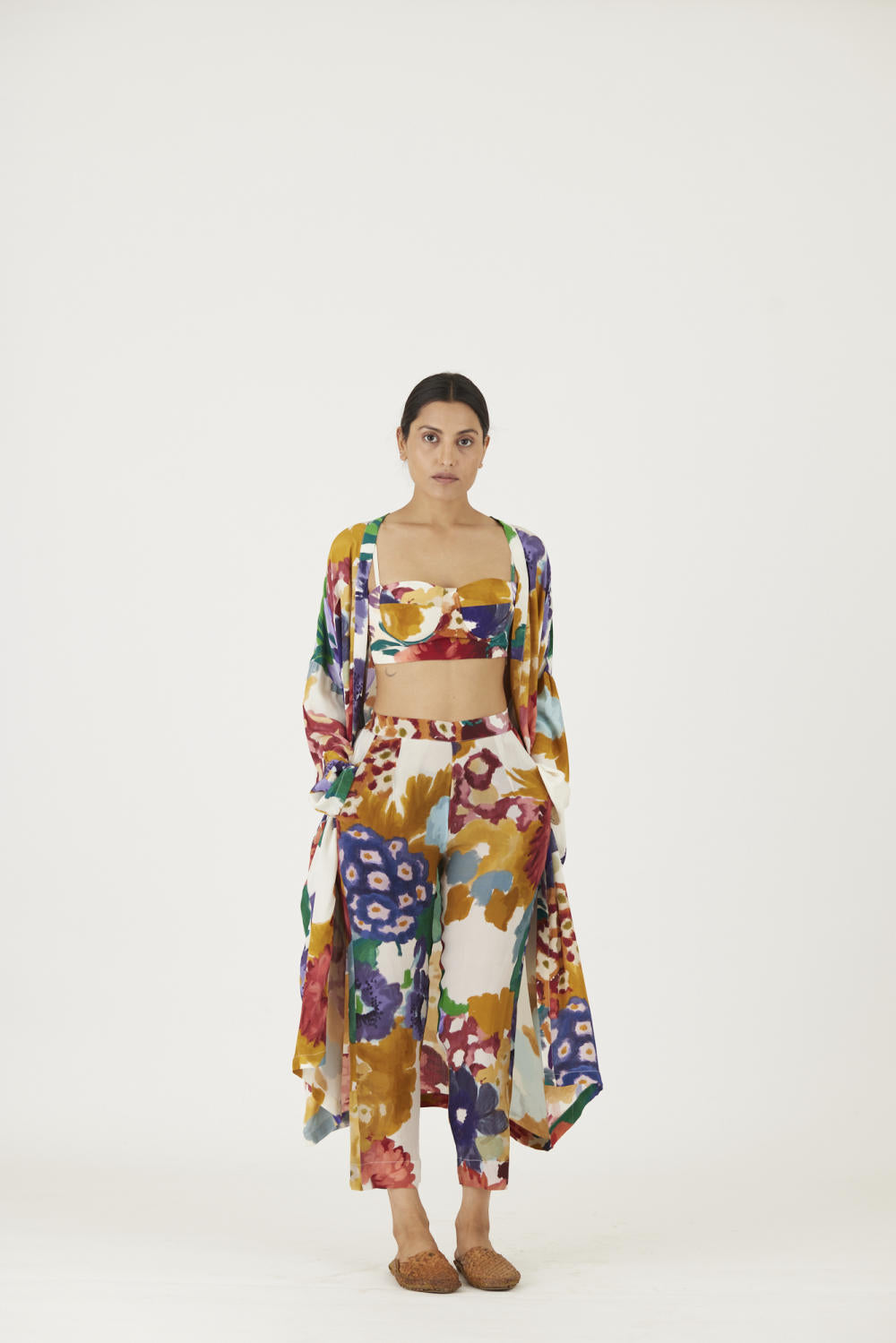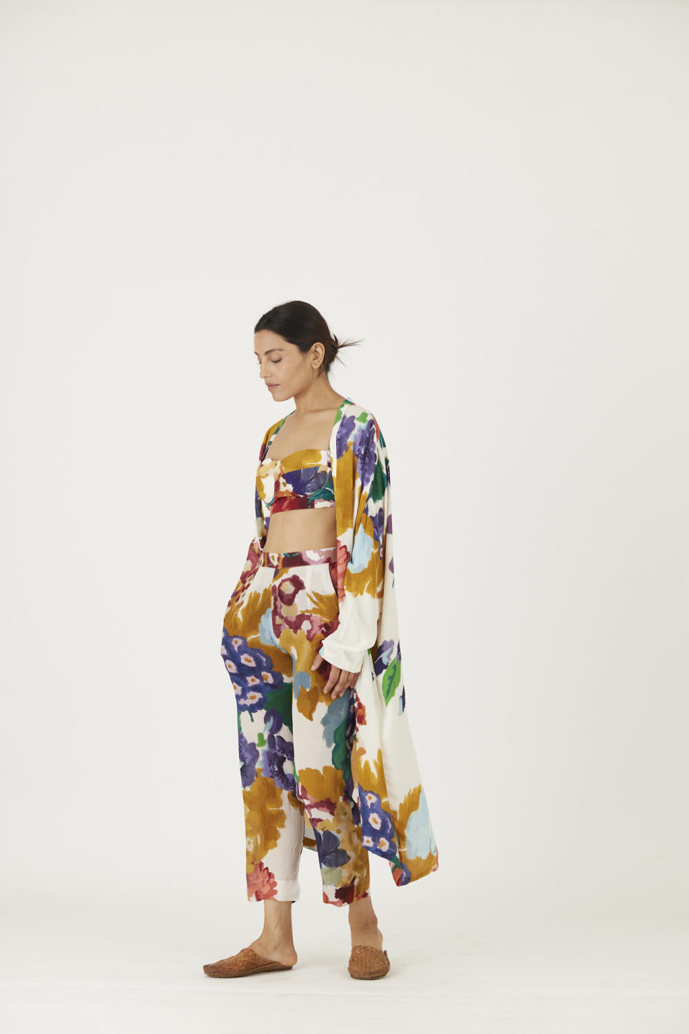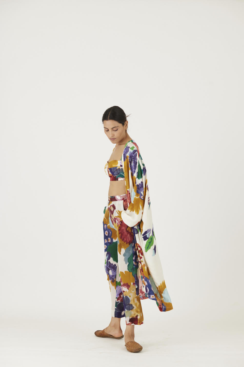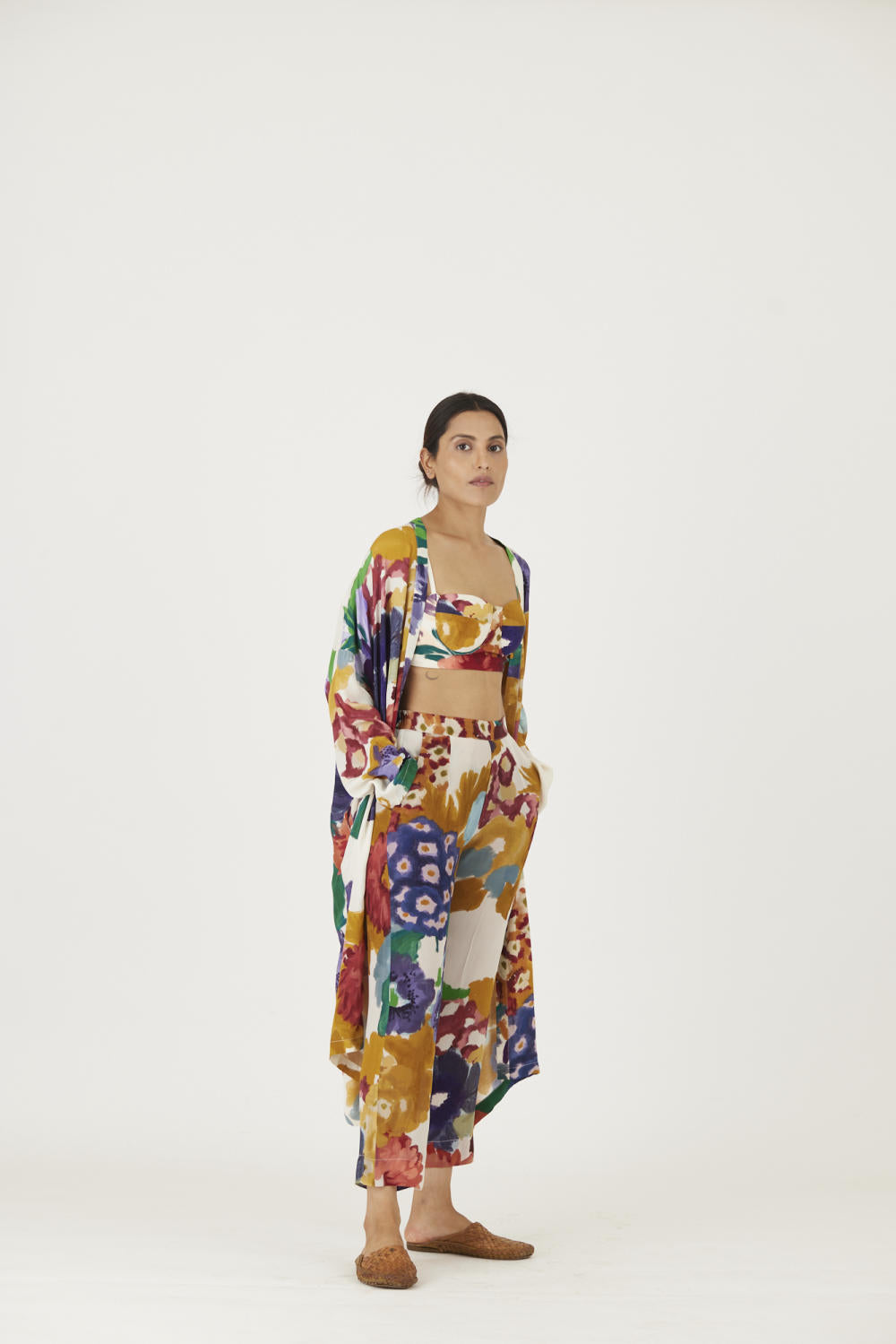 The print features an abundance of roses along with marigolds and jasmines arranged together in a bouquet . The set is crafted in the Farah print carefully printed on crepe. The set includes an oversized cape , a bralette with back elastic and straight pants.