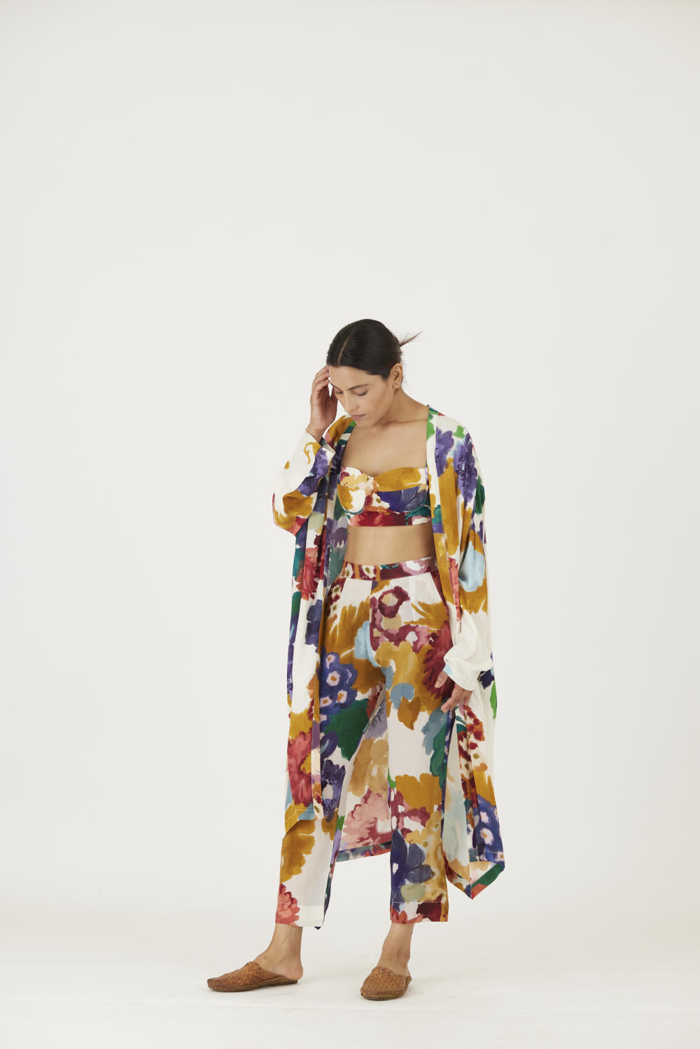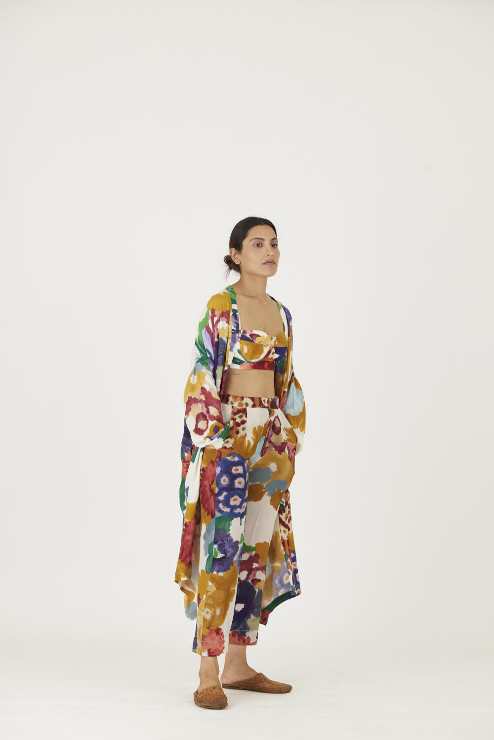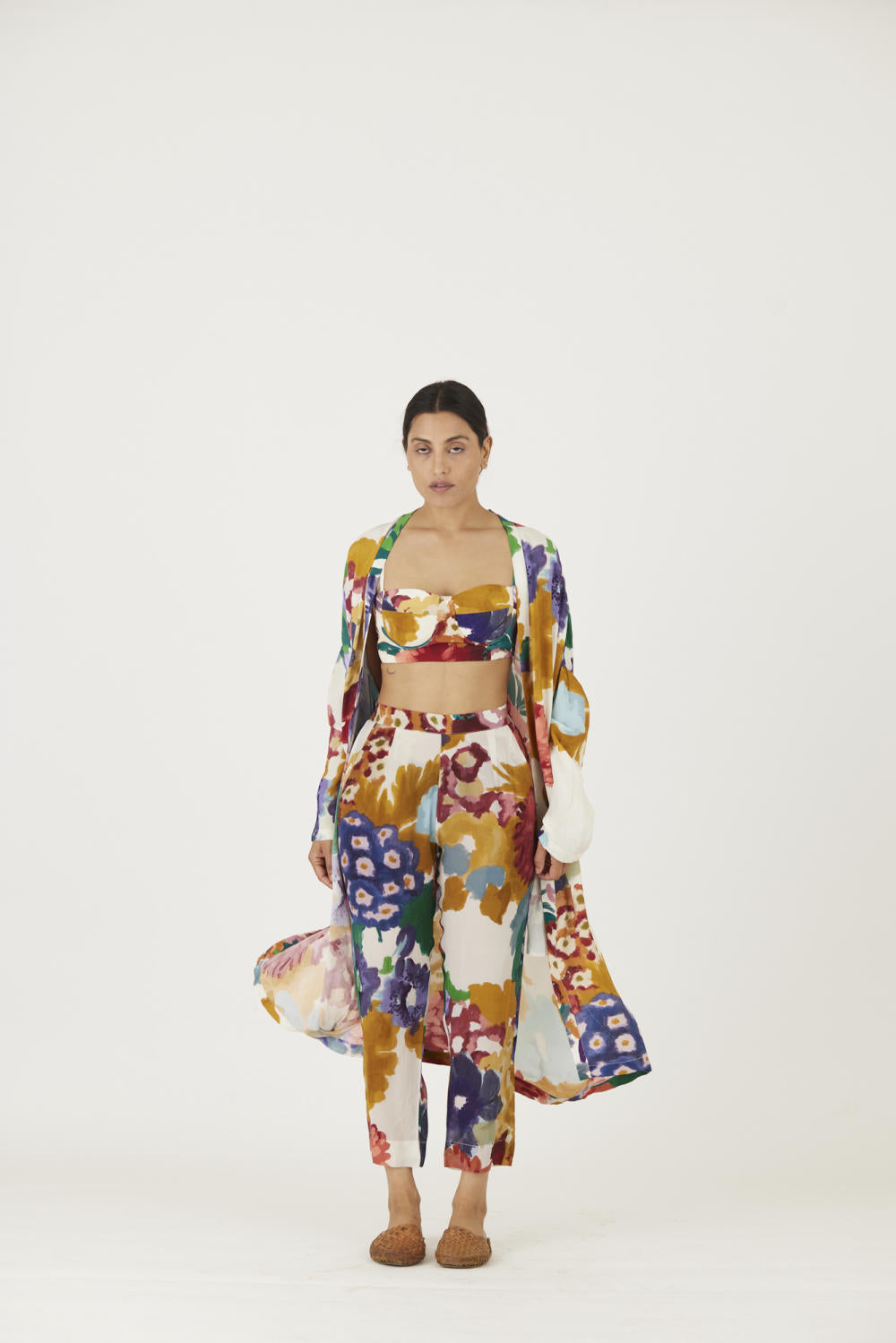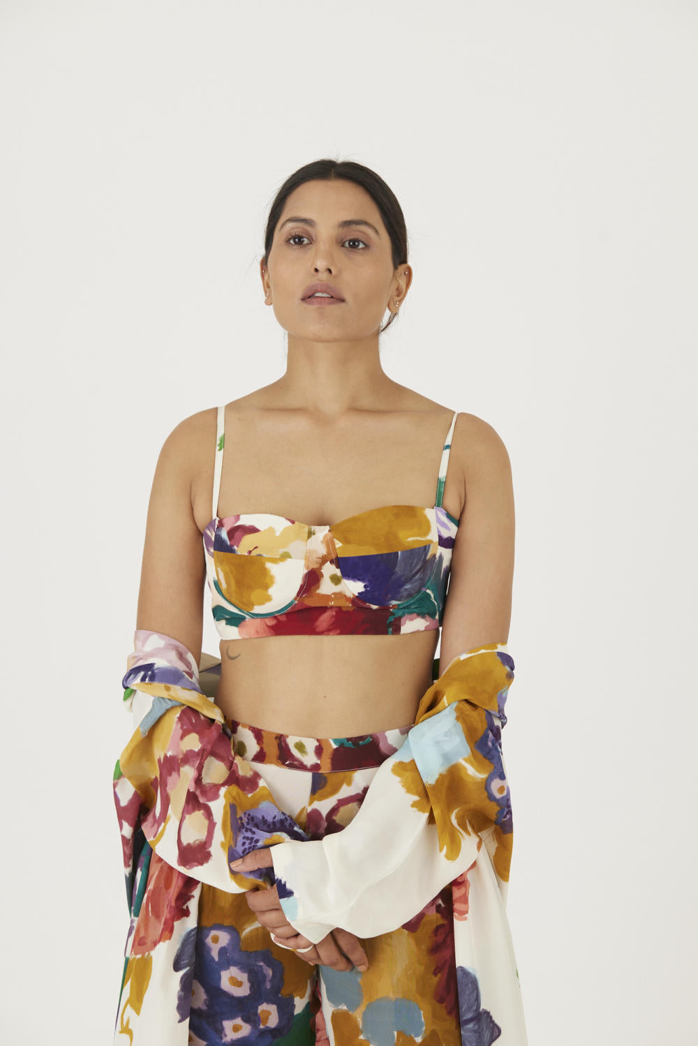 The print features an abundance of roses along with marigolds and jasmines arranged together in a bouquet . The set is crafted in the Farah print carefully printed on crepe. The set includes an oversized cape , a bralette with back elastic and straight pants.