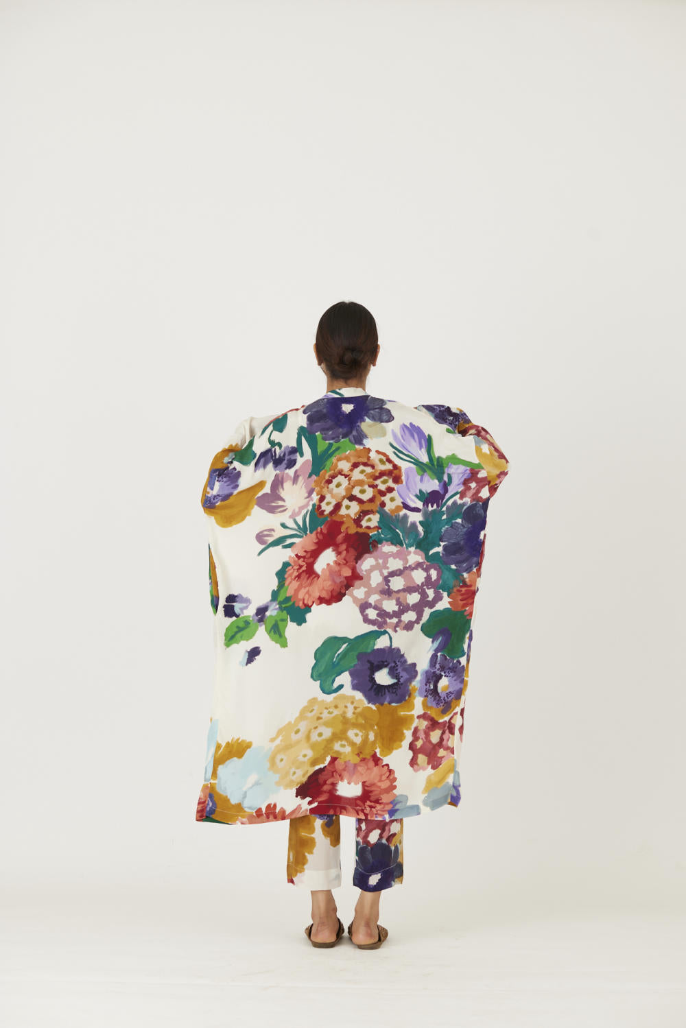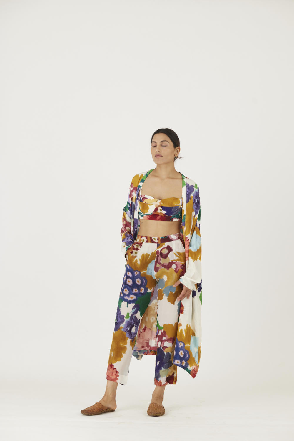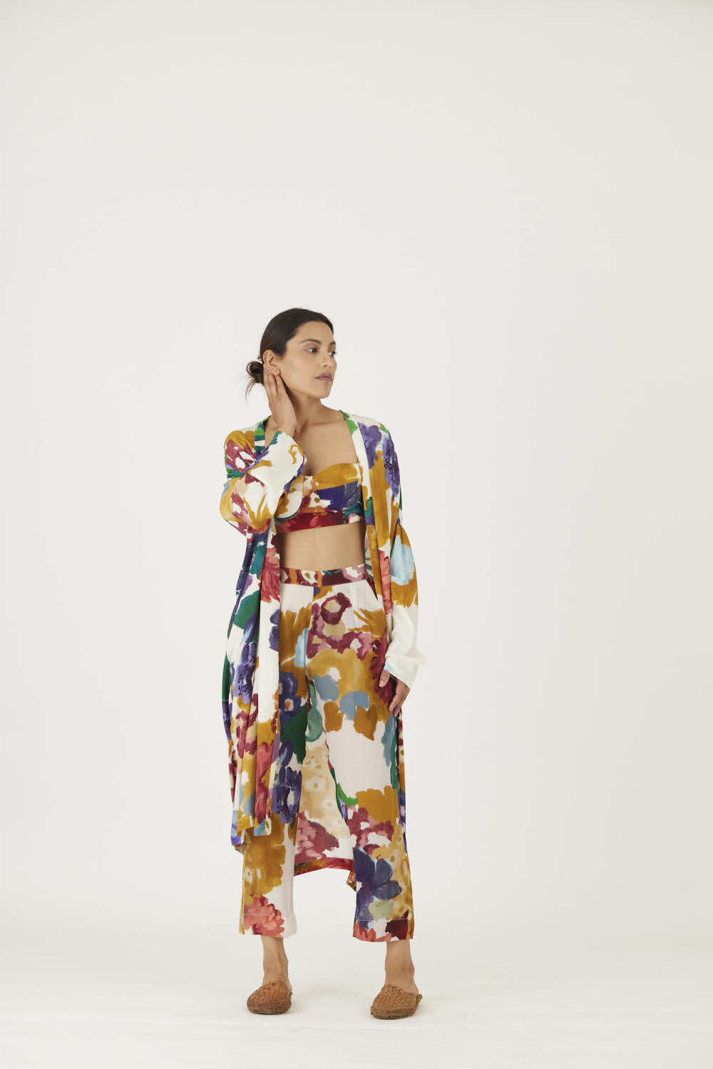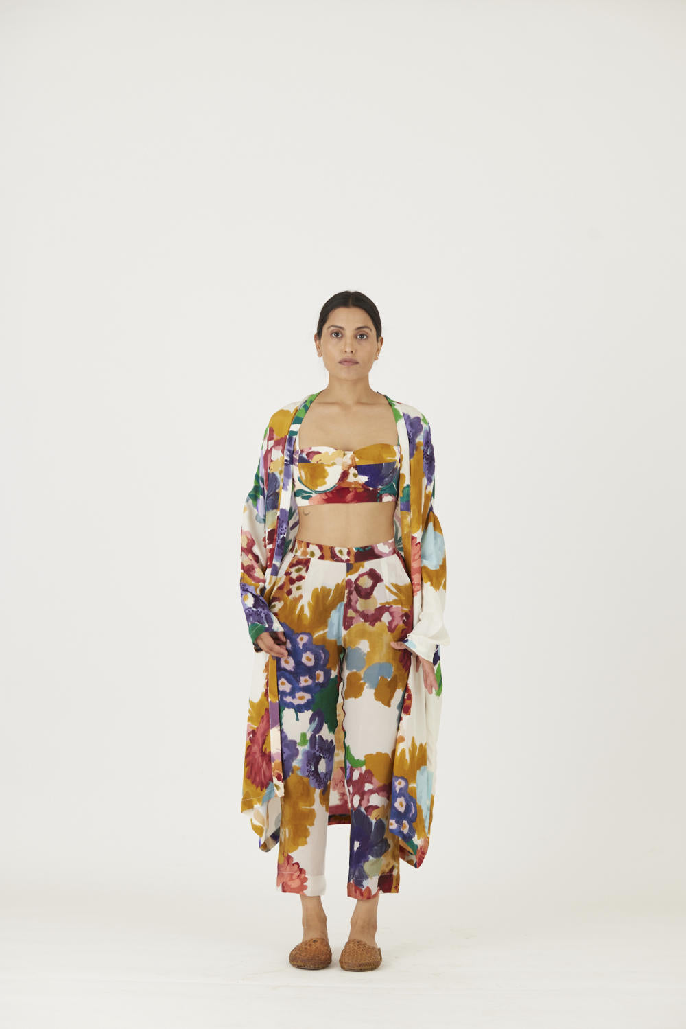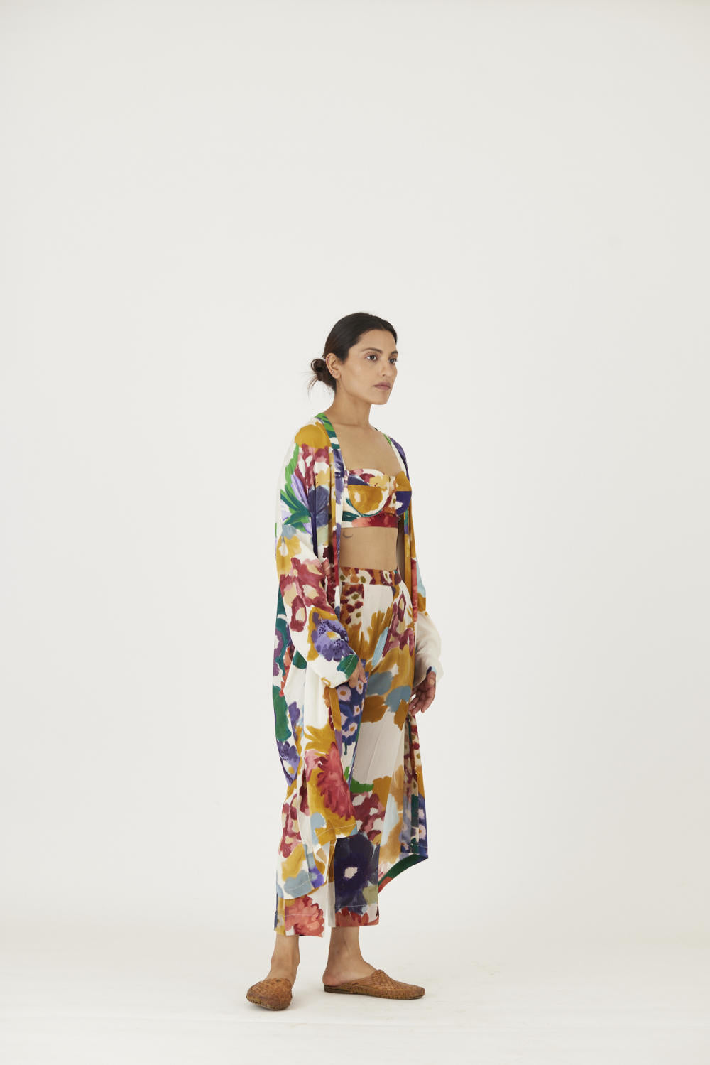 The print features an abundance of roses along with marigolds and jasmines arranged together in a bouquet . The set is crafted in the Farah print carefully printed on crepe. The set includes an oversized cape , a bralette with back elastic and straight pants.