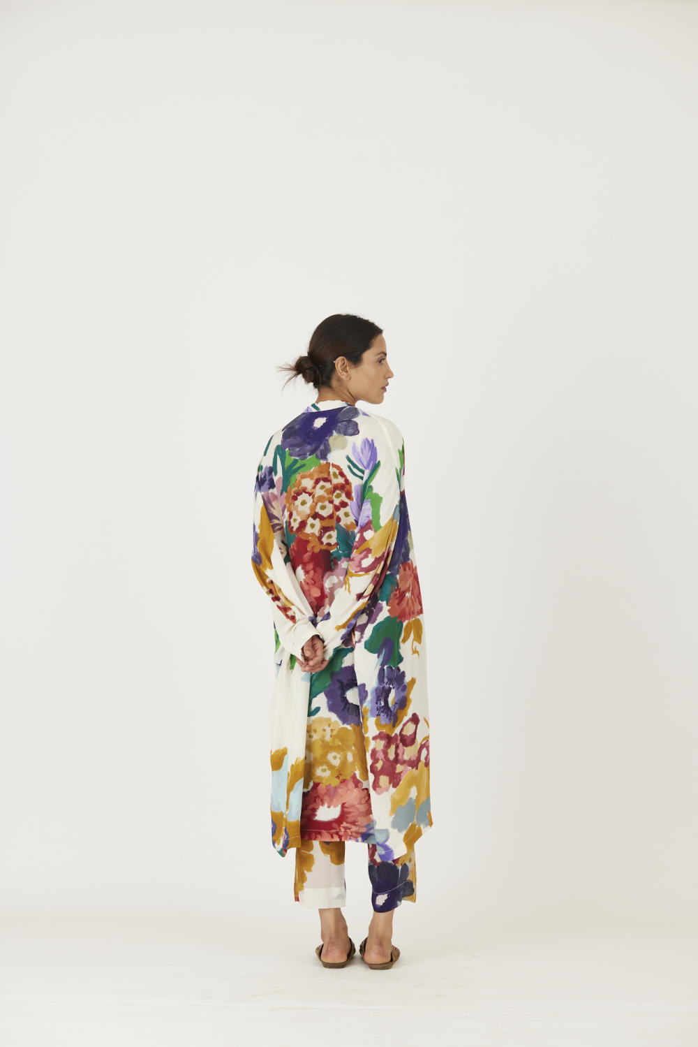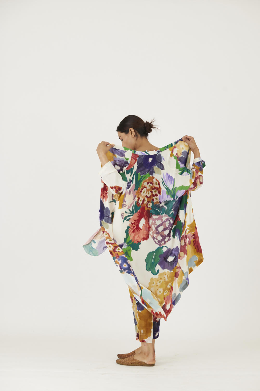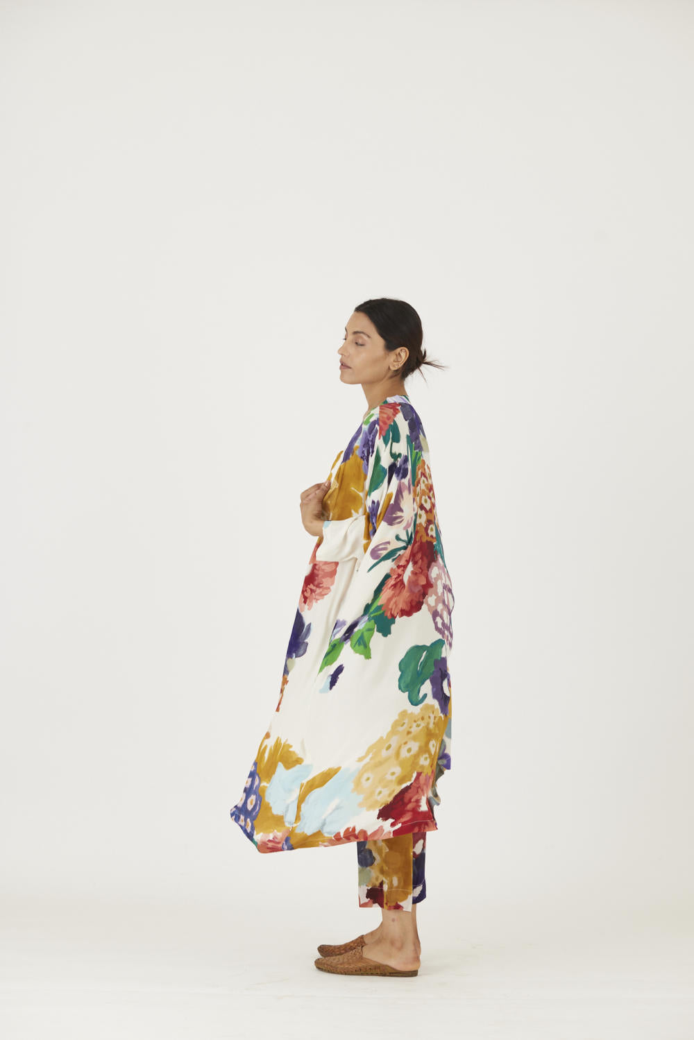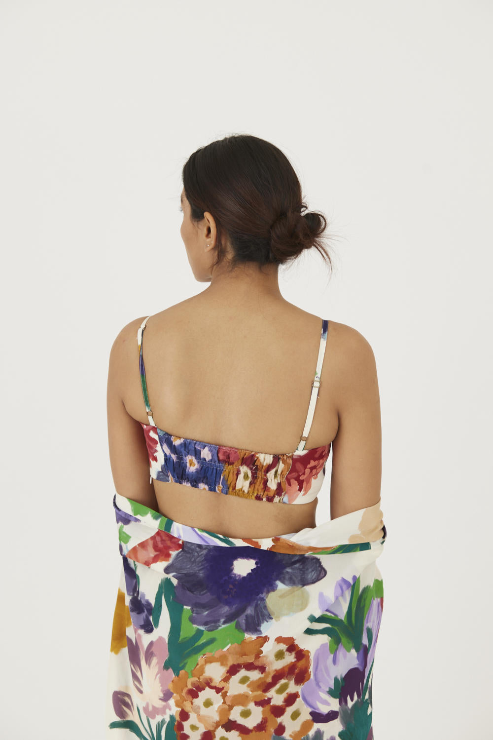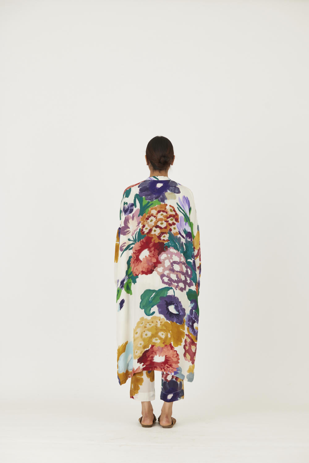 The print features an abundance of roses along with marigolds and jasmines arranged together in a bouquet . The set is crafted in the Farah print carefully printed on crepe. The set includes an oversized cape , a bralette with back elastic and straight pants.